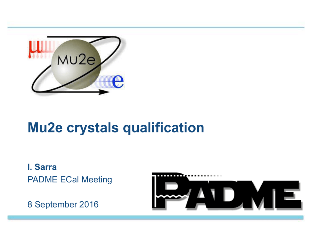 Mu2e crystals qualification I. Sarra PADME ECal Meeting 8 September 2016 Mu2e Calorimeter: state of the art The Calorimeter consists of two disks with 674 CsI 34x34x200 mm3 square crystals: Rinner = 374 mm, Router=660 mm, depth = 10 X0 (200 mm) Each crystal is readout by two large area UV extended SiPM’s (14x20 mm2) Analog FEE is on the SiPM and digital electronics is located in near-by electronics crates Radioactive source and laser system provide absolute calibration and monitoring capability 2 I. Sarra @ PADME ECal Meeting 8 September 2016 Mu2e Calorimeter: state of the art (2) High granularity crystal based calorimeter with: 2 Disks (Anuli) geometry to optimize acceptance for spiraling electrons Crystals with high Light Yield for timing/energy resolution LY(photosensors) > 20 pe/MeV 2 photo-sensors/preamps/crystal for redundancy and reduce MTTF requirement now set to 1 million hours/SiPM Fast signal for Pileup and Timing resolution τ of emission < 40 ns + Fast preamps Crystals and sensors should work in 1 T B-field and in vacuum of 10-4 Torr and: Crystals survive a dose of 100 krad and a neutron fluency of 1012 n/cm2 Photo-sensors survive 20 krad a neutron fluency of 3×1011 n_1MeV/cm2 3 I. Sarra @ PADME ECal Meeting 8 September 2016 Design: Crystals and Sensors choice BaF2 CsI Radiation Length X0 [cm] 2.03 1.86 Light Yield [% NaI(Tl)] 4/36 3.6 0.9/650 30 RMD APD SiPM 220/300 310 Decay Time[ns] Photosensor Wavelength [nm] TSV with SPL SiPMs Undoped CsI 4 Adequate radiation hardness Slightly hygroscopic 30 ns emission time, small slow component. Emits @ 310 nm. Comparable LY of fast component of BaF2. Lower cost (6-8 $/cc) Well know crystal. Mass produced before .. KTeV I. Sarra @ PADME ECal Meeting 8 September 2016 tatistics and LRU Design: meeting the requirements the photo-statistics and LRU LNF Test Beam Energy Resolution [%] 8.5 8 7.5 7 6.5 6 5.5 70 Mu2e Framework Simulation 5 4 4.5 Energy resolution vs Deposited energies 80 90 σ / E < 7% dominated by leakage and beam energy spread 2.382 / 4 0.6658 3.633 ± 0.7244 1.676 ± 0.1423 100 110 Deposited Energy by MC [MeV] MC c2 / ndf Prob a c Data MC Data Comparison Simulation performed as a function of LY and many of other variables CsI+SIPM match the number p.e/MeV seems limited requirements. e statistical uncertainties) Test beam with e- @ BTF, LNF 80 to 130 MeV 3x3 array of 30x30x200 mm3 CsI + MPPC st [ns] LNF Test Beam 0 .3 Orthogonal single crystal Orthogonal all crystals above 10 MeV Cosmics Neighboring crystals @ 50 deg 0 .2 5 Single crystal @ 50 deg Most energetic crystal @ 50 deg 50 deg all crystals above 10 MeV 0 .2 0 .1 5 Good energy ( 7%) and timing ( 110 ps) 16/2/2015 resolution Exp tests Matching EMC requirements 5 I. Sarra @ PADME ECal Meeting 0 .1 0 .0 2 0 .0 3 0 .0 4 0 .0 5 0 .0 6 0 .0 7 0 .0 8 <Energy> [GeV] systematically worst • Cluster technique slightly8 September 2016 (~ 70 ps in quadrature • More evident in the tilted configuration Design: Radiation hardness & cooling Crystals have been tested up to 100 krad and 1012 n/cm2 with 14 MeV neutrons i.e. the doses in the experiment with a safety factor of 3 applied. No major issues/damages observed (LY drop 40% @ 100 krad) Radiation hardness will be part of our QA test procedure Effect of thermal neutrons on Radiation Induced Current being investigated Photosensors have been tested up to 20 krad and 3 x 10 11 n/cm2. No problems with dose With neutrons, sensors are still working but leakage current increases to too high values (a factor ~2000) Cooling photo-sensors to 0 °C is needed. 6 I. Sarra @ PADME ECal Meeting 8 September 2016 Crystals: Quality Control Transmittance of the pure CsI has been much improved from 2014 From left to right: SICCAS (2014 sample), Opto Materials and ISMA CsI crystals D2 lamp and diffusive sphere Spectrometer 7 I. Sarra @ PADME ECal Meeting 8 September 2016 Crystals: Quality Control (2) • To study the light yield and longitudinal uniformity of each crystal, we used a low intensity collimated 22Na source which irradiates them in a region of few mm2; • The source is placed between the crystals and a small tagging system, constituted by a 3×3× 10 mm3 LYSO crystal, readout by a 3×3 mm2 MPPC; • One of the two back-to-back 511 keV photons produced by the source is tagged by this monitor while the second photon is used to calibrate the crystal under test, which is readout by means of a 2” UV extended photomultiplier tube (PMT) from ET Enterprises. • The 8 whole system I. Sarra @ PADME ECal Meeting is inside a light tight black 8 September 2016 box. Crystals: Quality Control (3) • For each crystal, a longitudinal scan is done in eight points, with 2 cm steps, with respect to the readout system. • In the scan, the source and the tag are moved together along the axis of the crystal under test with a manual movement. • A complete longitudinal scan takes about 10 minutes. We take 20000 events/point at 500 Hz. • All crystals are tested wrapped with reflector material (Tyvek). 9 I. Sarra @ PADME ECal Meeting 8 September 2016 Quality Control: Examples • Charge distributions with the source placed in the central position; • LY, defined as: • To evaluate the longitudinal uniformity, LRU, we plot the light yield as function of the distance of the source from the PMT and we fit the number of photoelectrons produced per MeV with a linear function. 10 I. Sarra @ PADME ECal Meeting 8 September 2016 Quality Control: Specifications Angular coefficients are used to evaluate the LRU. Specifications are defined according to samples characterized: Kharkov (Ukraine), Opto Materials (Italy), SICCAS (China) and Saint-Gobain (France); Crystal lateral dimension: ±100 µm, length: ±100 µm. Scintillation properties measured by a bi-alkali PMT with air gap, coupled to the crystal wrapped with two layers of Tyvek paper: Light output (LO): > 100 p.e./MeV with 200 ns integration gate, will be defined as XX% of a candle crystal provided; FW
