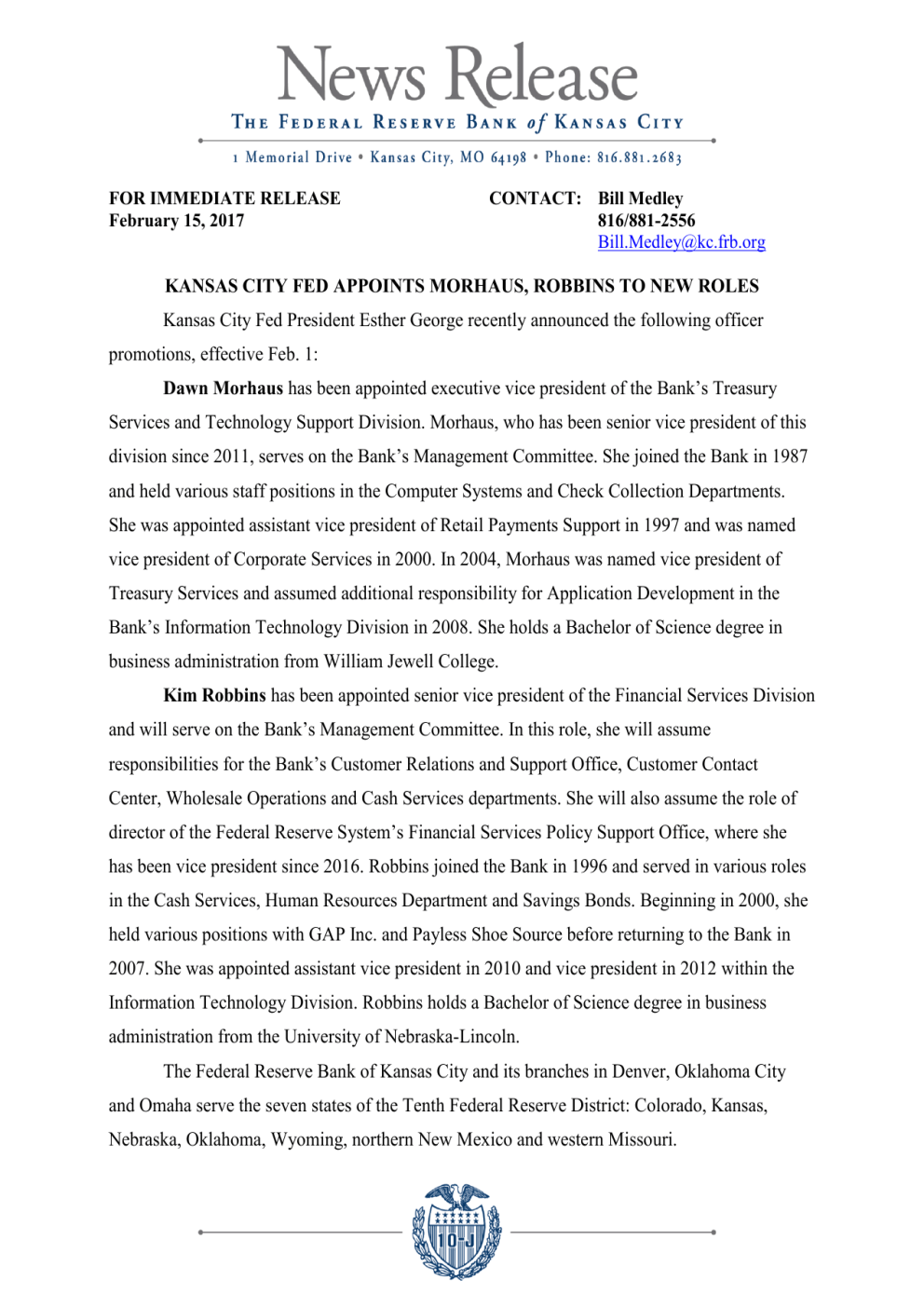 FOR IMMEDIATE RELEASE February 15, 2017 CONTACT: Bill Medley 816/881-2556 [email protected] KANSAS CITY FED APPOINTS MORHAUS, ROBBINS TO NEW ROLES Kansas City Fed President Esther George recently announced the following officer promotions, effective Feb. 1: Dawn Morhaus has been appointed executive vice president of the Bank’s Treasury Services and Technology Support Division. Morhaus, who has been senior vice president of this division since 2011, serves on the Bank’s Management Committee. She joined the Bank in 1987 and held various staff positions in the Computer Systems and Check Collection Departments. She was appointed assistant vice president of Retail Payments Support in 1997 and was named vice president of Corporate Services in 2000. In 2004, Morhaus was named vice president of Treasury Services and assumed additional responsibility for Application Development in the Bank’s Information Technology Division in 2008. She holds a Bachelor of Science degree in business administration from William Jewell College. Kim Robbins has been appointed senior vice president of the Financial Services Division and will serve on the Bank’s Management Committee. In this role, she will assume responsibilities for the Bank’s Customer Relations and Support Office, Customer Contact Center, Wholesale Operations and Cash Services departments. She will also assume the role of director of the Federal Reserve System’s Financial Services Policy Support Office, where she has been vice president since 2016. Robbins joined the Bank in 1996 and served in various roles in the Cash Services, Human Resources Department and Savings Bonds. Beginning in 2000, she held various positions with GAP Inc. and Payless Shoe Source before returning to the Bank in 2007. She was appointed assistant vice president in 2010 and vice president in 2012 within the Information Technology Division. Robbins holds a Bachelor of Science degree in business administration from the University of Nebraska-Lincoln. The Federal Reserve Bank of Kansas City and its branches in Denver, Oklahoma City and Omaha serve the seven states of the Tenth Federal Reserve District: Colorado, Kansas, Nebraska, Oklahoma, Wyoming, northern New Mexico and western Missouri.