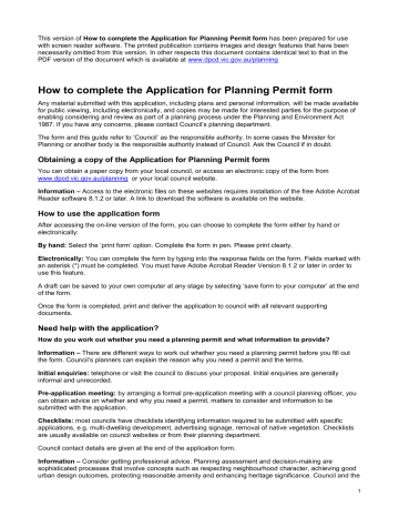 This version of How to complete the Application for Planning Permit form has been prepared for use with screen reader software. The printed publication contains images and design features that have been necessarily omitted from this version. In other respects this document contains identical text to that in the PDF version of the document which is available at www.dpcd.vic.gov.au/planning How to complete the Application for Planning Permit form Any material submitted with this application, including plans and personal information, will be made available for public viewing, including electronically, and copies may be made for interested parties for the purpose of enabling considering and review as part of a planning process under the Planning and Environment Act 1987. If you have any concerns, please contact Council’s planning department. The form and this guide refer to ‘Council’ as the responsible authority. In some cases the Minister for Planning or another body is the responsible authority instead of Council. Ask the Council if in doubt. Obtaining a copy of the Application for Planning Permit form You can obtain a paper copy from your local council, or access an electronic copy of the form from www.dpcd.vic.gov.au/planning or your local council website. Information – Access to the electronic files on these websites requires installation of the free Adobe Acrobat Reader software 8.1.2 or later. A link to download the software is available on the website. How to use the application form After accessing the on-line version of the form, you can choose to complete the form either by hand or electronically: By hand: Select the ‘print form’ option. Complete the form in pen. Please print clearly. Electronically: You can complete the form by typing into the response fields on the form. Fields marked with an asterisk (*) must be completed. You must have Adobe Acrobat Reader Version 8.1.2 or later in order to use this feature. A draft can be saved to your own computer at any stage by selecting ‘save form to your computer’ at the end of the form. Once the form is completed, print and deliver the application to council with all relevant supporting documents. Need help with the application? How do you work out whether you need a planning permit and what information to provide? Information – There are different ways to work out whether you need a planning permit before you fill out the form. Council’s planners can explain the reason why you need a permit and the terms. Initial enquiries: telephone or visit the council to discuss your proposal. Initial enquiries are generally informal and unrecorded. Pre-application meeting: by arranging a formal pre-application meeting with a council planning officer, you can obtain advice on whether and why you need a permit, matters to consider and information to be submitted with the application. Checklists: most councils have checklists identifying information required to be submitted with specific applications, e.g. multi-dwelling development, advertising signage, removal of native vegetation. Checklists are usually available on council websites or from their planning department. Council contact details are given at the end of the application form. Information – Consider getting professional advice. Planning assessment and decision-making are sophisticated processes that involve concepts such as respecting neighbourhood character, achieving good urban design outcomes, protecting reasonable amenity and enhancing heritage significance. Council and the 1 community are looking for proposals that will meet their expectations. Getting the right professional advice at the beginning will help develop your ideas so you meet council’s expectations and your objectives. 1: The Land Address of the land. Complete the Street Address and one of the Formal Land Descriptions. Planning permits relate to the use and development of the land. It is important that accurate, clear and concise details of the land are provided with the application. How is land identified? Land is commonly identified by a street address, but sometimes this alone does not provide an accurate identification of the relevant parcel of land relating to an application. Make sure you also provide the formal land description - the lot and plan number or the crown, section and parish/township details (as applicable) for the subject site. This information is shown on the title. 2: The Proposal Why is it important to describe the proposal correctly? The application requires a description of what you want to do with the land. You must describe how the land will be used or developed as a result of the proposal. It is important that you understand the reasons why you need a permit in order to suitably describe the proposal. By providing an accurate description of the proposal, you will avoid unnecessary delays associated with amending the description at a later date. Information – Planning schemes use specific definitions for different types of use and development. Contact the council planning office at an early stage in preparing your application to ensure that you use the appropriate terminology and provide the required details. How do planning schemes affect proposals? A planning scheme sets out policies and requirements for the use, development and protection of land. There is a planning scheme for every municipality in Victoria. Development of land includes the construction of a building, carrying out works, subdividing land or buildings and displaying signs. Proposals must comply with the planning scheme provisions in accordance with Clause 61.05 of the planning scheme. Provisions may relate to the State Planning Policy Framework (SPPF), the Local Planning Policy Framework (LPPF), zones, overlays, particular and general provisions. You can access the planning scheme by either contacting council’s planning department or by visiting the Planning Schemes Online section of the DPCD websit