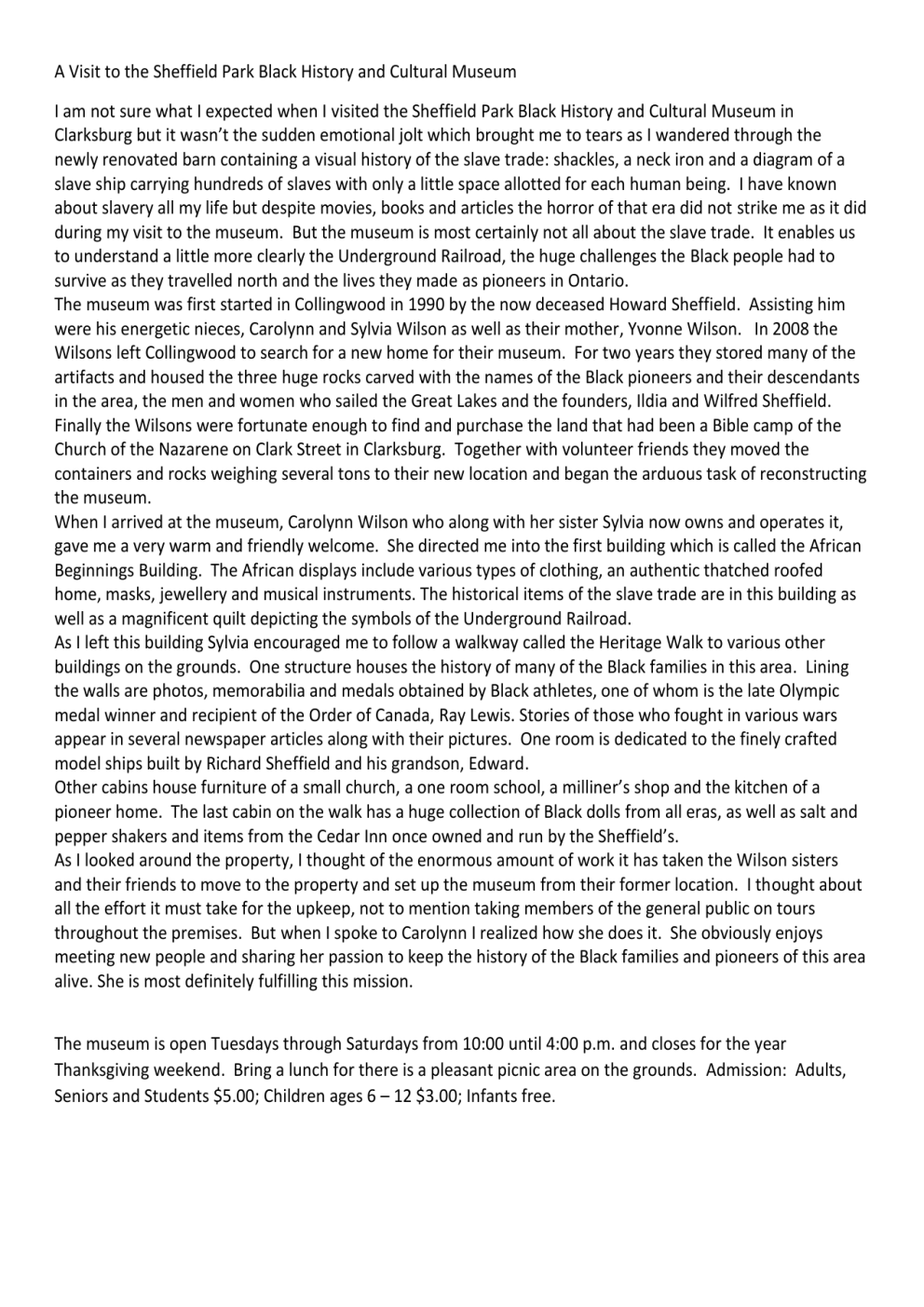A Visit to the Sheffield Park Black History and Cultural Museum I am not sure what I expected when I visited the Sheffield Park Black History and Cultural Museum in Clarksburg but it wasn’t the sudden emotional jolt which brought me to tears as I wandered through the newly renovated barn containing a visual history of the slave trade: shackles, a neck iron and a diagram of a slave ship carrying hundreds of slaves with only a little space allotted for each human being. I have known about slavery all my life but despite movies, books and articles the horror of that era did not strike me as it did during my visit to the museum. But the museum is most certainly not all about the slave trade. It enables us to understand a little more clearly the Underground Railroad, the huge challenges the Black people had to survive as they travelled north and the lives they made as pioneers in Ontario. The museum was first started in Collingwood in 1990 by the now deceased Howard Sheffield. Assisting him were his energetic nieces, Carolynn and Sylvia Wilson as well as their mother, Yvonne Wilson. In 2008 the Wilsons left Collingwood to search for a new home for their museum. For two years they stored many of the artifacts and housed the three huge rocks carved with the names of the Black pioneers and their descendants in the area, the men and women who sailed the Great Lakes and the founders, Ildia and Wilfred Sheffield. Finally the Wilsons were fortunate enough to find and purchase the land that had been a Bible camp of the Church of the Nazarene on Clark Street in Clarksburg. Together with volunteer friends they moved the containers and rocks weighing several tons to their new location and began the arduous task of reconstructing the museum. When I arrived at the museum, Carolynn Wilson who along with her sister Sylvia now owns and operates it, gave me a very warm and friendly welcome. She directed me into the first building which is called the African Beginnings Building. The African displays include various types of clothing, an authentic thatched roofed home, masks, jewellery and musical instruments. The historical items of the slave trade are in this building as well as a magnificent quilt depicting the symbols of the Underground Railroad. As I left this building Sylvia encouraged me to follow a walkway called the Heritage Walk to various other buildings on the grounds. One structure houses the history of many of the Black families in this area. Lining the walls are photos, memorabilia and medals obtained by Black athletes, one of whom is the late Olympic medal winner and recipient of the Order of Canada, Ray Lewis. Stories of those who fought in various wars appear in several newspaper articles along with their pictures. One room is dedicated to the finely crafted model ships built by Richard Sheffield and his grandson, Edward. Other cabins house furniture of a small church, a one room school, a milliner’s shop and the kitchen of a pioneer home. The last cabin on the walk has a huge collection of Black dolls from all eras, as well as salt and pepper shakers and items from the Cedar Inn once owned and run by the Sheffield’s. As I looked around the property, I thought of the enormous amount of work it has taken the Wilson sisters and their friends to move to the property and set up the museum from their former location. I thought about all the effort it must take for the upkeep, not to mention taking members of the general public on tours throughout the premises. But when I spoke to Carolynn I realized how she does it. She obviously enjoys meeting new people and sharing her passion to keep the history of the Black families and pioneers of this area alive. She is most definitely fulfilling this mission. The museum is open Tuesdays through Saturdays from 10:00 until 4:00 p.m. and closes for the year Thanksgiving weekend. Bring a lunch for there is a pleasant picnic area on the grounds. Admission: Adults, Seniors and Students $5.00; Children ages 6 – 12 $3.00; Infants free.