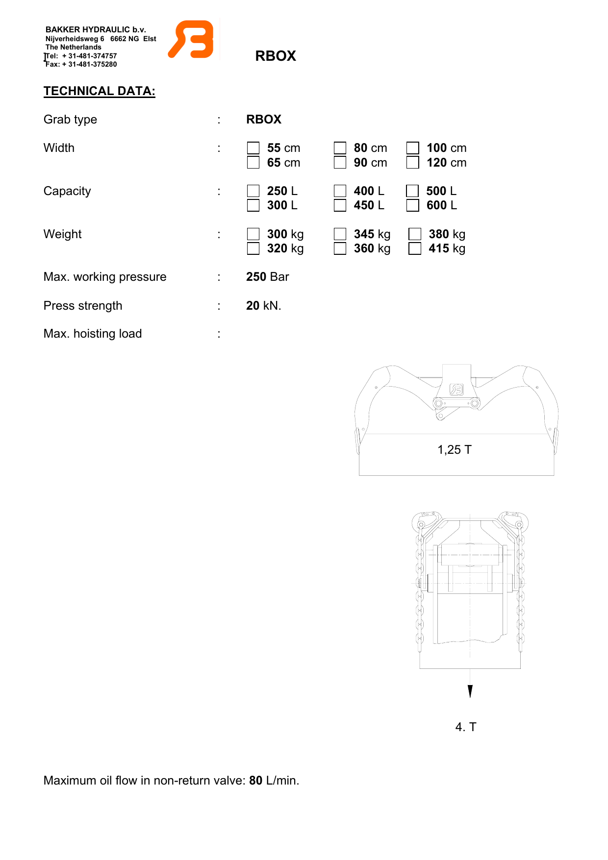 TECHNICAL DATA: Grab type : RBOX Width : 55 cm 80 cm 100 cm