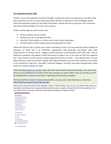 An inspection by the CQC Further to our CQC inspection recently I thought I would write about my experience and offer some tips to practices and for my own learning to share with you to the best of my knowledge, please check the regulatory advice for the latest information. Please feel free to add your own comments and notes and personalise it for your own practice. Firstly I would urge you all to ensure that; All your policies are up to date Premises are up to standard and that Infection Control policy is in place and a recent audit undertaken All staff aware of what maybe asked and expected from them When the CQC do call to inform you of their intention to visit it can be extremely nerve racking for everyone as firstly this is an unfamiliar organisation with generally non-clinical staff, their requirements are broad, recent negative media attention of GP practices after CQC visits, risks of being non-compliant and speed in which they wish to inspect you. In our case we had one inspector but I have heard of some practices being inspected by three of them. I was advised that in future they will have a team of around 5 people with special interests and visit those practices more likely to be classified as ‘high risk’, may add a ‘financial category’ and they may have changed their notice period to 2 weeks instead of 2 days. [TIP] visit http://www.cqc.org.uk/ read a few CQC reports both national and locally, now read a few that are non-compliant to see where they went wrong, very easy to filter, once you do this you will be thinking like an inspector and that is a good key to becoming compliant. [TIP] Use the filter button to choose Doctors/GPs, use your area code otherwise or click here http://www.cqc.org.uk/search/doctors-gps Now on the left hand side of the website, click on ‘CQC checks’ and you can see those that were non complaint and those that required enforcement action as well as those that met all standards. You can search your local area and find many good examples of ‘best practice’. Apart from understanding how the CQC report and judge practices you will find a wealth of information that will help you with new ideas on become compliant and even be commended upon [TIP] Remember it’s not all about policies we had purchased a very expensive CQC compliance software package but didn’t really need it although it gave us a better understanding. CQC are looking to see if staff and clinicians themselves understand the standards required and deliver accordingly and patients generally satisfied with the service by talking to them. Teamwork, transparency and responding to NHS choices are essential. CQC publish a summary on their website that looks like this, aim for those ‘green ticks’, these will be generally be green if you reported ‘no non-compliances’ and be revised accordingly upon inspection together with a summary and report. There are 16 essential CQC standards and you are judged upon 5 of them. I’ve marked those outcomes in red that are most likely to be assessed but the CQC will cover many things in their inspections such as complaints and infection control, premises and medicines. Outcome 1: Respecting and involving people who use services People should be treated with respect, involved in discussions about their care and treatment and able to influence how the service is run. Outcome 2: Consent to care and treatment Before people are given any examination, care, treatment or support, they should be asked if they agree to it. Outcome 4: Care and welfare of people who use services People should get safe and appropriate care that meets their needs and supports their rights. Outcome 5: Meeting nutritional needs Food and drink should meet people’s individual dietary needs. Outcome 6: Cooperating with other providers People should get safe and coordinated care when they move between different services. Outcome 7: Safeguarding people who use services from abuse People should be protected from abuse and staff should respect their human rights. Outcome 8: Cleanliness and infection control People should be cared for in a clean environment and protected from the risk of infection. Outcome 9: Management of medicines People should be given the medicines they need when they need them, and in a safe way. Outcome 10: Safety and suitability of premises People should be cared for in safe and accessible surroundings that support their health and welfare. Outcome 11: Safety, availability and suitability of equipment People should be safe from harm from unsafe or unsuitable equipment. Outcome 12: Requirements relating to workers People should be cared for by staff who are properly qualified and able to do their job. Outcome 13: Staffing There should be enough members of staff to keep people safe and meet their health and welfare needs. Outcome 14: Supporting workers Staff should be properly trained and supervised, and have the chance to develop and improve their skills. Outcome 16: Assessing and monitoring the quality of service provision The service should have quality checking systems to manage risks and assure the health, welfare and safety of people who receive care. Outcome 17: Complaints People should have their complaints listened to and acted on properly. Outcome 21: Records People’s personal records, including medical records, should be accurate and kept safe and confidential. Tuesday Morning – Two Days Before the Inspection The Inspector called me on Tuesday morning at 9am to give us 48 hours notice of his intention to visit on Thursday 9am-5pm, he asked for a number for someone from the PPG (Patient Participation Group). I explained that this date was not convenient and he kindly asked me to give him a call a bit later to confirm but he needed to do the visit by the end of the week, Friday was not a good day for him and so I changed my plans and called half an hour later to confirm Thursday. He sent an email detailing the 5 outcomes he would like to di