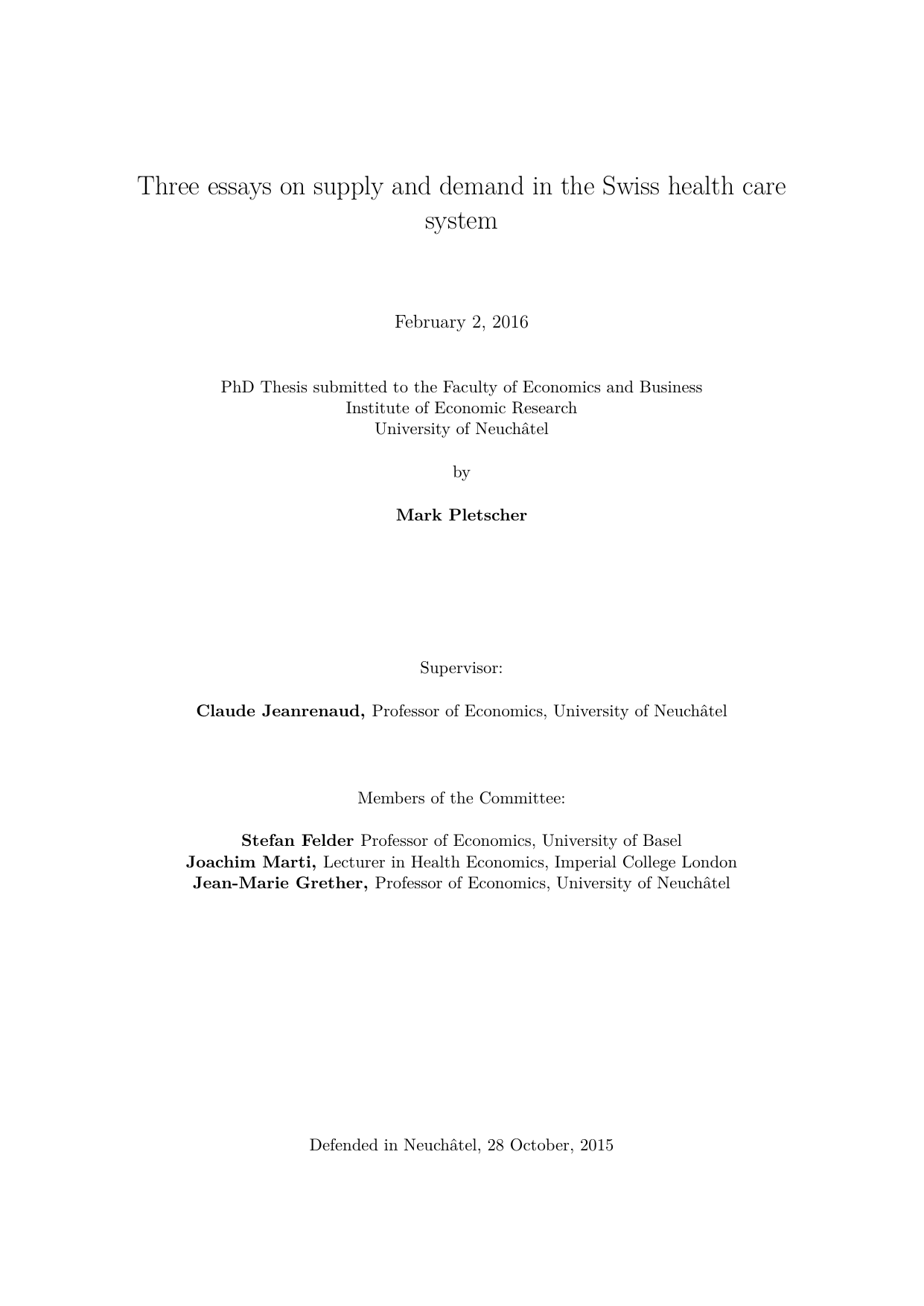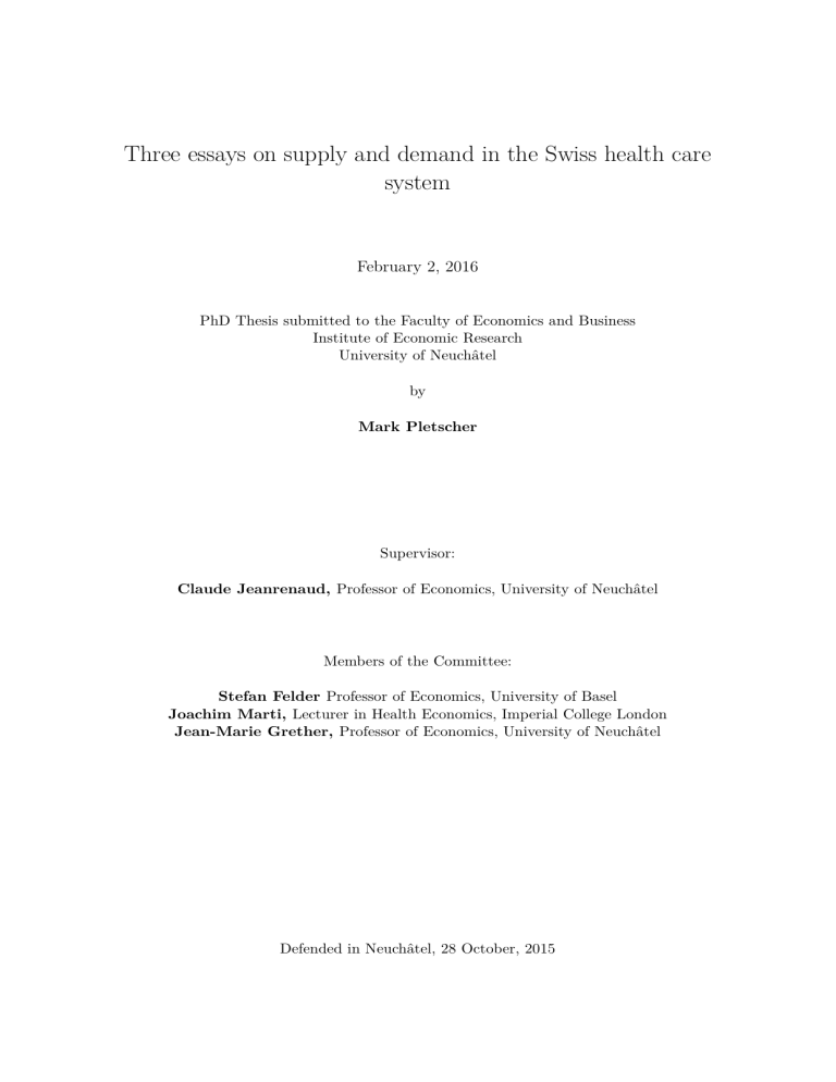 Three essays on supply and demand in the Swiss health care system February 2, 2016 PhD Thesis submitted to the Faculty of Economics and Business Institute of Economic Research University of Neuchâtel by Mark Pletscher Supervisor: Claude Jeanrenaud, Professor of Economics, University of Neuchâtel Members of the Committee: Stefan Felder Professor of Economics, University of Basel Joachim Marti, Lecturer in Health Economics, Imperial College London Jean-Marie Grether, Professor of Economics, University of Neuchâtel Defended in Neuchâtel, 28 October, 2015 • U11 UNIVERSnt OE NEUCHÄTEL IMPRIMATUR POUR LA THESE Three essays on supply and demand in the Swiss health care system Mark PLETSCHER UNIVERSITE OE NEUCHÄTEL FACULTE DES SCIENCES ECONOMIQUES La Faculte des sciences economiques, sur le rapport des membres du jury Prof. Claude Jeanrenaud (directeur de these, Universite de Neuchätel) Prof. Jean-Marie Grether (presidente du jury, Universite de Neuchätel) Prof. Stefan Felder (Universite de Säle) Dr. Joachim Marti (Imperial College, London) Autorise l'impression de Ia presente these. Neuchätel, le 23 novembre 2015 La doyenne Carolina Salva NUo • Telephone : +41 32 718 15 00 • Fax : +41 32 718 15 01 • E-mail : [email protected] • v.ww.unine.ch Executive summary The Swiss health care system is facing various challenges including high health care costs, wasteful and medically harmful over-treatment, regional variation in access to care and a lack of transparency. Because physicians and patients are granted considerable autonomy in medical decision making a thorough understanding of their motives and behaviors is a prerequisite for successful policy. This doctoral thesis investigates physicians’ preferences for financial profit, the role of patients’ levels of information, the effects of prospective payment systems on the provision of care and the effects of public health promotion programs on the demand for preventive care. The first empirical study shows that physicians react to changes in marginal revenue per unit of care which confirms the hypothesis that they have preferences for financial profit. This result implies that physicians provide more care when they are paid retrospectively and that prospective payment systems can be effective measures against over-provision of care. The second study investigates the effects of consumer information on the outcome of the physician patient interaction in outpatient care to identify physician induced demand. The analysis does not show any significant effect of consumer information on the number of outpatient physician visits and thus does not confirm the hypothesis that physicians induce more demand in their less-informed patients. The third study shows that organized screening programs providing health information and free access to mammography have only a modest effect on the demand for mammography when utilization is already high. The empirical results of this thesis suggest that the provision of consumer information or organized screening programs are potentially ineffective policy instruments and that prospective payment systems can be used more widely to control the provision and the costs of medical care in Switzerland. Keywords: Switzerland, health care, physician agency, supplier induced demand, prospective payment, marginal price effect, hospital, psychiatry, length of stay, health literacy, outpatient service utilization, mammography, screening, hospital registry, Swiss health survey, hurdle model, difference-in-difference Acknowledgements Although it has always been my ambition to write a doctoral thesis I am well aware of the fortune to have been given all the opportunities to achieve this goal. With these few lines I want to thank all the people who made this doctoral thesis possible. First and foremost, I want to thank my thesis supervisor Professor Claude Jeanrenaud for being such a great mentor to me. When I was accepted by Prof. Jeanrenaud as an external doctoral student it felt as if a heavy door had been pushed open. But also on the intricate and steep paths behind that door, he always boosted my morale and showed me the right direction when I was stuck. I am extremely grateful for his scientific support, his optimism and his generosity. I also want to thank the members of the thesis committee, Jean-Marie Grether, Stefan Felder and Joachim Marti, for taking the time to read the manuscript and for their valuable feedback. I further want to thank my supervisors at the Winterthur Institute of Health Economics, Simon Wieser and Urs Brügger, for giving me the time to write this thesis and for their material and moral support. While my own assessment of the probability of success only improved gradually they always believed in the success of this venture. The combination of the work on my PhD and the applied research carried out at the institute allowed me to grow not only as a researcher but also as a professional. The International Doctoral Courses in Health Economics and Policy at the Swiss School of Public Health (SSPH+) allowed me to improve my methodological skills and meet great people. I want to thank all the administrative and academic staff as well as the Swiss National Fund for making these courses possible. A strenuous journey in an unknown territory is much more pleasant when it is made together with companions. Lukas Kauer has accompanied me during the entire time of this thesis and, during many intense discussions, gave me valuable advice. In 2013, Lukas introduced me to Per Johansson who invited me to visit the Institute for Evaluation of Labour Market and Education Policy (IFAU) in Uppsala. In this inspiring and productive environment and with the support of Per, I was able to carry out the main study of this thesis. Finally, I want to thank my parents for their love, their unconditional support and for making everything in my life possible. I want to express my love for Susanne and my gratitude fo