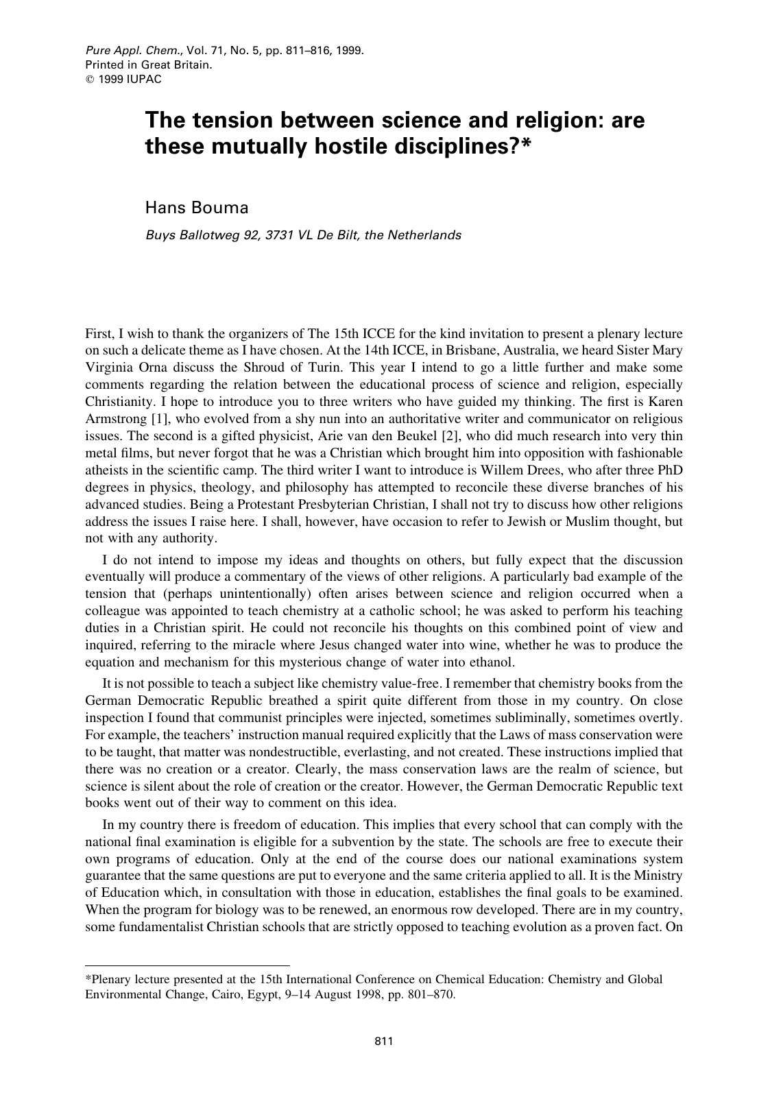 Pure Appl. Chem., Vol. 71, No. 5, pp. 811±816, 1999. Printed in Great Britain. q 1999 IUPAC The tension between science and religion: are these mutually hostile disciplines?* Hans Bouma Buys Ballotweg 92, 3731 VL De Bilt, the Netherlands First, I wish to thank the organizers of The 15th ICCE for the kind invitation to present a plenary lecture on such a delicate theme as I have chosen. At the 14th ICCE, in Brisbane, Australia, we heard Sister Mary Virginia Orna discuss the Shroud of Turin. This year I intend to go a little further and make some comments regarding the relation between the educational process of science and religion, especially Christianity. I hope to introduce you to three writers who have guided my thinking. The ®rst is Karen Armstrong [1], who evolved from a shy nun into an authoritative writer and communicator on religious issues. The second is a gifted physicist, Arie van den Beukel [2], who did much research into very thin metal ®lms, but never forgot that he was a Christian which brought him into opposition with fashionable atheists in the scienti®c camp. The third writer I want to introduce is Willem Drees, who after three PhD degrees in physics, theology, and philosophy has attempted to reconcile these diverse branches of his advanced studies. Being a Protestant Presbyterian Christian, I shall not try to discuss how other religions address the issues I raise here. I shall, however, have occasion to refer to Jewish or Muslim thought, but not with any authority. I do not intend to impose my ideas and thoughts on others, but fully expect that the discussion eventually will produce a commentary of the views of other religions. A particularly bad example of the tension that (perhaps unintentionally) often arises between science and religion occurred when a colleague was appointed to teach chemistry at a catholic school; he was asked to perform his teaching duties in a Christian spirit. He could not reconcile his thoughts on this combined point of view and inquired, referring to the miracle where Jesus changed water into wine, whether he was to produce the equation and mechanism for this mysterious change of water into ethanol. It is not possible to teach a subject like chemistry value-free. I remember that chemistry books from the German Democratic Republic breathed a spirit quite different from those in my country. On close inspection I found that communist principles were injected, sometimes subliminally, sometimes overtly. For example, the teachers' instruction manual required explicitly that the Laws of mass conservation were to be taught, that matter was nondestructible, everlasting, and not created. These instructions implied that there was no creation or a creator. Clearly, the mass conservation laws are the realm of science, but science is silent about the role of creation or the creator. However, the German Democratic Republic text books went out of their way to comment on this idea. In my country there is freedom of education. This implies that every school that can comply with the national ®nal examination is eligible for a subvention by the state. The schools are free to execute their own programs of education. Only at the end of the course does our national examinations system guarantee that the same questions are put to everyone and the same criteria applied to all. It is the Ministry of Education which, in consultation with those in education, establishes the ®nal goals to be examined. When the program for biology was to be renewed, an enormous row developed. There are in my country, some fundamentalist Christian schools that are strictly opposed to teaching evolution as a proven fact. On *Plenary lecture presented at the 15th International Conference on Chemical Education: Chemistry and Global Environmental Change, Cairo, Egypt, 9±14 August 1998, pp. 801±870. 811 812 H. BOUMA the other side, a majority of biologists have not the least objection to evolution being taught. They proposed, on occasion of this review, to include evolution into the achievement goals, which would be obligatory for all pupils writing a ®nal examination in biology as a part of the national examination scheme. The discussions which were sparked by this subject were of questionable character. Still, I think that both parties, the Christians and the biological scientists, were shown to be imbibed with a zeal without really discussing the issues seriously. Evolution is, in fact, a rather uninteresting point and I will not say very much about it. Perhaps just a few details are worthy of discussion. The ®rst is that the press was unanimous in shifting the responsibility on the issue to the Christian right just as they did when dealing with homosexuality and the rights of schools to attend to their own affairs according to their own rules and institutions. Other people, for example orthodox Jews or fundamentalist Muslims, also may have had their problems with the propagation of comparable points of view and I think it is unfair to reproach only Christians for their in¯exibility. A second striking point associated with the propagation of evolution as an idea is the reversal of positions. Just a century ago, science was on the side of the evolutionists; it was the church that, not keeping to the high principles they advocate, attacked the learned adversaries. Today it is just the opposite. The church wants equality for both viewpoints, but it is the scientists who defend their absolute right for their point with no room for deviation in their thoughts. Professor Van den Beukel [3] of Delft University of Technology points out that the Darwinists reproached the creationists because the latter start from a religious standpoint, however, the theory of evolution now is also portrayed as an article of faith. Personally I do not see a real tension between the two views. But what I do see is that a scienti®c point of view has evolved into the equivalent of a religious belief. Evoluti