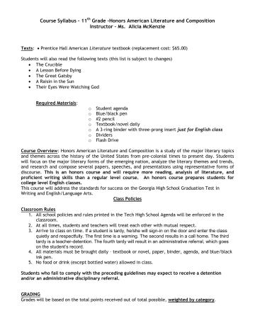 Course Syllabus – 11th Grade -Honors American Literature and Composition Instructor – Ms. Alicia McKenzie Texts: Prentice Hall American Literature textbook (replacement cost: $65.00) Students will also read the following texts (this list is subject to changes) The Crucible A Lesson Before Dying The Great Gatsby A Raisin in the Sun Their Eyes Were Watching God Required Materials: o o o o o o o Student agenda Blue/black pen #2 pencil Textbook/novel daily A 3-ring binder with three-prong insert just for English class Dividers Flash Drive Course Overview: Honors American Literature and Composition is a study of the major literary topics and themes across the history of the United States from pre-colonial times to present day. Students will focus on the major literary forms of the emerging nation, analyze the literary themes and trends, and research and compose several papers, speeches, and presentations using representative forms of discourse. This is an honors course and will require more reading, analysis of literature, and proficient writing skills than a regular level course. An honors course prepares students for college level English classes. This course will address the standards for success on the Georgia High School Graduation Test in Writing and English/Language Arts. Class Policies Classroom Rules 1. All school policies and rules printed in the Tech High School Agenda will be enforced in the classroom. 2. At all times, students and teachers will treat each other with mutual respect. 3. Arrive to class on time. If a student is tardy, he/she will sign-in on the door and enter the class quietly and respectfully. The first time is a warning. The second results in a call home. The third tardy is a teacher-detention. The fourth tardy will result in an administrative referral, which goes on the student’s record. 4. All materials must be brought daily – textbook or novel, paper, binder, agenda, and blue/black ink pen. 5. No food or drink (except bottled water) allowed in class. Students who fail to comply with the preceding guidelines may expect to receive a detention and/or an administrative disciplinary referral. GRADING Grades will be based on the total points received out of total possible, weighted by category. 1st Semester Approximate Category Values: Tests Projects Homework/Classwork Quizzes/Daily work Participation Final Exam 2nd Semester Approximate Category Values: Tests Compositions/Projects Homework/Classwork Participation Quizzes EOCT(Georgia End of Course State Test) 20% 20% 20% 25% 5% 15% 20% 20% 20% 5% 25% 15% In accordance with Atlanta Public Schools policy, grades are assigned as follows: A = 90-100% B = 80-89% C = 70-79% F = 0-69% ABSENCES AND MAKE-UP WORK All work must be made up within three days of an absence with an excused absence note. Failure to do so will result in a grade of “0” for the assignment(s). Any unexcused makeup work will be penalized by 10 points per day. After 5 days, the work will not be accepted. It is the student’s responsibility to meet with the teacher to obtain make-up assignments for his/her class, complete the assignment(s), and turn them in. Students must also arrange a time to make up any excused missed tests and quizzes within 3 days after returning to school except in cases of extended absence. Make-ups must be scheduled with the instructor in advance. Make-up tests and/or quizzes will only be given when appointments are initiated and made by the student. Furthermore, it is not the instructor’s responsibility to remind individuals what they need to make up. Students may meet with the instructor before school or stay after school to make up missed tests and/or quizzes as long as they have made an appointment. ALL MAKE-UP WORK MUST BE COMPLETED TWO WEEKS PRIOR TO THE END OF THE SEMESTER. Late penalties of 10 points per day will apply to papers and other major assignments designated by me (excluding the Jr. Research Project – all due dates are firm on this) THE JUNIOR RESEARCH PAPER WILL NOT BE ACCEPTED LATE UNDER ANY CIRCUMSTANCES. *Teachers will determine when and how students with extenuating circumstances may improve their grades. ENGLISH DEPARTMENT PLAGIARISM STATEMENT Plagiarism is the use of another’s words or ideas and the presentation of them as though they were entirely one’s own. Acts of plagiarism might include, but are not limited to: using words or ideas from a published source without proper documentation using the work of another student (e.g. copying homework, composition, or project) using excessive editing suggestions of another student, teacher, parent, or paid editor. A note about what constitutes “excessive editing.” Students learn to write well by doing just that, writing. Struggling independently through the writing process produces growth (as well as a certain amount of agony), and eventually the student’s own voice. When well-meaning parents, siblings, tutors, or others contribute their ideas, words, phrases, revisions, etc. to students’ writing, student writers miss the opportunity to achieve literary self-reliance. So – what is helping, but is NOT excessive editing? The answer is: questioning and cueing. For example: “Is this word strong enough? Interesting enough? Specific enough?” “Can you think of another word that would fit better?” “Does this sentence seem awkward?” “What exactly do you mean?” “I don’t understand what you are trying to say here; can you say it more clearly?” “This sentence has a powerful verb; can you find one as powerful for that other sentence?” These kinds of questions and statements allow the students to think and write independently. Students should be allowed to find their own voices and to develop their own writing skills. Plagiarism on any project or paper will result in a zero for the assignment and an Honor Code Violation. Unless strictly stipulated by the teacher, collaboration on written work is not acceptable. Students wh