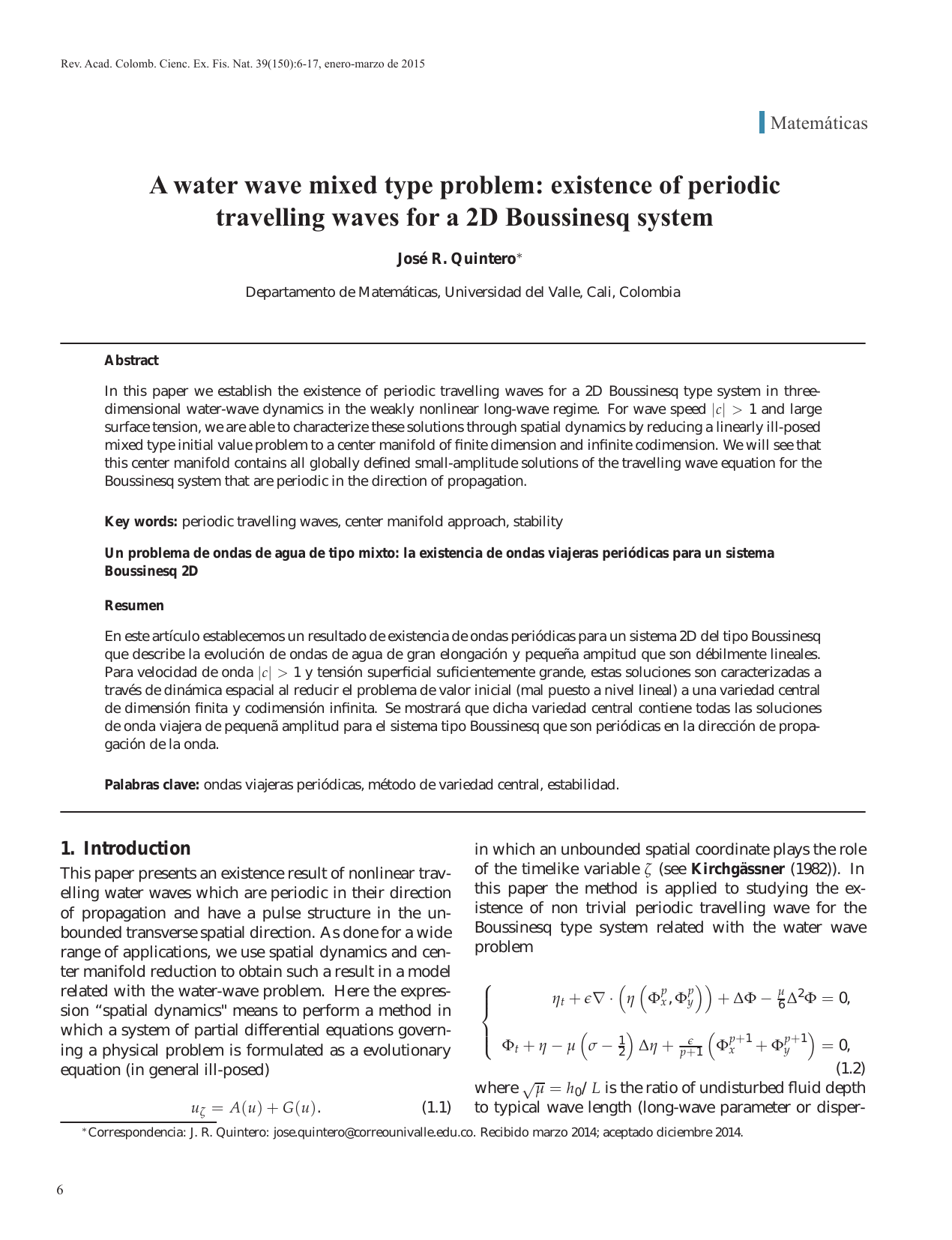Rev. Acad. Colomb. Cienc. 39(150): 6–17, enero–marzo de 2015 Rev. Acad. Colomb. Cienc. Ex. Fis. Nat. 39(150):6-17, enero-marzo de 2015 Matemáticas Matemáticas A water wave mixed type problem: existence of periodic A water wave mixed existencesystem of periodic travelling wavestype for aproblem: 2D Boussinesq travelling waves for a 2D Boussinesq system José R. Quintero∗ Departamento de Matemáticas, Universidad del Valle, Cali, Colombia Abstract In this paper we establish the existence of periodic travelling waves for a 2D Boussinesq type system in threedimensional water-wave dynamics in the weakly nonlinear long-wave regime. For wave speed | c| > 1 and large surface tension, we are able to characterize these solutions through spatial dynamics by reducing a linearly ill-posed mixed type initial value problem to a center manifold of finite dimension and infinite codimension. We will see that this center manifold contains all globally defined small-amplitude solutions of the travelling wave equation for the Boussinesq system that are periodic in the direction of propagation. Key words: periodic travelling waves, center manifold approach, stability Un problema de ondas de agua de tipo mixto: la existencia de ondas viajeras periódicas para un sistema Boussinesq 2D Resumen En este artículo establecemos un resultado de existencia de ondas periódicas para un sistema 2D del tipo Boussinesq que describe la evolución de ondas de agua de gran elongación y pequeña ampitud que son débilmente lineales. Para velocidad de onda | c| > 1 y tensión superficial suficientemente grande, estas soluciones son caracterizadas a través de dinámica espacial al reducir el problema de valor inicial (mal puesto a nivel lineal) a una variedad central de dimensión finita y codimensión infinita. Se mostrará que dicha variedad central contiene todas las soluciones de onda viajera de pequenã amplitud para el sistema tipo Boussinesq que son periódicas en la dirección de propagación de la onda. Palabras clave: ondas viajeras periódicas, método de variedad central, estabilidad. 1. Introduction This paper presents an existence result of nonlinear travelling water waves which are periodic in their direction of propagation and have a pulse structure in the unbounded transverse spatial direction. As done for a wide range of applications, we use spatial dynamics and center manifold reduction to obtain such a result in a model related with the water-wave problem. Here the expression “spatial dynamics" means to perform a method in which a system of partial differential equations governing a physical problem is formulated as a evolutionary equation (in general ill-posed) u ζ = A ( u ) + G ( u ). ∗ Correspondencia: 6 (1.1) in which an unbounded spatial coordinate plays the role of the timelike variable ζ (see Kirchgässner (1982)). In this paper the method is applied to studying the existence of non trivial periodic travelling wave for the Boussinesq type system related with the water wave problem ⎧ ⎪ ⎪ ⎨ � � �� p p + ΔΦ − μ6 Δ2 Φ = 0, ηt + � ∇ · η Φ x , Φ y � � ⎪ ⎪ ⎩ Φt + η − μ σ − 1 Δη + 2 � p +1 � p +1 Φx p +1 + Φy � = 0, (1.2) √ where μ = h0 /L is the ratio of undisturbed fluid depth to typical wave length (long-wave parameter or disper- J. R. Quintero: [email protected]. Recibido marzo 2014; aceptado diciembre 2014. 6 Rev. Acad. Colomb. Cienc. 39(150): 6–17, enero–marzo de 2015 Rev. Acad. Colomb. Cienc. Ex. Fis. Nat. 39(150):6-17, enero-marzo de 2015 A water wave mixed type problem A water wave mixed type problem sion coefficient), and � is the ratio of typical wave amplitude to fluid depth (amplitude parameter or nonlinearity coefficient), σ −1 is the Bond number (associated with the surface tension), Φ is the rescale nondimensional velocity potential on the bottom z = 0, and η is the rescaled free surface elevation. We consider waves which are periodic in a moving frame of reference, so that they are periodic in the variable x − ct, where t denotes the temporal variable. For this physical problem, we have a bounded spacelike coordinates (the vertical direction), which is bounded because the fluid has finite depth, and the coordinate x − ct which is considered bounded because we are looking for periodic wave in this variable. So, since there is not any restriction upon the behavior of the waves in the spatial direction y transverse to their direction of propagation, we are allowed to use it as timelike variable. We apply spatial dynamics to the problem by formulating this as an evolutionary system of the form (1.1) with ζ = y in an infinite-dimensional phase space consisting of periodic functions of x − ct (see Grover & Schneider (2001), Sandstede & Scheel (1999), Sandstede & Scheel (2004), and Haragus-Courcelle & Schneider (1999) for applications to respectively nonlinear wave equations, reaction-diffusion equations, and Taylor-Couette problems, and Quintero & Pego (2002) for periodic nonlinear travelling for the Benney–Luke model). In the case of wave speed |c| > 1 and bond number σ > 12 , the Boussinesq system (1.2) under consideration in this paper has a very close relationship with the Benney–Luke model derived in Quintero & Pego (1999) when a > b and also with the KP-II model (σ > 13 ), in the sense that travelling waves for the Boussinesq system (1.2) can generate travelling waves for the Benney–Luke model and the KP-II model, up to some order. Event tough this fact, in the regime of wave speed |c| > 1 and bond number σ > 12 , the Boussinesq system (1.2) seems to be closer to the linearized system of the exact water wave problem with surface tension (see Grover (2001), Grover & Mielke (2001)) since both models share ill-posed spatial evolution equations with finite-dimensional center manifolds, while for the Benney–Luke model in the same regime and also for the KP-II model there are ill-posed spatia