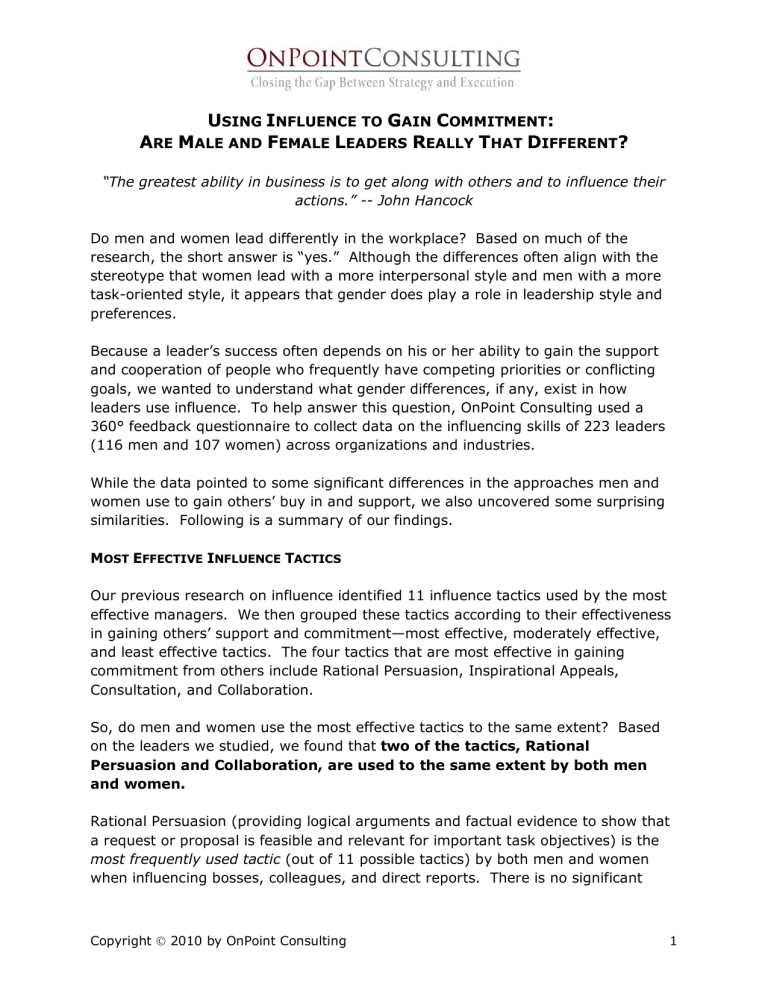 USING INFLUENCE TO GAIN COMMITMENT: ARE MALE AND FEMALE LEADERS REALLY THAT DIFFERENT? “The greatest ability in business is to get along with others and to influence their actions.” -- John Hancock Do men and women lead differently in the workplace? Based on much of the research, the short answer is “yes.” Although the differences often align with the stereotype that women lead with a more interpersonal style and men with a more task-oriented style, it appears that gender does play a role in leadership style and preferences. Because a leader’s success often depends on his or her ability to gain the support and cooperation of people who frequently have competing priorities or conflicting goals, we wanted to understand what gender differences, if any, exist in how leaders use influence. To help answer this question, OnPoint Consulting used a 360° feedback questionnaire to collect data on the influencing skills of 223 leaders (116 men and 107 women) across organizations and industries. While the data pointed to some significant differences in the approaches men and women use to gain others’ buy in and support, we also uncovered some surprising similarities. Following is a summary of our findings. MOST EFFECTIVE INFLUENCE TACTICS Our previous research on influence identified 11 influence tactics used by the most effective managers. We then grouped these tactics according to their effectiveness in gaining others’ support and commitment—most effective, moderately effective, and least effective tactics. The four tactics that are most effective in gaining commitment from others include Rational Persuasion, Inspirational Appeals, Consultation, and Collaboration. So, do men and women use the most effective tactics to the same extent? Based on the leaders we studied, we found that two of the tactics, Rational Persuasion and Collaboration, are used to the same extent by both men and women. Rational Persuasion (providing logical arguments and factual evidence to show that a request or proposal is feasible and relevant for important task objectives) is the most frequently used tactic (out of 11 possible tactics) by both men and women when influencing bosses, colleagues, and direct reports. There is no significant Copyright Ó 2010 by OnPoint Consulting 1 difference between men and women in the use of this tactic. Behaviors such as explaining why a requested task is necessary, explaining why a proposed change or project will be cost effective, and providing evidence that a proposed activity will be successful are used to an equal extent by both men and women. We also found that Collaboration (offering to provide relevant resources or assistance if the person will carry out a request or implement a proposed change) is among the more frequently used tactics by both men and women, and both genders use the behaviors associated with this tactic to the same extent with bosses, colleagues, and direct reports. Examples of these behaviors include: offering to show a person how to do the requested task, offering to help a person do the task, and offering to provide resources needed to do the task. The take away? These findings are somewhat surprising if you believe that men lead with a more task-oriented focus and women with a more interpersonal approach. If this were the case, you’d expect to find that men use Rational Persuasion (a logical, data oriented tactic) more frequently, and women use Collaboration (a more relationship oriented tactic) more frequently. However, our study found no differences between men and women in the use of these two tactics. There are, however, some significant differences between men and women in the use of the other two most effective tactics: Inspirational Appeals and Consultation. Although Inspirational Appeals (appealing to a person’s values, ideals, or emotions or generating enthusiasm) was among the top five most frequently used tactics by both men and women overall (out of a possible 11 tactics), we found that women use Inspirational Appeals significantly more frequently than men with colleagues and direct reports. With bosses, however, men and women use Inspirational Appeals to the same extent. Examples of behaviors associated with Inspirational Appeals include: describing a clear, inspiring vision, or making an inspiring presentation to arouse enthusiasm for a proposed activity or change. While Consultation (asking a person to suggest improvements to a proposal or to help plan a proposed activity or change) was among the more frequently used tactics by both men and women overall, we found that women use Consultation significantly more frequently than men when influencing bosses and direct reports. With colleagues, however, men and women use Consultation to the same extent. Examples of behaviors associated with Consultation include: asking for ideas to improve a preliminary plan or proposal, or encouraging the person to express any concerns about a proposed change or new initiative. Copyright Ó 2010 by OnPoint Consulting 2 The take away? Given that female leaders are often described as having a more participative, inspirational management style than men, you would expect to find that women use Inspirational Appeals and Consultation more often than men across the board. However, we found no difference between men and women in the use of Inspirational Appeals with bosses and no difference in the use of Consultation with colleagues. Inspirational Appeals is generally less effective with bosses than it is with colleagues and direct reports, and it appears that both men and women recognize this. Women, however, better leverage this tactic with their colleagues and direct reports, and men may not be taking full advantage of this tactic. Both men and women often rely on Consultation when influencing colleagues; however, men may be missing opportunities to use this tactic with their direct reports. Consultation is especially appropriate when the influencer ha