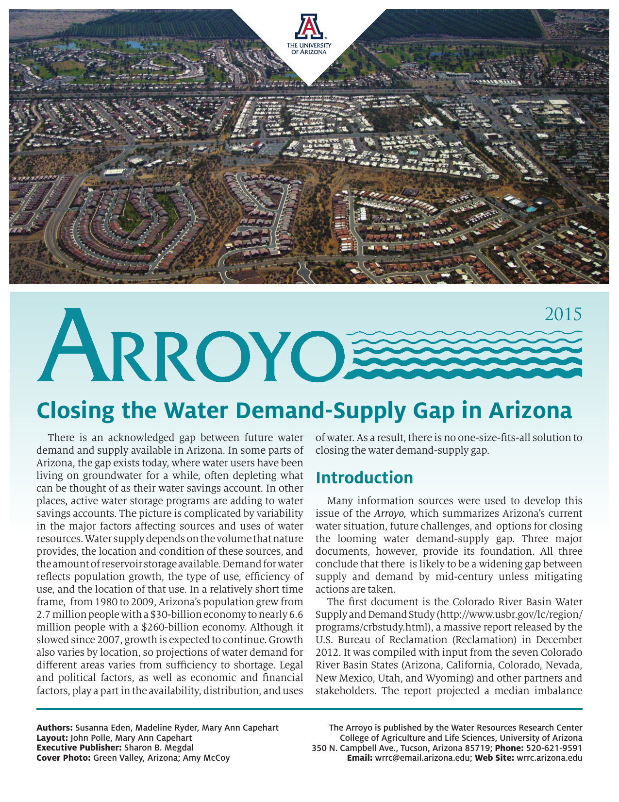 2015 Closing the Water Demand-Supply Gap in Arizona There is an acknowledged gap between future water demand and supply available in Arizona. In some parts of Arizona, the gap exists today, where water users have been living on groundwater for a while, often depleting what can be thought of as their water savings account. In other places, active water storage programs are adding to water savings accounts. The picture is complicated by variability in the major factors affecting sources and uses of water resources. Water supply depends on the volume that nature provides, the location and condition of these sources, and the amount of reservoir storage available. Demand for water reflects population growth, the type of use, efficiency of use, and the location of that use. In a relatively short time frame, from 1980 to 2009, Arizona’s population grew from 2.7 million people with a $30-billion economy to nearly 6.6 million people with a $260-billion economy. Although it slowed since 2007, growth is expected to continue. Growth also varies by location, so projections of water demand for different areas varies from sufficiency to shortage. Legal and political factors, as well as economic and financial factors, play a part in the availability, distribution, and uses Authors: Susanna Eden, Madeline Ryder, Mary Ann Capehart Layout: John Polle, Mary Ann Capehart Executive Publisher: Sharon B. Megdal Cover Photo: Green Valley, Arizona; Amy McCoy of water. As a result, there is no one-size-fits-all solution to closing the water demand-supply gap. Introduction Many information sources were used to develop this issue of the Arroyo, which summarizes Arizona’s current water situation, future challenges, and options for closing the looming water demand-supply gap. Three major documents, however, provide its foundation. All three conclude that there is likely to be a widening gap between supply and demand by mid-century unless mitigating actions are taken. The first document is the Colorado River Basin Water Supply and Demand Study (http://www.usbr.gov/lc/region/ programs/crbstudy.html), a massive report released by the U.S. Bureau of Reclamation (Reclamation) in December 2012. It was compiled with input from the seven Colorado River Basin States (Arizona, California, Colorado, Nevada, New Mexico, Utah, and Wyoming) and other partners and stakeholders. The report projected a median imbalance The Arroyo is published by the Water Resources Research Center College of Agriculture and Life Sciences, University of Arizona 350 N. Campbell Ave., Tucson, Arizona 85719; Phone: 520-621-9591 Email: [email protected]; Web Site: wrrc.arizona.edu of 3.2 million acre-feet (MAF) of water by the year 2060 for the Colorado River Basin and adjacent areas that use Colorado River water. It acknowledged that water demand had already surpassed the average annual Colorado River supply and that continued drought and climate change are likely to have additional impacts on the Colorado River supply. With the release of the report, three followup workgroups were formed to carry out what was named the Moving Forward process. One focused on agricultural conservation, productivity, and water transfers; a second on municipal and industrial conservation and reuse; and a third on environmental and recreational flows (including hydropower). The workgroups were tasked with evaluating and quantifying current trends and potential future programs and identifying actions that address projected supply and demand imbalances. Composed of a diversity of stakeholders, these collaborative efforts resulted in the Moving Forward Phase 1 Report released by Reclamation in the spring of 2015. The report presents an extensive list of recommendations, highlighting the varied options that exist. For the Arizona picture, the second document relied upon is the final report completed by the Water Resource Development Commission (WRDC) (http://www.azwater. gov/AzDWR/WaterManagement/WRDC_HB2661/ Meetings_Schedule.htm). The development of this report, released in 2010, was a major undertaking for Arizona with input from multiple committees. The Commission was formed by the Arizona Legislature to study issues related to water sustainability. The Commission found that developed water supplies in Arizona were estimated at 6.5 to 6.8 MAF per year in 2009. Developed supplies include groundwater, surface water, and reclaimed water for which infrastructure for production and delivery is in place. Undeveloped groundwater and reclaimed water supplies, for which infrastructure is needed were considered additional water sources. From a demand perspective, the WRDC reported total statewide demand projections in 2035 between 8.1 MAF and 8.6 MAF. Total demand projected for 2060 by the WRDC ranged from 8.6 MAF to 9.1 MAF. Unless additional supplies are developed and more stringent conservation measures are implemented, this demand could result in a statewide projected demandsupply gap somewhere between 1.8 MAF and 2.6 MAF in 2060. The third foundational document, which was prepared by the Arizona Department of Water Resources (ADWR) and released in early 2014, is Arizona’s Next Century: A Strategic Vision for Water Supply Sustainability (Strategic Vision) (http://www.azwater.gov/AzDWR/Arizonas_Strategic_ Vision/). The Strategic Vision drew on the Reclamation and WRDC reports in addition to ADWR’s internal informational resources. It concluded that over the next 20 to 100 years, Arizona will need to identify and develop an additional 0.9 to 3.2 MAF of water supplies to meet its projected demands. The somewhat different gap projections reflect different time scales and supply definitions. ADWR reported that 2 Arroyo 2015 there are 7.7 MAF per year of water supplies currently developed or readily available in Arizona. These supplies include already developed groundwater, diversions from in-state rivers, reclaimed water, and Colorado River water from the main stem, either direc