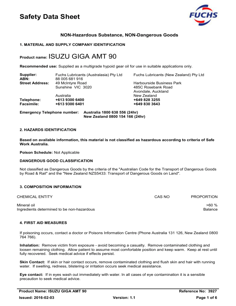 Safety Data Sheet NON-Hazardous Substance, NON-Dangerous Goods 1. MATERIAL AND SUPPLY COMPANY IDENTIFICATION Product name: ISUZU GIGA AMT 90 Recommended use: Supplied as a multigrade hypoid gear oil for use in suitable applications only. Supplier: ABN: Street Address: Telephone: Facsimile: Fuchs Lubricants (Australasia) Pty Ltd 88 005 681 916 49 McIntyre Road Sunshine VIC 3020 Australia +613 9300 6400 +613 9300 6401 Emergency Telephone number: Fuchs Lubricants (New Zealand) Pty Ltd Harbourside Business Park 485C Rosebank Road Avondale, Auckland New Zealand +649 828 3255 +649 830 3643 Australia 1800 638 556 (24hr) New Zealand 0800 154 166 (24hr) 2. HAZARDS IDENTIFICATION Based on available information, this material is not classified as hazardous according to criteria of Safe Work Australia. Poison Schedule: Not Applicable DANGEROUS GOOD CLASSIFICATION Not classified as Dangerous Goods by the criteria of the "Australian Code for the Transport of Dangerous Goods by Road & Rail" and the "New Zealand NZS5433: Transport of Dangerous Goods on Land". 3. COMPOSITION INFORMATION CHEMICAL ENTITY CAS NO Mineral oil Ingredients determined to be non-hazardous PROPORTION >60 % Balance 4. FIRST AID MEASURES If poisoning occurs, contact a doctor or Poisons Information Centre (Phone Australia 131 126, New Zealand 0800 764 766). Inhalation: Remove victim from exposure - avoid becoming a casualty. Remove contaminated clothing and loosen remaining clothing. Allow patient to assume most comfortable position and keep warm. Keep at rest until fully recovered. Seek medical advice if effects persist. Skin Contact: If skin or hair contact occurs, remove contaminated clothing and flush skin and hair with running water. If swelling, redness, blistering or irritation occurs seek medical assistance. Eye contact: If in eyes wash out immediately with water. In all cases of eye contamination it is a sensible precaution to seek medical advice. Product Name: ISUZU GIGA AMT 90 Issued: 2016-02-03 Reference No: 3927 Version: 1.1 Page 1 of 6 Safety Data Sheet Ingestion: Rinse mouth with water. If swallowed, do NOT induce vomiting. Give a glass of water to drink. Never give anything by the mouth to an unconscious patient. If vomiting occurs give further water. Seek medical advice. Notes to physician: Treat symptomatically. 5. FIRE FIGHTING MEASURES Hazchem Code: Not applicable. Suitable extinguishing media: If material is involved in a fire use water fog (or if unavailable fine water spray), alcohol resistant foam, standard foam, dry agent (carbon dioxide, dry chemical powder). Specific hazards: Combustible material. Fire fighting further advice: On burning or decomposing may emit toxic fumes. Fire fighters to wear selfcontained breathing apparatus and suitable protective clothing if risk of exposure to vapour or products of combustion or decomposition. 6. ACCIDENTAL RELEASE MEASURES SMALL SPILLS Wear protective equipment to prevent skin and eye contamination. Avoid inhalation of vapours or dust. Wipe up with absorbent (clean rag or paper towels). Collect and seal in properly labelled containers or drums for disposal. LARGE SPILLS Clear area of all unprotected personnel. Slippery when spilt. Avoid accidents, clean up immediately. Wear protective equipment to prevent skin and eye contamination and the inhalation of vapours. Work up wind or increase ventilation. Contain - prevent run off into drains and waterways. Use absorbent (soil, sand or other inert material). Collect and seal in properly labelled containers or drums for disposal. If contamination of crops, sewers or waterways has occurred advise local emergency services. Dangerous Goods – Initial Emergency Response Guide No: Not applicable 7. HANDLING AND STORAGE Handling: Avoid eye contact and repeated or prolonged skin contact. Avoid inhalation of vapour, mist or aerosols. Storage: Store in a cool, dry, well-ventilated place and out of direct sunlight. Store away from foodstuffs. Store away from incompatible materials described in Section 10. Store away from sources of heat and/or ignition. Keep container standing upright. Keep containers closed when not in use - check regularly for leaks. 8. EXPOSURE CONTROLS / PERSONAL PROTECTION National occupational exposure limits: ppm Oil mist, refined mineral TWA mg/m3 - 5 ppm - STEL mg/m3 - NOTICES - As published by Safe Work Australia. TWA - The time-weighted average airborne concentration over an eight-hour working day, for a five-day working Product Name: ISUZU GIGA AMT 90 Issued: 2016-02-03 Reference No: 3927 Version: 1.1 Page 2 of 6 Safety Data Sheet week over an entire working life. STEL (Short Term Exposure Limit) - the average airborne concentration over a 15 minute period which should not be exceeded at any time during a normal eight-hour workday. These Exposure Standards are guides to be used in the control of occupational health hazards. All atmospheric contamination should be kept too as low a level as is workable. These exposure standards should not be used as fine dividing lines between safe and dangerous concentrations of chemicals. They are not a measure of relative toxicity. If the directions for use on the product label are followed, exposure of individuals using the product should not exceed the above standard. The standard was created for workers who are routinely, potentially exposed during product manufacture. Biological Limit Values: As per the "National Model Regulations for the Control of Workplace Hazardous Substances (Safe Work Australia)" the ingredients in this material do not have a Biological Limit Allocated. Engineering Measures: Ensure ventilation is adequate to maintain air concentrations below Exposure Standards. Use only in well ventilated areas. Use with local exhaust ventilation or while wearing appropriate respirator. Personal Protection Equipment: SAFETY SHOES, OVERALLS, GLOVES, SAFETY GLASSES. Wear safety shoes, overalls, gloves, safety glasses. Available information suggests that gloves