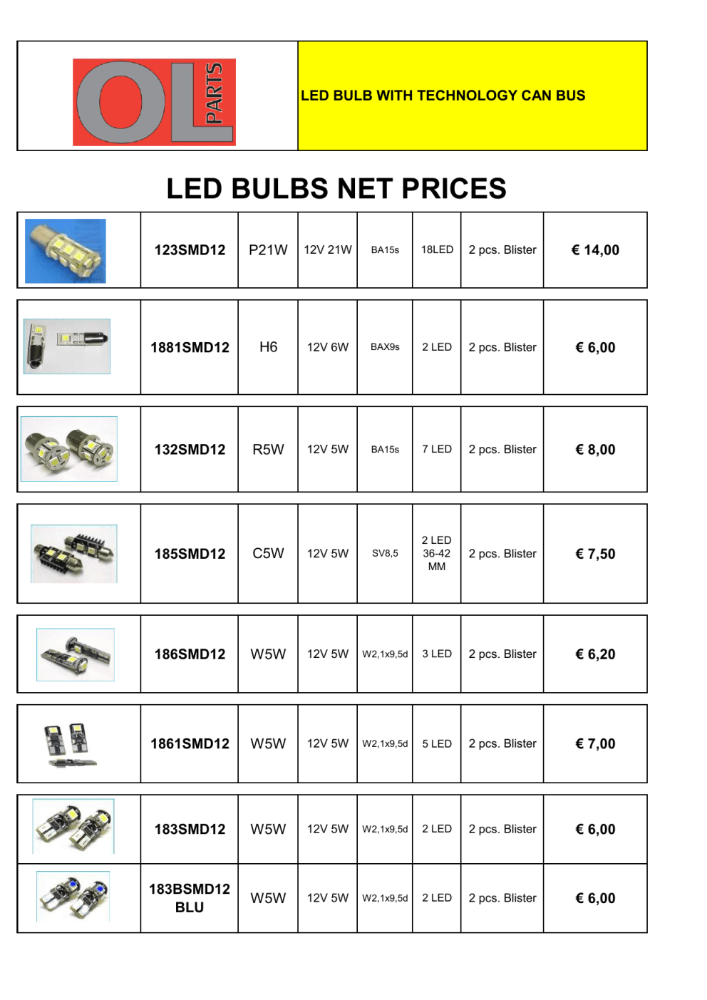 LED BULB WITH TECHNOLOGY CAN BUS LED BULBS NET PRICES 123SMD12 P21W 12V 21W BA15s 18LED 2 pcs. Blister € 14,00 1881SMD12 H6 12V 6W BAX9s 2 LED 2 pcs. Blister € 6,00 132SMD12 R5W 12V 5W BA15s 7 LED 2 pcs. Blister € 8,00 185SMD12 C5W 12V 5W SV8,5 2 LED 36-42 MM 2 pcs. Blister € 7,50 186SMD12 W5W 12V 5W W2,1x9,5d 3 LED 2 pcs. Blister € 6,20 1861SMD12 W5W 12V 5W W2,1x9,5d 5 LED 2 pcs. Blister € 7,00 183SMD12 W5W 12V 5W W2,1x9,5d 2 LED 2 pcs. Blister € 6,00 183BSMD12 BLU W5W 12V 5W W2,1x9,5d 2 LED 2 pcs. Blister € 6,00 253SMD24 P21W 24V 21W BA15s 68 LED 2 pcs. Blister € 16,00 260SMD24 W5W 24V 5W W2,1x9,5d 5 LED 2 pcs. Blister € 6,00 251SMD24 SILURO 24V 5W SV8,5 9 LED 36 MM 2 pcs. Blister € 6,00 252SMD24 SILURO 24V 5W SV8,5 6LED 42 MM 2 pcs. Blister € 6,00 5 MT. LED COIL TEL 011 6474394 FAX 011 6474395 3528DCW12 5 MT.LED WHITE COIL 12V € 25,00 3528DR12 5 MT. LED RED COIL 12V € 25,00 3528DCW24 5 MT.LED WHITE COIL 24V € 26,00 3528DR24 5 MT.LED RED COIL 24V € 26,00 3528GCW24 5 MT.LED WHITE COIL WATERPROOF WATER RESISTANT 24V € 33,00 3528GR24 5 MT. LED RED COIL WATERPROOF WATER RESISTANT 24V € 33,00 Email: [email protected]