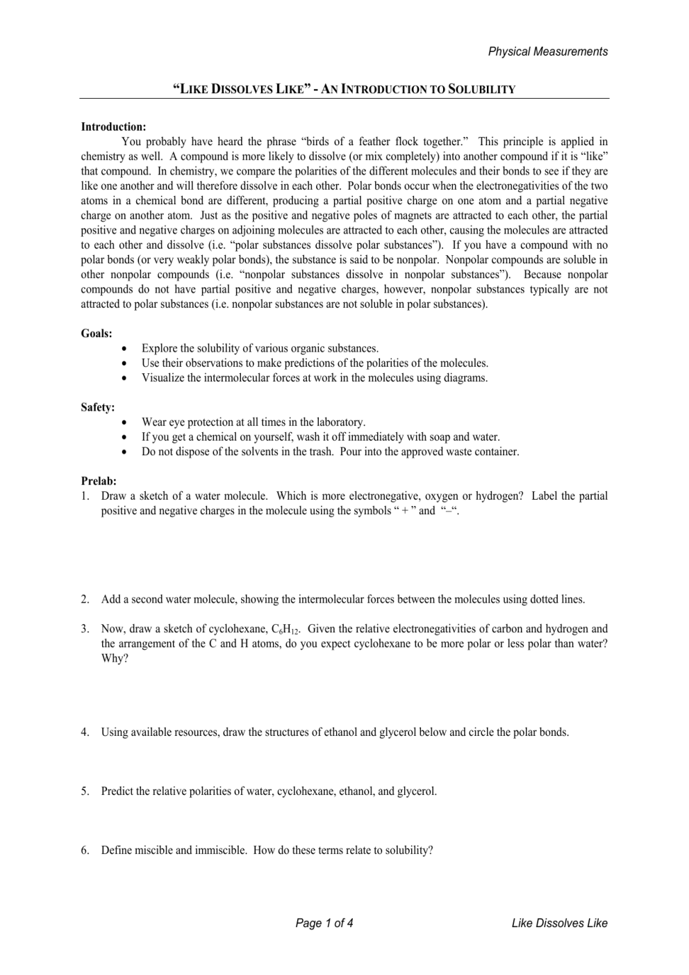 Physical Measurements Page 1 of 4 Like Dissolves Like Introduction