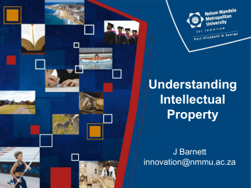 Understanding Intellectual Property J Barnett [email protected] Acknowledgements Slides drawn from material I developed for other courses e.g. SARIMA Basics of Technology Transfer Office Management and NIPMO’s IP Wise™ course. SARIMA • Southern African Research and Innovation Management Association NIPMO • National Intellectual Property Management Office Outline Commercialisation examples Introduction to Intellectual Property IP Ownership Patents • Patenting process Copyrights Commercialisation Commercialisation examples Commercialised: Longlife roses and foliage (Chemistry) Chemical preservation of flowers • • Flowers and foliage last one year Patented Commercialisation • • • Entrepreneur worked “at risk” for 2 years NMMU assigned patents to company in exchange for shares in the company Early stage technology – many issues Venture Capital funding from Industrial Development Corporation Status • • • Factory in Johannesburg; employs 30 staff, mostly previously unskilled Sales good – potentially more than $2M per year from export orders Supply issues – moving bulk of production to Kenya Commercialised: Zinc oxide replacer (Chemistry) Replacement of zinc oxide in rubber • • • Three inventions by student during Doctoral studies National phase patents granted after PCT Fourth patent application filed Commercialisation • • • Student started company and sold shares to raise money Started too early! NMMU assigned patents to company in exchange for shares in the company Seed funding provided by university Current status • • In NMMU incubator NMMU staff helping get company running again • • Governance issues Selling product in EU, China Commercialised: MaXhosa by Laduma™ (Fashion) Textile design student needed assistance • • Knitwear based on Xhosa designs using wool and mohair Had won international awards and had publicity in all major magazines NMMU provided seed funding for machines, wool, etc. • • Provided mentorship, space Protected by design registrations Challenges • • Toll manufacturing Supply chain Status • • Knitwear sold in London and Cape Town and via web Major successes at shows About to be commercialised: Weldcore (Mechanical engineering) Process for in situ material analysis and repair • Tool for removing sample • Machine for repair using friction welding • Patents (2 SA, 1 US, 1 EU) Have used successfully at Eskom, Sasol Have passed US regulatory hurdles R30M spent to date on development over 12 years Have created spin off company to commercialise Introduction to IP What is Intellectual Property? IP encompasses • • • • • • • Expertise / Know-how Trade secrets Registrable inventions (patents) Designs Trade marks Copyrights Plant Breeders’ Rights Protected by law Which have come about through the mental efforts, insight, imagination, expertise and creativity of humans Intellectual property is an asset IP is an intangible asset that can be treated as if it were fixed property (e.g. a house) • • • • It can be owned (≈ title deed owner) Someone can buy it (≈ offer to purchase) It can be leased (license agreement ≈ rent) It can be inherited IP rights protect the interests of creators by giving them property rights over their creations Types of IP Registerable property Patents (registerable inventions) Registered designs Non-registerable (does not mean not protectable) Films Music Trade marks Plant breeders’ rights Paintings and sculptures Written works Copyrightable Works Computer programs Sound recordings Trade secrets Know how Confidential Information Registration of IP Registerable property Non-registerable (does not mean not protectable) • Registration of rights required at National/regional administrative offices • No registration of rights required • SA complies with international IP Conventions • SA complies with international IP Conventions • Protection arises automatically Products often include a combination of both IP forms Overview: IP protected by law Patents protect the technical principle of an invention that is new, inventive and has utility Copyright protects work reduced to material form from being copied A design protects the shape of an article A trade mark protects a trading name or logo Plant breeders’ rights protect the right to produce, propagate, sell, import and export a new plant variety IP ownership Who owns IP? It depends: • If employed, depends on contract of employment • inventions “in course and scope of employment” generally owned by employer • If contracted, depends on contract • copyright generally owned by person commissioning work • If a student, owned by university But in a publicly funded institution determined by • Intellectual Property Rights from Publicly Financed Research and Development Act in first instance, • Then IP Policy NMMU’s IP Policy IP Policy based on IPR Act • Intellectual Property Rights from Publicly Financed Research and Development Act, 2008 • “The object of the Act is to make provision that IP emanating from publicly financed research and development is identified, protected, utilised and commercialised for the benefit of the people of the Republic” NMMU has to own IP arising from research using public funds Ownership and benefit-sharing The University claims all IP devised, made or created • By staff members of the University in the course and scope of their employment (contract and permanent) • By student members in the course of or incidentally to their studies • Undergraduate “waiver” Contracts with external parties must specify who owns the IP Inventors and creators can benefit from IP • Inventors and creators get share of income if commercialised Patents What is a patent? It is a right granted by a State • to an inventor; or • to the owner to whom the inventor has assigned his invention. It gives the owner a monopoly which excludes others from making, using 