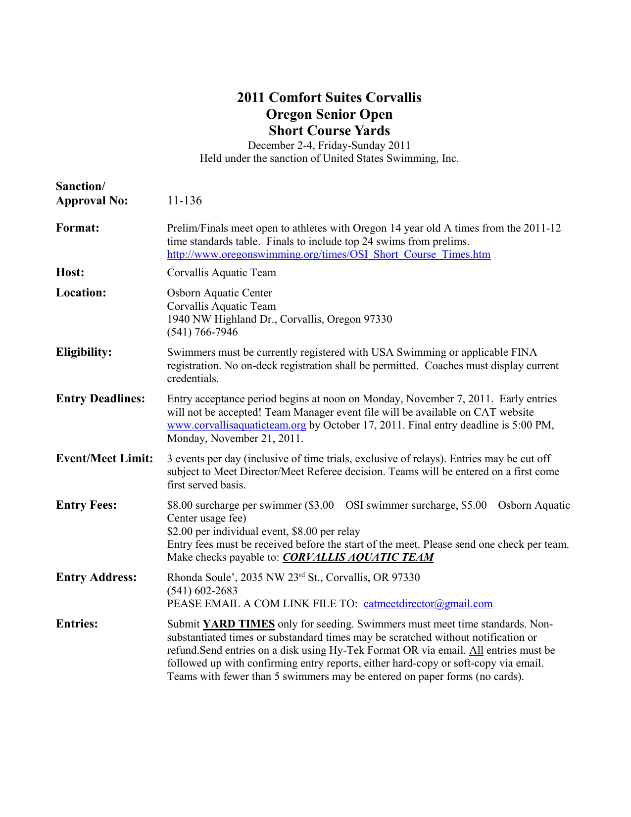 2011 Comfort Suites Corvallis Oregon Senior Open Short Course Yards December 2-4, Friday-Sunday 2011 Held under the sanction of United States Swimming, Inc. Sanction/ Approval No: 11-136 Format: Prelim/Finals meet open to athletes with Oregon 14 year old A times from the 2011-12 time standards table. Finals to include top 24 swims from prelims. http://www.oregonswimming.org/times/OSI_Short_Course_Times.htm Host: Corvallis Aquatic Team Location: Osborn Aquatic Center Corvallis Aquatic Team 1940 NW Highland Dr., Corvallis, Oregon 97330 (541) 766-7946 Eligibility: Swimmers must be currently registered with USA Swimming or applicable FINA registration. No on-deck registration shall be permitted. Coaches must display current credentials. Entry Deadlines: Entry acceptance period begins at noon on Monday, November 7, 2011. Early entries will not be accepted! Team Manager event file will be available on CAT website www.corvallisaquaticteam.org by October 17, 2011. Final entry deadline is 5:00 PM, Monday, November 21, 2011. Event/Meet Limit: 3 events per day (inclusive of time trials, exclusive of relays). Entries may be cut off subject to Meet Director/Meet Referee decision. Teams will be entered on a first come first served basis. Entry Fees: $8.00 surcharge per swimmer ($3.00 – OSI swimmer surcharge, $5.00 – Osborn Aquatic Center usage fee) $2.00 per individual event, $8.00 per relay Entry fees must be received before the start of the meet. Please send one check per team. Make checks payable to: CORVALLIS AQUATIC TEAM Entry Address: Rhonda Soule’, 2035 NW 23rd St., Corvallis, OR 97330 (541) 602-2683 PEASE EMAIL A COM LINK FILE TO: [email protected] Entries: Submit YARD TIMES only for seeding. Swimmers must meet time standards. Nonsubstantiated times or substandard times may be scratched without notification or refund.Send entries on a disk using Hy-Tek Format OR via email. All entries must be followed up with confirming entry reports, either hard-copy or soft-copy via email. Teams with fewer than 5 swimmers may be entered on paper forms (no cards). Check-In and Scratch Rules: Over-swimmer starts will be used. All events will be deck seeded. 1. Individual Scratch Rule – Each swimmer shall inform him/herself of the meet starting time and shall report to the proper meet authorities promptly upon call. A. Preliminary Events 1. Coaches are responsible for providing a positive check-in 1 hour prior to start of the meet Friday and Saturday. For Sunday events, coaches are responsible for positive check-in of swimmers on Saturday prior to the end of prelims. 2. After the heats have been seeded, any swimmer who fails to compete in an individual event in which such swimmer entered and has not been scratched in accordance with sub-paragraph 1. above will be barred from his/her next individual event. S/he will be permitted to participate in relay events of that day. 3. Heat sheets will be published as soon as possible following the positive check-in deadline. B. Finals Events 1. Due to difficulty in filling all finals heats, all swimmers participating in prelims are subject to possible seeding in finals regardless of place. 2. If an athlete does not plan on being available for competing at finals, they must scratch from finals with the clerk of course either during prelims check-in or up to 30 minutes after preliminary results have been announced. 3. Failure to compete at finals will result in removal from the meet. Any ties in prelim heats will be settled by draw. C. Exceptions for failure to compete - No penalty shall apply for failure to withdraw or compete in an individual event if: 1. The Referee is notified in the event of illness or injury and accepts the proof thereof. 2. It is determined by the Referee that failure to compete is caused by circumstances beyond the control of the swimmer. 2. Relay Scratch Rule Any relay team entered in a relay event that fails to compete in or report for that event shall not be penalized. Facility: Competition Pool – Eight lanes, 7-ft, 25-yd lanes, 30-in. tilted blocks. Depth: 6 to 13 ft. The competition course has not been certified in accordance with 104.2.2 C(4). Warm-up Pool: Shallow end east of bulkhead open for continuous warmup/cooldown. Outdoor pool will be available during AM warm-ups. Awards: High Point: Men & Women Top 10. Scoring: Individual: Relay: 20-17-16-15-14-13-12-11-9-7-6-5-4-3-2-1 40-34-32-30-28-26-24-22-18-14-12-10-8-6-4-2 Seating: Air-conditioned, sound insulated, balcony seating for 270. Only those parents who are timing are allowed in the starting area. SWIMMERS AND COACHES ONLY IN THE COMPETITION AREA OF THE POOL. Timing: Daktronics timing system, horn start, and finish touch pads. Results via electronic scoreboard. Names will appear as received in meet entries. Pool Hours: Pool will be open from 7:00 AM until conclusion of the meet. The pool will be open on Sunday at 7:30 AM. Meetings: Officials meeting will be held approximately 60 minutes prior to start of prelims and finals. Coaches meeting 15 minutes prior to start of prelims. Meet Referee: Dave Twenge Phone: (541)740-9682 Email: [email protected] Meet Director: Rhonda Soule’ Phone: (541)206-2683 Email: [email protected] Officials: We always appreciate the help of certified officials from other clubs. If you will be attending please send a confirming e-mail to [email protected]. Uniform is white over blue, long trousers/slacks or skirts for finals. Hospitality will be provided for coaches and officials. Timers: Each team will be given lane-timing assignments. Sign-ups will be available behind the competition area. Concessions: There will be concessions (no grill) available at the meet. There are numerous dining establishments located near the facility. Camping: No OVERNIGHT CAMPING. Multiple parking lots, shared with adjacent school, are available for RVs for day use only. There will be no outside toilet facilities. Camping is available at Benton County Fairgrounds (541) 757