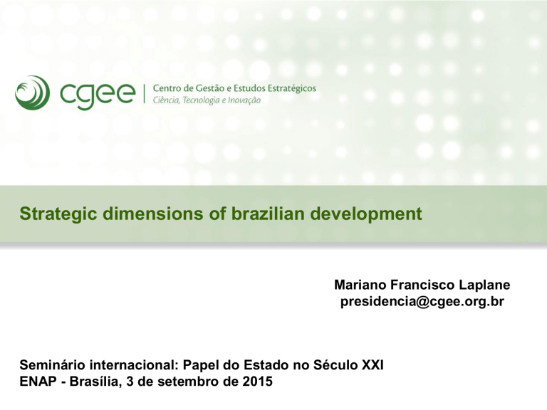 Strategic dimensions of brazilian development Mariano Francisco Laplane [email protected] Seminário internacional: Papel do Estado no Século XXI ENAP - Brasília, 3 de setembro de 2015 Which is the type of society that we want to build in Brazil? “This is the starting point for thinking about our future, to identify and rank our priorities and to build a political platform that gives support to the development effort and that allows the solution of the immense challenges we face ahead.” “O Brasil que queremos”. Centro de Altos Estudos Brasil século XXI 2014 Slide 2 Challenges: • "To ensure the continuity and extend the reach of the current process of redistribution of income and wealth • To advance in the process of universalization of public education and health services, to increasing levels of quality • Reorder the urban environment and improve the quality of life in cities • Resume economic growth and industrialization process • Increase the investment capacity of the Brazilian economy • Improve industrial productivity according to the expansion of employment and labor income” Slide 3 • “Reduce the scientific and technological gap that separates Brazil from the most developed countries • Accelerate the transition to a low-carbon and environmentally sustainable economy • Enlarge the spaces of autonomy for the management of national development policy, to affirm of national strategic interests in the international scenario and to the consolidation of our sovereignty over the country, the continental shelf and its natural resources” “O Brasil que queremos”. Centro de Altos Estudos Brasil século XXI 2014 Slide 4 • Development is a process of diversification and expansion of the productive structure. • Increased productivity and well-being. • Diversification of the productive structure means creating new markets. • The role of the state and STI policies in creating new markets Slide 5 World of R&D 2013 Slide 6 Estimate of expenditure on R & D - 2014 Billions of US dollars - exchange rate PPC 1 2 3 4 5 6 7 8 9 10 Estados Unidos China Japão Alemanha Coréia França Reino Unido Índia Rússia Brasil Subtotal Outros Total Gastos em P&D 465 284 165 92 63 52 44 44 40 33 1.282 336 1.618 % 28,74 17,55 10,19 5,69 3,89 3,21 2,72 2,72 2,48 2,04 79,23 20,77 100,00 Source: National Science Foundation Science and Engineering Indicators 2014. Slide 7 Industry's contribution to total spending on R & D País % Alemanha (2008) 89,0 Coréia do Sul (2010) 87,7 Japão (2010) 87,1 China (2009) 84,0 França (2007) 83,6 Reino Unida (2009) 73,9 Estados Unidos (2009) 69,3 Source: National Science Foundation Science and Engineering Indicators 2014. Slide 8 Leading sector spending on R & D - Selected Countries País Setor Coréia do Sul Eletrônica (47%) Alemanha Automóveis (32%) Reino Unido Farmacêutica (32%) Estados Unidos Serviços (30%) Source: National Science Foundation Science and Engineering Indicators 2014. Slide 9 Slide 10 Slide 11 Slide 12 Slide 13 Slide 14 Slide 15 Slide 16 Slide 17 Slide 18 Slide 19 Distribution of expenditure on R & D performed by US corporations in other countries- 2010 País % Alemanha 17,0 Reino Unido 15,0 Canada 7,0 Bélgica 5,4 França 5,0 Israel 4,9 Japão 4,8 Índia 4,2 China 3,7 Irlanda 3,6 Brasil Fonte: National Science Foundation Science and Engineering3,5 Indicators 2014. Slide 20 Early Challenges to Agricultural Development in Brazil Slide 21 Evolution of Agriculture in Brazil Agricultural Expansion – From 1960’s to 1990’s Slide 22 Development of Tropical Agriculture in Brazil Slide 23 The Oil and Gas Industry Leader in deep sea oil and gas prospection and extraction 2007- Tupi – 7000 m Slide 24 Brazilian Agriculture: Food, Feed, Fiber and Fuel Slide 25 64ª Reunião do Conselho de Administração Obrigado Brasília, 3 de setembro de 2015 Slide 26