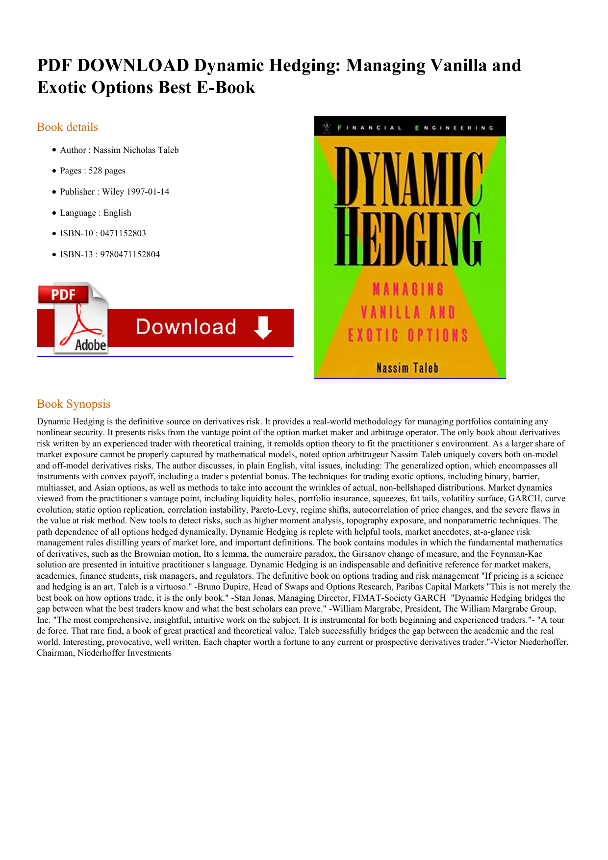 PDF DOWNLOAD Dynamic Hedging: Managing