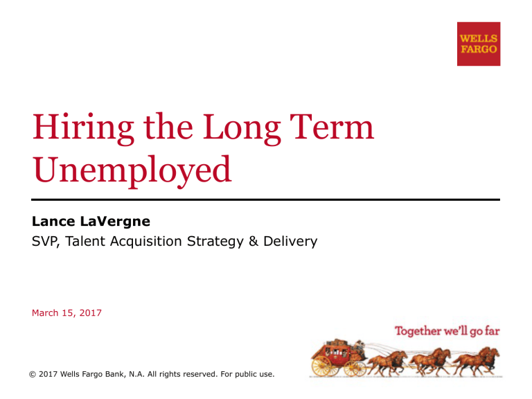 Hiring the Long Term Unemployed Lance LaVergne SVP, Talent Acquisition Strategy & Delivery March 15, 2017 © 2017 Wells Fargo Bank, N.A. All rights reserved. For public use. Benefits of hiring the long term unemployed ▪ Access to a qualified talent pool ▪ Loyalty & engagement ▪ Increased recruiting team capacity ▪ Diversity ▪ Innovation ▪ Expanded customer base ▪ Brand enhancement ▪ Community engagement 2 Overcoming the barriers to hiring the long term unemployed ▪ LTU not considered a part of the talent pipeline – Recognize the value of LTU talent – Build sustainable pipelines of LTU talent – Identify a LTU champion within the organization ▪ Recruitment marketing, advertising & sourcing – Inclusive language in job postings and other media – Partnerships with local & national intermediaries – Employee referral programs – Social media strategies to reach LTU 3 Overcoming the barriers to hiring the long term unemployed ▪ Selection practices that unintentionally screen out LTU – Remove/append language that requires current employment status – Review filters/screens in your ATS – Train recruiters to look for transferable skills – Provide hiring managers & interviewers appropriate behavioral based tools ▪ Cumbersome hiring/onboarding practices – Review credit & background check procedures – LTU mentorship program 4 Maximizing partnerships ▪ Get to know local and national intermediaries ▪ Identify key partners that align with your LTU goals ▪ Build relationships with key contacts at your chosen partners ▪ Share your open opportunities ▪ Communicate regularly ▪ Find ways to collaborate beyond candidate sourcing 5
