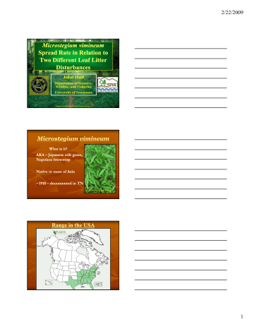 2/22/2009 Microstegium vimineum Spread Rate in Relation to Two Different Leaf Litter Disturbances John Hull Department of Forestry, Wildlife, and Fisheries University of Tennessee Photo by: Fairmount Park Commission Microstegium vimineum What is it? AKA – Japanese stilt grass, Napolese browntop Native to most of Asia ~1918 – documented in TN Chuck Bargeron, University of Georgia Range in the USA 1 2/22/2009 Microstegium vimineum Annual, sprawling grass Can exceed C d 3ft f in height C4 shade tolerant Microstegium vimineum Generalist The Nature Conservancy Johnny Randall • Grows in a variety of light, moisture, and nutrient conditions Seeds and Dispersal Cross and self fertilizes Hundreds of seeds per plant Excessive runoff Animals Contaminated material (i.e. hay) Vehicles/equipment 2 2/22/2009 3 2/22/2009 Spread Rate Affect of leaf litter disturbance? New England Forestry Foundation Objective To determine what affect leaf litter disturbance has on the spread rate of Microstegium vimineum. Offwell Woodland & Wildlife Trust Methods Site Selection 3 Sites Definitive patch/infestation Cumberland Forest and Oak Ridge Arboretum 4 2/22/2009 Treatments 1. 2. 3. No Distrubance (control) Stir/Mix leaf litter Remove leaf litter Three of each treatment per site Example Patch Treatment dimensions = ½ x 2 meters ½ meter subplots within each treatment M. vimineum Implementation Stirring and removal of litter Mid March Matt Jalbert 5 2/22/2009 Measurements Taken on monthly basis 1. 2. 3. Spread Rate Percent Cover estimation for ½ meter subplots Light and Moisture measurements Stem count at end of study Statistics One way ANOVA – block design 1. 2. 3. Control vs. stirred litter Control vs. removed litter Stirred litter vs. removed litter Acknowledgements Dr. Wayne Clatterbuck Dr. Chris Oswalt Dr. Greg Armel 6 2/22/2009 ’s 7