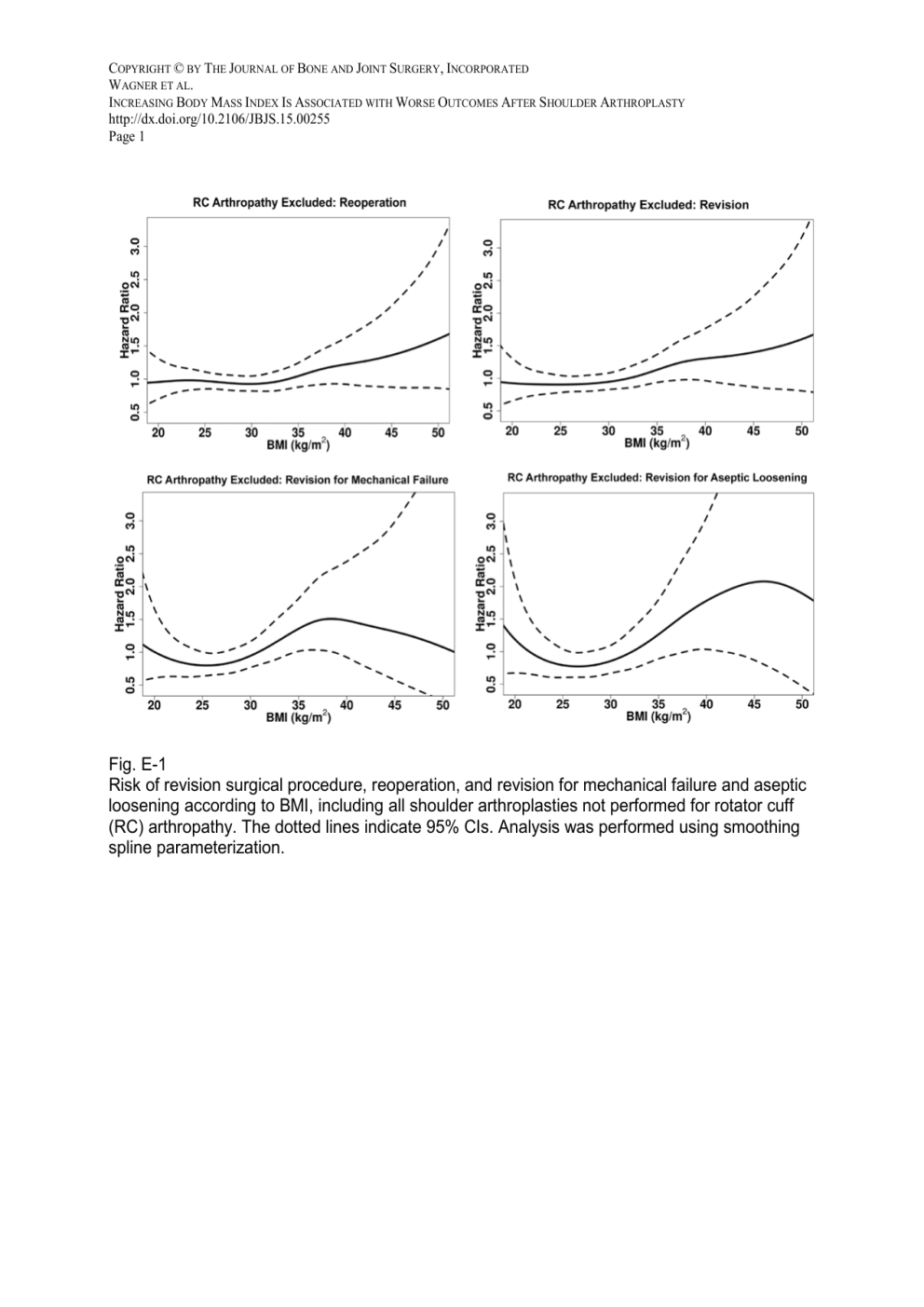COPYRIGHT © BY THE JOURNAL OF BONE AND JOINT SURGERY, INCORPORATED WAGNER ET AL. INCREASING BODY MASS INDEX IS ASSOCIATED WITH WORSE OUTCOMES AFTER SHOULDER ARTHROPLASTY http://dx.doi.org/10.2106/JBJS.15.00255 Page 1 Fig. E-1 Risk of revision surgical procedure, reoperation, and revision for mechanical failure and aseptic loosening according to BMI, including all shoulder arthroplasties not performed for rotator cuff (RC) arthropathy. The dotted lines indicate 95% CIs. Analysis was performed using smoothing spline parameterization. COPYRIGHT © BY THE JOURNAL OF BONE AND JOINT SURGERY, INCORPORATED WAGNER ET AL. INCREASING BODY MASS INDEX IS ASSOCIATED WITH WORSE OUTCOMES AFTER SHOULDER ARTHROPLASTY http://dx.doi.org/10.2106/JBJS.15.00255 Page 2 Fig. E-2 Risk of infection (overall and superficial), periprosthetic fracture, and shoulder dislocation according to BMI, including all shoulder arthroplasties not performed for rotator cuff (RC) arthropathy. The dotted lines indicate 95% CIs. Analysis was performed using smoothing spline parameterization. COPYRIGHT © BY THE JOURNAL OF BONE AND JOINT SURGERY, INCORPORATED WAGNER ET AL. INCREASING BODY MASS INDEX IS ASSOCIATED WITH WORSE OUTCOMES AFTER SHOULDER ARTHROPLASTY http://dx.doi.org/10.2106/JBJS.15.00255 Page 3 TABLE E-1 BMI Thresholds for Outcomes in Shoulder Arthroplasty without Rotator Cuff Arthropathy (N = 4,567) Arthroplasty and BMI HR* P Value Revision (n = 258) <35 kg/m2 1.00 ≥35 kg/m2 1.05† (1.01 to 1.08) 0.03‡ Reoperation (n = 55) <35 kg/m2 1.00 ≥35 kg/m2 1.04† (1.01 to 1.09) 0.04‡ Revision for mechanical failure (n = 111) <30 kg/m2 1.00 ≥30 kg/m2 1.04§ (1.02 to 1.08) 0.01‡ Dislocation (n = 49) Continuous (across all BMIs) 1.01# (0.96 to 1.07) 0.59 Periprosthetic fracture (n = 175) <25 kg/m2 1.11** (1.01 to 1.22) 0.03‡ ≥25 kg/m2 1.00 *The values are given as the HR, with the 95% CI in parentheses. †HR, for each 1 unit of BMI ≥ 35 kg/m2. ‡Significant. §HR, for each 1 unit of BMI ≥ 30 kg/m2. #HR, for each 1 unit of BMI across all BMIs from 20 to 50 kg/m2. **HR, for each 1 unit of BMI below 25 kg/m2. COPYRIGHT © BY THE JOURNAL OF BONE AND JOINT SURGERY, INCORPORATED WAGNER ET AL. INCREASING BODY MASS INDEX IS ASSOCIATED WITH WORSE OUTCOMES AFTER SHOULDER ARTHROPLASTY http://dx.doi.org/10.2106/JBJS.15.00255 Page 4 TABLE E-2 Outcomes Risk Stratified by BMI in Shoulder Arthroplasty without Rotator Cuff Arthropathy Outcomes and BMI HR* P Value Reoperation (n = 55) <30 kg/m2 1.00 30 to 40 kg/m2 1.09 (0.86 to 1.39) 0.47 >40 kg/m2 1.42 (0.92 to 2.20) 0.11 Revision (n = 258) <30 kg/m2 1.00 30 to 40 kg/m2 1.23 (0.94 to 1.60) 0.13 >40 kg/m2 1.49 (0.92 to 2.41) 0.11 Revision for mechanical failure (n = 111) <30 kg/m2 1.00 30 to 40 kg/m2 1.58 (1.06 to 2.36) 0.02† >40 kg/m2 1.40 (0.62 to 3.15) 0.42 Dislocation (n = 49) <30 kg/m2 1.00 30 to 40 kg/m2 0.72 (0.38 to 1.38) 0.32 >40 kg/m2 1.68 (0.65 to 4.31) 0.28 Periprosthetic fracture (n = 175) <30 kg/m2 1.00 30 to 40 kg/m2 0.92 (0.68 to 1.26) 0.62 >40 kg/m2 0.76 (0.39 to 1.48) 0.42 *The values are given as the HR, with the 95% CI in parentheses. †Significant. COPYRIGHT © BY THE JOURNAL OF BONE AND JOINT SURGERY, INCORPORATED WAGNER ET AL. INCREASING BODY MASS INDEX IS ASSOCIATED WITH WORSE OUTCOMES AFTER SHOULDER ARTHROPLASTY http://dx.doi.org/10.2106/JBJS.15.00255 Page 5 TABLE E-3 Outcomes Risk Associated with Diabetes Mellitus in Shoulder Arthroplasty Outcomes and End Point in Patients with Diabetes HR* P Value Reoperation Overall 0.91 (0.40 to 2.05) 0.82 Total shoulder arthroplasty 0.95 (0.23 to 3.88) 0.95 Hemiarthroplasty 1.89 (0.47 to 7.66) 0.37 Reverse shoulder arthroplasty 0.54 (0.12 to 2.20) 0.39 Revision Overall 1.04 (0.43 to 2.52) 0.93 Total shoulder arthroplasty 1.24 (0.30 to 5.08) 0.76 Hemiarthroplasty 1.16 (0.17 to 7.87) 0.88 Reverse shoulder arthroplasty 0.76 (0.19 to 3.22) 0.71 Revision for mechanical failure Overall 2.14 (0.51 to 9.03) 0.30 Total shoulder arthroplasty 2.27 (0.30 to 17.30) 0.43 Hemiarthroplasty 3.82 (0.17 to 88.09) 0.40 Reverse shoulder arthroplasty† Infection (superficial or deep) Overall 1.71 (0.53 to 5.48) 0.37 Total shoulder arthroplasty 0.90 (0.05 to 15.40) 0.94 Hemiarthroplasty 4.51 (0.56 to 36.53) 0.16 Reverse shoulder arthroplasty† Dislocation Overall 1.49 (0.35 to 6.25) 0.59 Total shoulder arthroplasty 2.36 (0.32 to 17.70) 0.40 Hemiarthroplasty† Reverse shoulder arthroplasty† Periprosthetic fracture Overall 1.02 (0.51 to 2.05) 0.95 Total shoulder arthroplasty 0.96 (0.24 to 3.79) 0.95 Hemiarthroplasty 5.30 (1.79 to 15.73) 0.003‡ Reverse shoulder arthroplasty 0.71 (0.21 to 2.34) 0.57 *The values are given as the HR, with the 95% CI in parentheses. †There were not enough events (<10) to include in a univariate analysis model. ‡Significant.