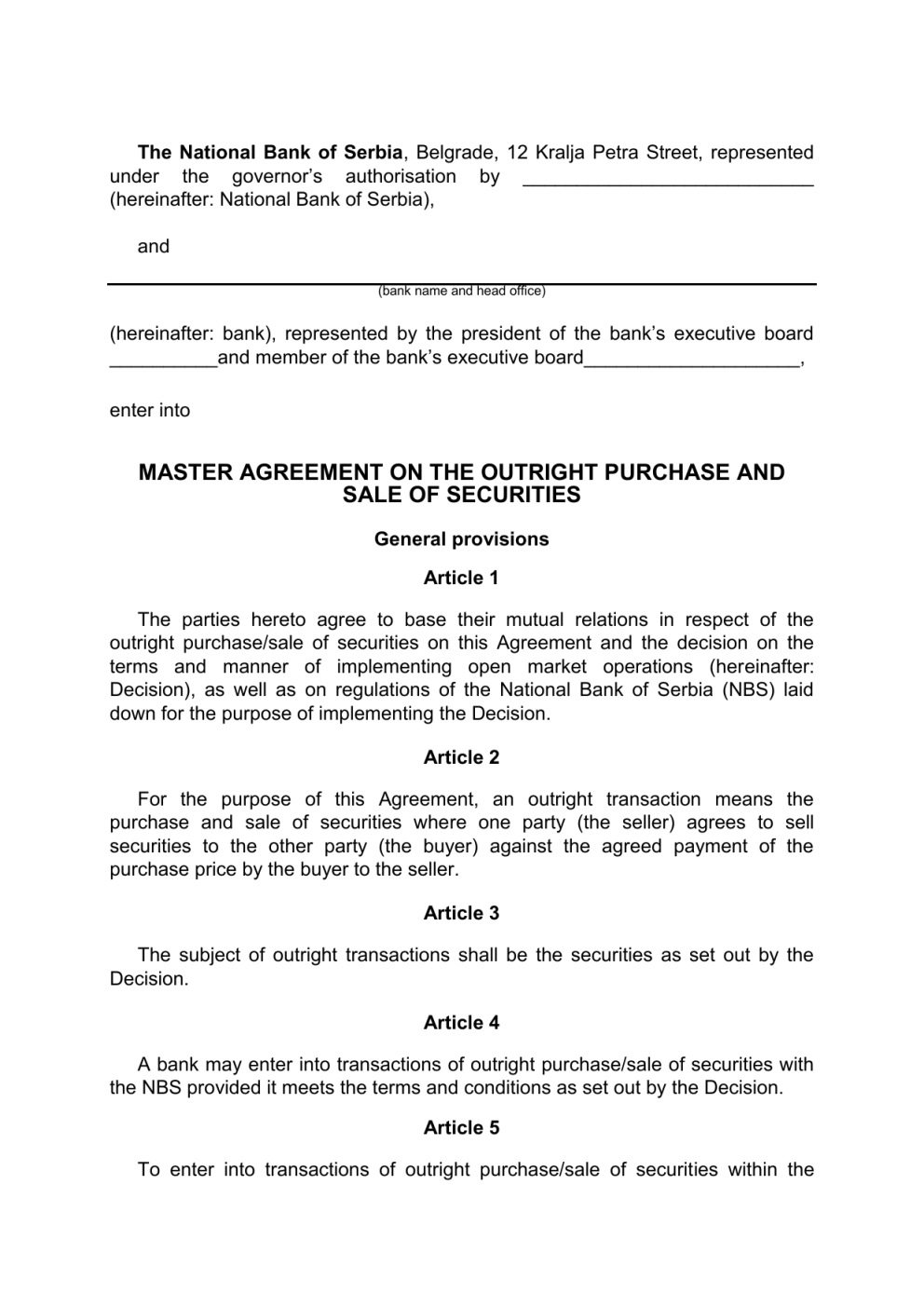The National Bank of Serbia, Belgrade, 12 Kralja Petra Street, represented under the governor’s authorisation by ___________________________ (hereinafter: National Bank of Serbia), and (bank name and head office) (hereinafter: bank), represented by the president of the bank’s executive board __________and member of the bank’s executive board____________________, enter into MASTER AGREEMENT ON THE OUTRIGHT PURCHASE AND SALE OF SECURITIES General provisions Article 1 The parties hereto agree to base their mutual relations in respect of the outright purchase/sale of securities on this Agreement and the decision on the terms and manner of implementing open market operations (hereinafter: Decision), as well as on regulations of the National Bank of Serbia (NBS) laid down for the purpose of implementing the Decision. Article 2 For the purpose of this Agreement, an outright transaction means the purchase and sale of securities where one party (the seller) agrees to sell securities to the other party (the buyer) against the agreed payment of the purchase price by the buyer to the seller. Article 3 The subject of outright transactions shall be the securities as set out by the Decision. Article 4 A bank may enter into transactions of outright purchase/sale of securities with the NBS provided it meets the terms and conditions as set out by the Decision. Article 5 To enter into transactions of outright purchase/sale of securities within the 2 meaning of this Agreement, a bank shall submit to the NBS the data stipulated by the guidelines issued for the purpose of implementing the Decision. A bank shall immediately notify the NBS of any change in the data referred to in paragraph 1 hereof. Definitions Article 6 For the purpose of this Agreement, certain terms shall mean as follows: 1) Purchased securities being subject of an outright transaction mean securities purchased by the buyer from the seller on the purchase date; 2) The purchase date for the securities being subject of an outright transaction means the date on which the buyer must purchase securities (purchased securities) from the seller against the payment of the purchase price by the buyer to the seller; 3) The price means the amount payable by the buyer to the seller on the purchase date for the purchased securities; 4) The interest rate means the rate expressed on an annual basis at which the price calculation is made. The interest rate shall be agreed between the buyer and seller, in accordance with the Decision; 5) The outright transaction currency means the currency in which payments for purchased securities are made, as agreed by and between the buyer and the seller. Payments resulting from outright transactions are settled in dinars; 6) Clearing and settlement means the determining of the amount of liabilities/claims in respect of securities and money arising from securities purchase/sale transactions, as well as settling of liabilities through the transfer of securities and money. Entering into separate agreements Article 7 The National Bank of Serbia and a bank may enter into outright transactions at auctions that the NBS organises, as a rule, through the web platform and bilaterally in accordance with the Decision and regulations referred to in Article 1 hereof. The NBS and a bank shall enter into a separate agreement on each individual outright transaction of securities purchase/sale. The parties hereto agree that the separate agreement entered into at the auction shall be legal without the parties’ signatures and shall be deemed entered into once the NBS accepts the bank’s bid at the auction in full or in part. 3 The separate agreement referred to in paragraph 2 hereof shall be integral to this Agreement. Article 8 In cases when an outright transaction between the NBS and a bank was effected at an auction, a separate agreement shall be made and submitted to the bank, as a rule through the web platform; such agreement shall be deemed entered into once the NBS has accepted the bank’s bid for securities purchase/sale in full or in part. If due to technical problems in operation of the web platform it is not possible to submit the separate agreement to a bank as specified in paragraph 1 hereof, the NBS shall submit the separate agreement to the bank via email or telefax if due to technical reasons the agreement cannot be sent by email. In cases when an outright transaction between the NBS and the bank was effected bilaterally, the separate agreement shall be made and submitted to the bank in writing. Article 9 The parties hereto agree that the separate agreement shall contain in particular the following main data: 1) details of securities being subject of the transaction (type of securities, ISIN, number of pieces, nominal value per piece, etc), 2) purchase date, 3) price, 4) outright transaction currency, 5) date of entering into the outright transaction, i.e. the separate agreement. Apart from data referred to in paragraph 1 hereof, the separate agreement may also contain other necessary data. Settlement of obligations Article 10 In accordance with the separate agreement entered into, the party hereto (the buyer of securities) shall pay the purchase price for the purchased securities to the other party (the seller of securities) on the purchase date, whereas the seller shall settle obligations in respect of the transfer of purchased securities to the buyer’s holding account in the Central Securities Depository and Clearing House (hereinafter: Central Securities Depository). 4 For the purpose of settling obligations referred to in paragraph 1 hereof or meeting the requirements for clearing and settlement, the seller of securities shall ensure that securities being subject of an outright transaction are in his holding account, whereas the buyer shall transfer money to the corresponding account within the Central Securities Depository run in the RTGS, fully in line with the separate agreement entered-into. Article 11 If