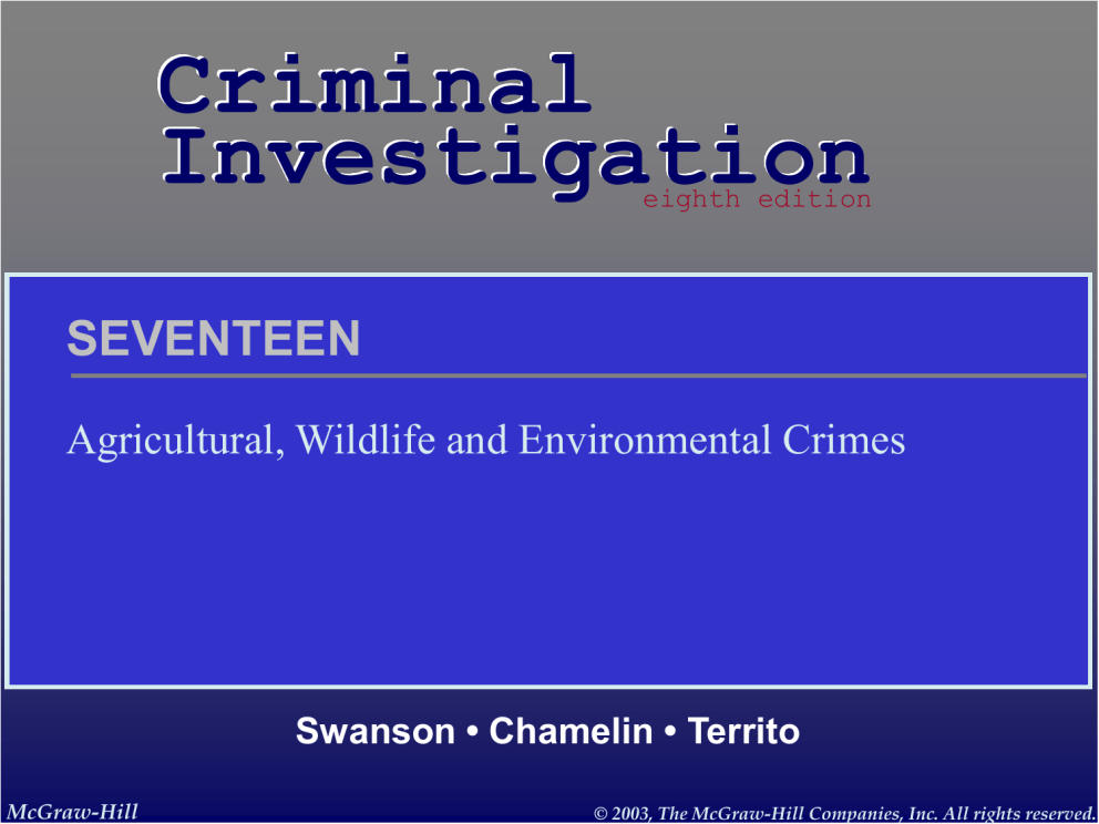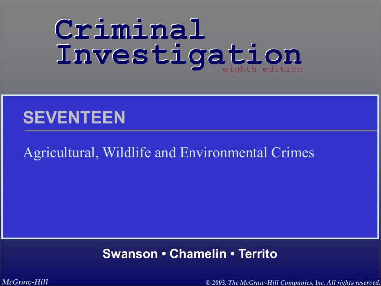 Criminal Investigation eighth edition SEVENTEEN Agricultural, Wildlife and Environmental Crimes Swanson • Chamelin • Territo McGraw-Hill © 2003, The McGraw-Hill Companies, Inc. All rights reserved. LEARNING OBJECTIVES • • • • • • • • • Discuss the prevalence of timber theft Explain agrichemical theft Discuss cattle and horse rustling Outline several methods of horse and cattle identification Summarize measures to prevent rural and agricultural crimes Distinguish between situational and professional poachers Understand investigative techniques used in wildlife crimes List and describe the characteristics of hazardous waste Discuss methods of investigating environmental crimes McGraw-Hill 17-1 © 2003, The McGraw-Hill Companies, Inc. All rights reserved. DIMENSIONS OF AGRICULTURAL, WILDLIFE, AND ENVIRONMENTAL CRIMES • Ranchers, farmers, and others living in rural places are often the victims of thefts • Nationally, rustlers steal about 20,000 cattle worth $12.1 million • Our national parklands are also victimized by plant poachers • It must be observed that person who live in rural areas and on farms, groves, vineyards, and ranches not only are crime victims but are themselves occasional offenders McGraw-Hill 17-2 © 2003, The McGraw-Hill Companies, Inc. All rights reserved. TIMBER THEFT • The U.S. Forest Service concedes that it doesn't know how much timer is stolen from national forests • The value may be as much as $100 million worth annually and the theft may amount to about 1 in every 10 trees cut down • Investigations into the illegal cutting of timber involve a full range of investigative techniques McGraw-Hill 17-3 © 2003, The McGraw-Hill Companies, Inc. All rights reserved. BONE RUSTLERS • Unauthorized fossil hunters, who loot public and private lands • Unauthorized fossil hunters, who loot public and private land McGraw-Hill 17-4 © 2003, The McGraw-Hill Companies, Inc. All rights reserved. AGRICHEMICAL • Any of various chemical products used on farms; includes pesticides, fertilizers, and herbicides McGraw-Hill 17-5 © 2003, The McGraw-Hill Companies, Inc. All rights reserved. THEFT OF AGRICHEMICALS • The theft of agrichemicals is a multimilliondollar-per-year problem nationally • The exact type of agrichemical taken varies by geographic region, depending on what the predominant crop is • Distributors in particular have been vulnerable to the hijacking of trucks carrying agrichemicals, with resulting losses of $200,000 or more per incident • The investigator must become familiar with the legal supply channels and the principal agrichemicals that are used in his or her region • Some farmers will engage in the theft of agrichemicals or will readily purchase such commodities at “bargain prices” McGraw-Hill 17-6 © 2003, The McGraw-Hill Companies, Inc. All rights reserved. LIVESTOCK AND TACK THEFT • Cattle Rustling – The majority of thefts are committed by one or two people who take the animal for their own use • Horse Rustling – More than 50,000 horses are stolen each year as compared to about 20,000 cattle – About 60 percent of the stolen horses end up in slaughter plants, where they are processed and sold as meat for human consumption in Europe and Japan • Tack Theft – Tack is equipment that is used with horses; the most common items are saddles, bridles, and horse blankets McGraw-Hill 17-7 © 2003, The McGraw-Hill Companies, Inc. All rights reserved. LIVESTOCK IDENTIFICATION • In any livestock theft case one key to a successful prosecution is the positive identification of a specific animal as belonging to a particular owner • Hot-Iron Branding – Hot-iron branding is a method of identification that has been used in this country for nearly 400 years • Ear Tags and Injectable Identification – Bar-code ear tags for cattle were an advancement for herd management McGraw-Hill 17-8(a) © 2003, The McGraw-Hill Companies, Inc. All rights reserved. LIVESTOCK IDENTIFICATION (cont'd) • Freeze Branding – Special freeze-branding irons are chilled using dry ice or liquid nitrogen and then applied to the hide • Earmarks – Earmarks are often used in conjunction with branding • DNA Profiles – DNA profiles of expensive horses and bulls are common as a theft deterrent McGraw-Hill 17-8(b) © 2003, The McGraw-Hill Companies, Inc. All rights reserved. CATTLE IDENTIFICATION FORM • Uniformed police officers often take the initial report of a livestock theft • These officers often have little knowledge of livestock • Forms such as the one shown are helpful to the officer in documenting livestock identifiers (Source: Courtesy Los Angeles County, California, Sheriff’s Department) McGraw-Hill 17-9 © 2003, The McGraw-Hill Companies, Inc. All rights reserved. HORSE IDENTIFICATION FORM • This form serves the same purpose as the cattle identification form • Uniformed officers must receive training in the use of this form in order to use it effectively • Information captured on the form can greatly assist the identification process which is critical in a prosecution of livestock theft (Source: Courtesy Kern County, California, Sheriff’s Department) McGraw-Hill 17-10© 2003, The McGraw-Hill Companies, Inc. All rights reserved. BRANDS • On livestock, registered combinations of numbers, letters, marks and shapes that establish unique identifications McGraw-Hill 17-11 © 2003, The McGraw-Hill Companies, Inc. All rights reserved. METHODS OF READING BRANDS • Brands are registered with different agencies in various states – Some are registered with state agencies – Others are registered with local courthouses McGraw-Hill 17-12© 2003, The McGraw-Hill Companies, Inc. All rights reserved. EXAMPLES OF CRIME PREVENTION MEASURES TO PROTECT AGAINST RURAL AND AGRICULTURAL CRIMES • Farm equipment theft – Participate in equipment identification programs – Do not learn equipment in remote fields • Timber