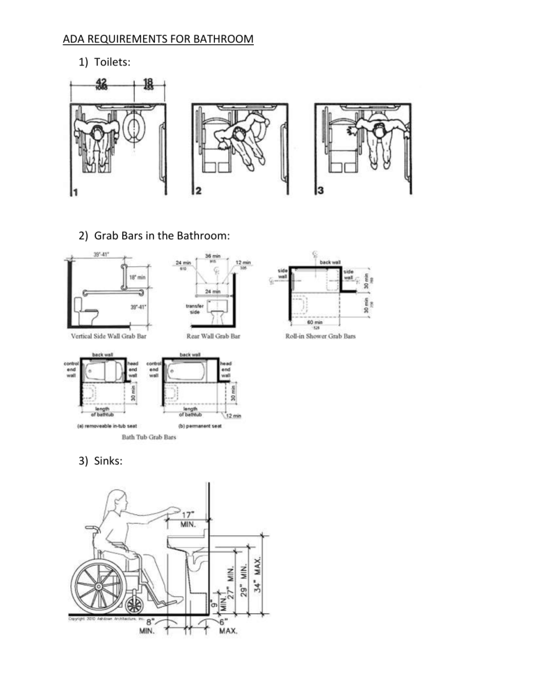 ADA REQUIREMENTS FOR BATHROOM 1) Toilets: 2) Grab Bars in the Bathroom: 3) Sinks: 4) Soap Dispensers: When it comes to hand soap dispensers or hand sanitizing dispensers, there are a couple of requirements you need to be aware of: 1. Reach Range for Walls Where there is nothing on the floor to obstruct access to the hand sanitizer dispenser, it needs to be no higher than 48 inches from the floor (and not lower than 15 inches) 2. Protrusion from Wall When mounting a dispenser on a wall, the soap dispenser cannot protrude more than 4 inches from the wall. 3. Operation of dispensers Dispensers should be able to dispense soap or hand sanitizer with the use of one hand and should not require tight grasping, pinching, or twisting of the wrist. 5) ADA Requirements for doorways: 6) Minimal isle clearance: 36 inches 7) Minimal work surface at computer desk: 8) Minimal requirements between desk use space: 36 inches 9) Handicapped parking spaces:
