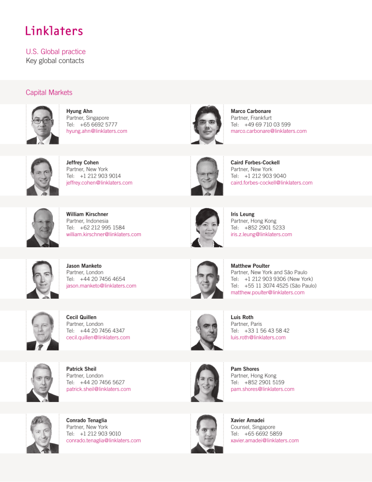 U.S. Global practice Key global contacts Capital Markets Hyung Ahn Partner, Singapore Tel: +65 6692 5777 [email protected] Marco Carbonare Partner, Frankfurt Tel: +49 69 710 03 599 [email protected] Jeffrey Cohen Partner, New York Tel: +1 212 903 9014 [email protected] Caird Forbes-Cockell Partner, New York Tel: +1 212 903 9040 [email protected] William Kirschner Partner, Indonesia Tel: +62 212 995 1584 [email protected] Iris Leung Partner, Hong Kong Tel: +852 2901 5233 [email protected] Jason Manketo Partner, London Tel: +44 20 7456 4654 [email protected] Matthew Poulter Partner, New York and São Paulo Tel: +1 212 903 9306 (New York) Tel: +55 11 3074 4525 (São Paulo) [email protected] Cecil Quillen Partner, London Tel: +44 20 7456 4347 [email protected] Luis Roth Partner, Paris Tel: +33 1 56 43 58 42 [email protected] Patrick Sheil Partner, London Tel: +44 20 7456 5627 [email protected] Pam Shores Partner, Hong Kong Tel: +852 2901 5159 [email protected] Conrado Tenaglia Partner, New York Tel: +1 212 903 9010 [email protected] Xavier Amadei Counsel, Singapore Tel: +65 6692 5859 [email protected] Jonathan Ching Counsel, New York Tel: +1 212 903 9170 [email protected] Cheri De Luca Counsel, Paris Tel: +33 1 56 43 57 35 [email protected] Daniel Kwon Counsel, Seoul Tel: +82 2 6320 1050 [email protected] Kevin Roy Counsel, Berlin Tel: +49 30 214 96 350 [email protected] linklaters.com GC10238_F/07.17 Megan Schellinger Counsel, London Tel: +44 20 7456 4957 [email protected]