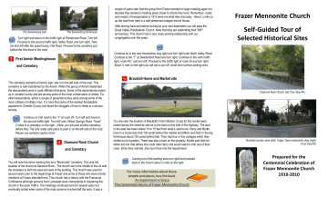 couple of years later that the group from Frazer decided to begin meeting again but decided they wanted a meeting place closer to where they lived. Remember, roads and modes of transportation in 1910 were not what they are today. About ¼ mile on up the road from here is a well preserved octagon school house. The Swanenburg farmhouse The Swanenburg barn Turn right and return to the traffic light at Planebrook Road. Turn left. Proceed to the second traffic light, Sidley Road, and turn right. Take the first left after the speed bump, Flat Road. Proceed to the cemetery just before the first bend in the road. 3 After leaving here and before arriving at your next destination you will pass the Great Valley Presbyterian Church. Note that they are celebrating their 300th anniversary. This church had a very close working relationship with our congregation over the years. Frazer Mennonite Church Self-Guided Tour of Selected Historical Sites Continue on to the next intersection stay right and turn right onto North Valley Road. Continue to the “T” at Swedesford Road and turn right. Continue to the sixth traffic light, route 401, and turn left. Proceed to the traffic light at route 30 and turn right. About ¼ mile on the right you will see a pull off, small hard surface parking area. First Amish Meetinghouse and Cemetary 5 Brackbill Home and Market site This cemetery warrants a historic sign, see it on the left side of the road. This cemetery is well maintained by the Amish. When this group of Amish disbanded the descendents went in quite different directions. Some of the descendents ended up in Juniata County and are among some of the most conservative of Amish. For other descendents, within a couple of generations they were among some of the most ruthless of military men. It is here that some of the earliest Anabaptists appeared in Chester County and faced the struggles of how to relate to a secular society. Continue on Flat road to the “T” at route 29. Turn left and travel to the second traffic light. Turn left onto Yellow Springs Road. Travel 2 miles to a cemetery on the right. (Note: you will past another cemetery before this) The only really safe place to park is on the left side of the road. Please use extreme caution here! 4 Diamond Rock Church and Cemetary You will note the stone marking this as a “Mennonist” cemetery. This was the location of the church at Diamond Rock. The church sat in the middle of this lot with the cemetery to both the east and west of the building. This church was used for several years prior to the beginnings at Frazer and some of those who were charter members at Frazer attended here. This church has a history with the Franconia Conference although persons from Lancaster were instrumental in reopening the church in the early 1900’s. The meetings continued here for several years but eventually ended when some of the main persons involved left the area. It was a Diamond Rock Church site (Tour Stop #4) You are near the location of Brackbill’s Farm Market. Crops for the market were raised across the street as well as to the east on this side of the highway. The land to the east has been raised 10 or 15 feet from what it used to be. Harry and Myrtle lived in a house less that 100 yards behind the market and Milton and Ruth in the big farmhouse about 100 yards behind that. They had four or five cottages which they rented out to travelers. There was also a barn on the property. Myrtle said that her father told her that before she could date Harry she would need to milk one of their cows. Since they married, she must have met the requirement. Coming out of the parking area turn right and proceed back to the church about ½ mile on the right. For more information about these people and places, buy the book An Experiment in Grace The Centennial History of Frazer Mennonite Church Brackbill country store (left); Edgar Taylor blacksmith shop (right) (Tour Stop #2) Prepared for the Centennial Celebration of Frazer Mennonite Church 1910-2010 Allow approximately 90 minutes for the tour if stopping at each site for about 10 minutes Octagonal Schoolhouse Go to the end of the Maple Linden Lane and turn right on route 30. As you pass the second traffic light note Covenant Presbyterian Church (formerly East Whiteland Presbyterian Church) on the left. Continue just past the third traffic light (intersection with route 352) turn left into the parking lot of Frazer Plaza. 1 4 1st Site of Frazer Mennonite Church The Presbyterian church you passed worked closely with our congregation over the years. In the very early days they invited our congregation to hold some Sunday School conferences there when the little school house proved too small. Occasionally someone from there would speak at our afternoon service if a minister from Lancaster or Franconia failed to show. Cornelius Haldeman’s brother was a long time member and trustee at this church. Cornelius was a charter member of Frazer. Great Valley Presbyterian Church 3 At the back right corner of the parking area in the Frazer Plaza, you will find the first cemetery of the Frazer Mennonite Church. If you check the grave stones you will find the names of some of the charter members of our congregation, Haldeman, Eby, and Swanenburg. The two small gravestones in the back left of the graveyard are the infant daughters of Harry and Myrtle Brackbill. Stories of some of these persons can be found in our centennial history book. The first church owned by the congregation sat about on the middle of the raised parking area. It was built in 1918 when the congregation decided it was time to move from the little unused school house which they had been using rent free since 1910. That school house was located across route 30 to the west, near the Maaco Shop, about where the shopping center is. Some may remember the Lamp Sign Shop just across the street now owned by Keyes. Just a note about the area in 1910. There were no businesses here