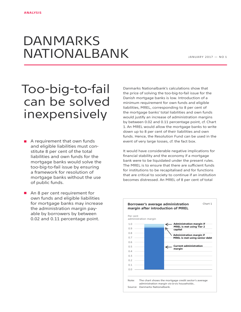 ANALYSI S DANMARKS NATIONALBANK Too-big-to-fail can be solved inexpensively A requirement that own funds and eligible liabilities must constitute 8 per cent of the total liabilities and own funds for the mortgage banks would solve the too-big-to-fail issue by ensuring a framework for resolution of mortgage banks without the use of public funds. An 8 per cent requirement for own funds and eligible liabilities for mortgage banks may increase the administration margin payable by borrowers by between 0.02 and 0.11 percentage point. JANUARY 2017 — NO 1 Danmarks Nationalbank’s calculations show that the price of solving the too-big-to-fail issue for the Danish mortgage banks is low. Introduction of a minimum requirement for own funds and eligible liabilities, MREL, corresponding to 8 per cent of the mortgage banks’ total liabilities and own funds would justify an increase of administration margins by between 0.02 and 0.11 percentage point, cf. Chart 1. An MREL would allow the mortgage banks to write down up to 8 per cent of their liabilities and own funds. Hence, the Resolution Fund can be used in the event of very large losses, cf. the fact box. It would have considerable negative implications for financial stability and the economy if a mortgage bank were to be liquidated under the present rules. The MREL is to ensure that there are sufficient funds for institutions to be recapitalised and for functions that are critical to society to continue if an institution becomes distressed. An MREL of 8 per cent of total Borrower’s average administration margin after introduction of MREL Chart 1 Per cent administration margin 1.0 0.9 0.8 0.7 Administration margin if MREL is met using Tier 2 capital Administration margin if MREL is met using senior debt 0.6 0.5 0.4 Current administration margin 0.3 0.2 0.1 0.0 Note: The chart shows the mortgage credit sector’s average administration margin vis-à-vis households.. Source: Danmarks Nationalbank. A N A LY S I S — D A N M A R K S N AT I O N A L B A N K JANUARY 2017 — NO 1 2 liabilities and own funds means that households, firms and the economy in general can be protected if a mortgage bank becomes distressed. The costs associated with introducing an MREL for the mortgage banks are analysed below. MREL for mortgage banks If an MREL of 8 per cent of the mortgage banks’ total liabilities and own funds is introduced, the mortgage banks must issue eligible liabilities. That will lead to an increase of the institutions’ balance sheets, cf. Chart 2. However, the MREL will make junior covered bonds, JCBs, and the debt buffer superfluous, which to some extent counters the need to increase the balance sheets. Presumably, the mortgage banks will invest the funds from the eligible liabilities in secure assets that can be used as top-up collateral. For borrowers, an MREL for mortgage banks may lead to higher administration margins. The institutions have costs resulting from the yield spread between the eligible assets and the assets in which the funds are invested. The institutions can compensate for the higher costs by increasing administration margins. Method and assumptions The average increase in the administration margin payable by borrowers as a result of the introduction of an MREL of 8 per cent of the mortgage banks’ total liabilities and own funds is estimated by • calculating the volume of eligible liabilities to be issued by the mortgage banks in order to meet an MREL of 8 per cent of total liabilities and own funds, Change in mortgage banks’ balance sheet in connection with MREL Existing model MREL ASSETS ASSETS Government bonds Chart 2 LIABILITIES AND OWN FUNDS Capital Mortgage bonds Debt buffer Mortgage loans Mortgage bonds JCBs Balance sheet increase invested in government bonds LIABILITIES AND OWN FUNDS Government bonds Mortgage bonds Mortgage loans Note: The chart does not reflect the actual distribution of assets and liabilities and own funds. Source: Danmarks Nationalbank. Capital Eligible liabilities Balance sheet increase resulting from MREL Eligible liabilities from former debt buffer JCBs replaced by eligible liabilities Mortgage bonds A N A LY S I S — D A N M A R K S N AT I O N A L B A N K JANUARY 2017 — NO 1 • calculating the total extra costs for the institutions by comparing yields on eligible liabilities, JCBs and government bonds, and • distributing the extra costs on the total lending volume of the mortgage banks. The calculations are based on the mortgage banks’ balance sheets at end-2015.1 To isolate the consequences of introducing an MREL, the calculated consequences of regulation already adopted have been deducted. More specifically, this means that the capital base of the institutions is deducted for the part of the combined capital buffer requirement2 that was phased in in 2016, while the rest of the aggregate buffer requirement will be phased in by 2019. In addition, it has been calculated that none of the institutions will need to replace JCBs with eligible senior debt in order to meet the fully phased-in debt buffer requirement. Furthermore, it is assumed that • the institutions issue Tier 2 capital and eligible senior debt, respectively, in order to meet the MREL, • eligible liabilities replace JCBs, which cannot be included in the MREL3, and • the new eligible liabilities issued, which increase the institutions’ balance sheets, are placed in government bonds with a maturity of five years. The instruments that can be used to meet the MREL are Common Equity Tier 1, Additional Tier 1 and Tier 2 capital as well as eligible senior debt, cf. the fact box. Hence, the calculations are based on the following yields to maturity, which applied at 1 December 2016 and are assumed to be constant, irrespective of the adjustment of the institutions’ balance sheets: 3 Yields to maturity on eligible senior debt, JCBs, Tier 2 capital and government bonds Chart 3 Per cent 4.0 3.5 3.0 2.5 2.0 1.5 1.0 0.5 0