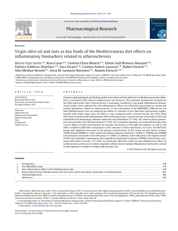 Pharmacological Research 65 (2012) 577–583 Contents lists available at SciVerse ScienceDirect Pharmacological Research journal homepage: www.elsevier.com/locate/yphrs Review Virgin olive oil and nuts as key foods of the Mediterranean diet effects on inflammatory biomarkers related to atherosclerosis Mireia Urpi-Sarda a,b , Rosa Casas a,b , Gemma Chiva-Blanch a,b , Edwin Saúl Romero-Mamani a,b , Palmira Valderas-Martínez a,b , Sara Arranz a,b , Cristina Andres-Lacueva c,d , Rafael Llorach c,d , Alex Medina-Remón b,c , Rosa M. Lamuela-Raventos b,c , Ramon Estruch a,b,∗ a Department of Internal Medicine, Hospital Clinic, Institut d’Investigació Biomèdica August Pi i Sunyer (IDIBAPS), University of Barcelona, C/Villarroel, 170, 08036 Barcelona, Spain CIBER 08/08: Fisiopatología de la Obesidad y la Nutrición and RD06/0045 Alimentación Saludable, Instituto de Salud Carlos III, Spain c Nutrition and Food Science Department, School of Pharmacy, University of Barcelona, Av. Joan XXIII s/n, 08028 Barcelona, Spain d Ingenio-CONSOLIDER program, FUN-C-FOOD, CSD5009-088 Barcelona, Spain b a r t i c l e i n f o Article history: Received 6 March 2012 Received in revised form 8 March 2012 Accepted 9 March 2012 Keywords: Atherosclerosis Inflammatory biomarkers Mediterranean diet Nuts Polyphenols Virgin olive oil a b s t r a c t Previous epidemiological and feeding studies have observed that adherence to Mediterranean diet (MedDiet) is associated with reduced cardiovascular risk. However, the molecular mechanisms involved are not fully understood. Since atherosclerosis is nowadays considered a low-grade inflammatory disease, recent studies have explored the anti-inflammatory effects of a Med-Diet intervention on serum and cellular biomarkers related to atherosclerosis. In two sub-studies of the PREDIMED (PREvencion con DIeta MEDiterranea) trial, we analyzed the effects at 3 months of two Med-Diet interventions supplemented with either virgin olive oil (VOO) or nuts compared with a control low-fat diet (LFD). Both Med-Diets showed an anti-inflammatory effect reducing serum C-reactive protein, interleukin-6 (IL6) and endothelial and monocytary adhesion molecules and chemokines (P < 0.05; all), whereas these parameters increased after the LFD intervention (P < 0.05; all). In another substudy, we evaluated the long-term (1 year) effects of these interventions on vascular risk factors in 516 high-risk subjects, as well as the effect of different Med-Diet components in the reduction of these biomarkers. At 1 year, the Med-Diet groups had significant decreases in the plasma concentrations of IL6, tumor necrosis factor receptor (TNFR) 60 and TNFR80 (P < 0.05), while intercellular adhesion molecule 1 (ICAM-1), TNFR60 and TNFR80 concentrations increased in the LFD group (P < 0.002). In addition, those allocated in the highest tertile of VOO and vegetables consumption had a significant diminution of plasma TNFR60 concentration compared with those in tertile 1 (P < 0.02). In conclusion, Med-Diet exerts an anti-inflammatory effect on cardiovascular system since it down-regulates cellular and circulating inflammatory biomarkers related to atherogenesis in subjects at high cardiovascular risk. © 2012 Elsevier Ltd. All rights reserved. Contents 1. 2. 3. 4. Introduction . . . . . . . . . . . . . . . . . . . . . . . . . . . . . . . . . . . . . . . . . . . . . . . . . . . . . . . . . . . . . . . . . . . . . . . . . . . . . . . . . . . . . . . . . . . . . . . . . . . . . . . . . . . . . . . . . . . . . . . . . . . . . . . . . . . . . . . . . . The PREDIMED study . . . . . . . . . . . . . . . . . . . . . . . . . . . . . . . . . . . . . . . . . . . . . . . . . . . . . . . . . . . . . . . . . . . . . . . . . . . . . . . . . . . . . . . . . . . . . . . . . . . . . . . . . . . . . . . . . . . . . . . . . . . . . . . . Anti-inflammatory effects of the Mediterranean diet . . . . . . . . . . . . . . . . . . . . . . . . . . . . . . . . . . . . . . . . . . . . . . . . . . . . . . . . . . . . . . . . . . . . . . . . . . . . . . . . . . . . . . . . . . . . . . . Relationship between Mediterranean diet key foods and its functional compounds and inflammation . . . . . . . . . . . . . . . . . . . . . . . . . . . . . . . . . . . . . . . . . . Acknowledgements . . . . . . . . . . . . . . . . . . . . . . . . . . . . . . . . . . . . . . . . . . . . . . . . . . . . . . . . . . . . . . . . . . . . . . . . . . . . . . . . . . . . . . . . . . . . . . . . . . . . . . . . . . . . . . . . . . . . . . . . . . . . . . . . . . References . . . . . . . . . . . . . . . . . . . . . . . . . . . . . . . . . . . . . . . . . . . . . . . . . . . . . . . . . . . . . . . . . . . . . . . . . . . . . . . . . . . . . . . . . . . . . . . . . . . . . . . . . . . . . . . . . . . . . . . . . . . . . . . . . . . . . . . . . . . 578 578 578 581 582 582 Abbreviations: BMI, body mass index; CHD, coronary heart disease; CRP, C-reactive protein; HDL, high density lipoprotein; HUVEC, human umbilical vein endothelial cells; ICAM-1, intercellular adhesion molecule 1; IL6, interleukin-6; iNOS, inducible nitric oxide synthase; LDL, low density lipoprotein; LFD, low fat diet; LPS, lipopolysaccharide; Med-Diet, Mediterranean diet; MMP-9, matrix metalloproteinase-9; MUFA, monounsaturated fatty acids; PGE, prostaglandin E; PUFA, polyunsaturated fatty acids; TNFR, tumor necrosis factor receptor; VCAM-1, vascular adhesion molecule 1; VOO, virgin olive oil. ∗ Corresponding author at: Department of Internal Medicine, Hospital Clinic, Institut d’Investigació Biomèdica August Pi i Sunyer (IDIBAPS), University of Barcelona, Villarroel 170, 08036 Barcelona, Spain. Tel.: +34 93 2279365; fax: +34 93 2279365. E-mail address: [email protected] (R. Estruch). 1043-6618/$ – see front matter © 2012 Elsevier Ltd. All rights reserved. doi:10.1016/j.phrs.2012.03.006 578 M. Urpi-Sarda et al. / Pharmacological Research 65 (2012) 577–583 1. Introduction Inflammation is essential in