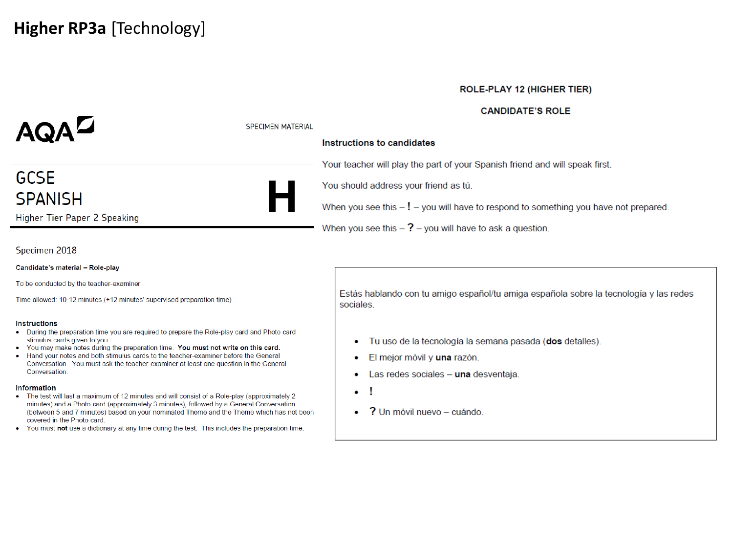 Higher RP3a [Technology] Higher PC2 [School] Mark scheme: Role play HIGHER Indicative Grade Mark 8/9 14-15 7 13 6 10-12 5 7-9 4 4-6 3- 1-3 The 5 utterances are marked separately for communication = 5 x 2 points. Knowledge / use of language (up to 5 points) is awarded overall. Mark scheme: Photo card - HIGHER Indicative Grade 8/9 7 6 5 4 3- Mark AQA criteria additional notes 14-15 The speaker replies to all questions clearly and develops most answers. He/she gives and explains an opinion. clearly means no ambiguity – needed for 14 or 15. Three of five questions developed. Both unprepared questions need to be answered clearly (with an unambiguous verb). 13 The speaker replies to all (or nearly all) questions clearly and develops most answers. He/she gives and explains an opinion. There could be one minor moment of ambiguity. Three of five questions developed. Answer both unprepared questions (although one could contain ambiguity) 10-12 The speaker replies to all or nearly all questions clearly and develops some answers. He/she gives and explains an opinion. Minor ambiguity allowed. 2 prepared Qs need 1++ development. At least 1 unprepared question need to be answered. 7-9 The speaker gives understandable replies to most questions and develops at least one answer. He/she gives an opinion. Permits 1/5 bullets not to be answered. 1+ development needed at least once. At least one opinion. 4-6 The speaker gives understandable replies to most questions but they may be short and/or repetitive. Permits 1/5 bullets not to be answered. All answers can be short / undeveloped / repetitive. 1-3 The speaker replies to some questions but the answers are likely to be short and/or repetitive. 3/5 questions answered with short, repetitive utterances. indicative grade equivalent Grade 9 [30/30] Grade 8 [26-29] Ofqual initiate and sustain detailed conversations manipulating language mostly accurately, expressing ideas and justifying opinions and responding effectively to unpredictable questions Grade 7 [22 – 25] assessment criteria descriptors CONVERSATION C - consistently developed responses; extended sequences of speech; communication(10); narrates coherently; clear at all times; gives and explains opinions range and accuracy R&A - wide variety of linguistic structures; wide vocabulary; reference (10); to past ,future and present is confident; a few minor errors and when pronunciation and complex structures and vocabulary attempted intonation (5); P&I - consistently good throughout spontaneity and S&F - reacts naturally; air of spontaneity; prompt responses; some fluency (5) fluency communication(9); range and accuracy (9); pronunciation and intonation (4-5); spontaneity and fluency (4-5) C - consistently developed responses; extended sequences of speech; narrates coherently; clear at all times; gives and explains opinions R&A - wide variety of linguistic structures; wide vocabulary; reference to past ,future and present is confident; a few minor errors and when complex structures and vocabulary attempted P&I - consistently good throughout (but see below for 4) S&F - reacts naturally; air of spontaneity; prompt responses; some fluency (but see descriptor below for 4) C - regularly developed responses; extended sequences of speech; communication(7-8); usually narrates events when asked; almost always clear; gives and range and accuracy explains opinions. (7-8); R&A - very good language; some variety of linguistic structures; range pronunciation and of vocabulary; past, present and future generally successful; minor errors or when complex structures of vocabulary attempted intonation (4); spontaneity and P&I - good P and I with only occasional lapses fluency (4) S&F - very good exchange; usually reacts naturally; often spontaneous; usually responds promptly and some flow of language. Grade 6 [16-21] Grade 5 [12-15] Overlap grade Ofqual develop conversations manipulating language with reasonable accuracy, expressing opinions and responding appropriately to unpredictable questions use generally accurate pronunciation and intonation Grade 4 [6 – 11] Overlap grade C - develop some responses in extended sequences of speech; sometimes narrates events; usually conveys information clearly; giving and often explaining opinions (see above for 7 descriptor) communication(5-7); R&A - good language; some attempts at more complex structures usually range and accuracy successful; past , present and future sometimes unsuccessful; minor errors (5-7); pronunciation and occasionally more serious ones; no real hindrance to communication (see above for 7 descriptor) and intonation(3); P&I - generally good; some inconsistency in more challenging language spontaneity and fluency (3) S&F - good exchange; sometimes reacts naturally but at times depends on pre learnt language; sometimes hesitates, delivery generally reasonable pace C - usually gives short responses but occasionally gives extended; occasionally narrates briefly; usually clear but lacks clarity from time to communication(4-6); time; opinions, some of which are explained (see above for 5-6) range and accuracy R&A - simple structures and vocabulary; some repetition; attempts to use (4-6); pronunciation more complex structures and vocabulary; some success with tenses; errors but do not impede comprehension. (see above for 5-6 descriptor) and intonation(2); spontaneity and P&I - generally good but some inconsistency at times fluency (2) S&F - generally good exchange, some spontaneity but some reliance on pre learnt response; sometimes hesitates and may not be able to answer some questions C - short responses but occasionally longer; only limited success with narration; a few occasions where unable to answer successfully or lacks communication(2-4); clarity; gives opinions (but see above for 3-4 descriptor) range and accuracy R&A - simple structures and vocabulary; repetitive at times; limited success (2-4); pronunciation with tenses; frequent errors occasionally imped