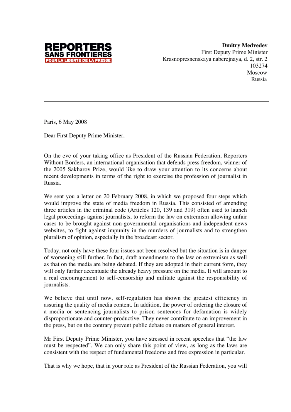 Dmitry Medvedev First Deputy Prime Minister Krasnopresnenskaya naberejnaya, d. 2, str. 2 103274 Moscow Russia Paris, 6 May 2008 Dear First Deputy Prime Minister, On the eve of your taking office as President of the Russian Federation, Reporters Without Borders, an international organisation that defends press freedom, winner of the 2005 Sakharov Prize, would like to draw your attention to its concerns about recent developments in terms of the right to exercise the profession of journalist in Russia. We sent you a letter on 20 February 2008, in which we proposed four steps which would improve the state of media freedom in Russia. This consisted of amending three articles in the criminal code (Articles 120, 139 and 319) often used to launch legal proceedings against journalists, to reform the law on extremism allowing unfair cases to be brought against non-governmental organisations and independent news websites, to fight against impunity in the murders of journalists and to strengthen pluralism of opinion, especially in the broadcast sector. Today, not only have these four issues not been resolved but the situation is in danger of worsening still further. In fact, draft amendments to the law on extremism as well as that on the media are being debated. If they are adopted in their current form, they will only further accentuate the already heavy pressure on the media. It will amount to a real encouragement to self-censorship and militate against the responsibility of journalists. We believe that until now, self-regulation has shown the greatest efficiency in assuring the quality of media content. In addition, the power of ordering the closure of a media or sentencing journalists to prison sentences for defamation is widely disproportionate and counter-productive. They never contribute to an improvement in the press, but on the contrary prevent public debate on matters of general interest. Mr First Deputy Prime Minister, you have stressed in recent speeches that “the law must be respected”. We can only share this point of view, as long as the laws are consistent with the respect of fundamental freedoms and free expression in particular. That is why we hope, that in your role as President of the Russian Federation, you will be eager to work for an improvement in the state of press freedom. We repeat our concern about the conditions in which our colleagues are required to work. We remind you that some journalists, such as Anna Politkovskaya and Paul Klebnikov, paid for their journalistic work with their lives, without those responsible for the killings being identified and put on trial. This situation feeds doubts about the willingness of the Russian authorities to clear up these murders. Your taking office is the occasion to send a strong message to the international community, indicating that Russia is determined to improve its record in terms of respect for freedoms. I trust that you will give this letter your careful consideration. Yours sincerely, Robert Ménard Secretary General