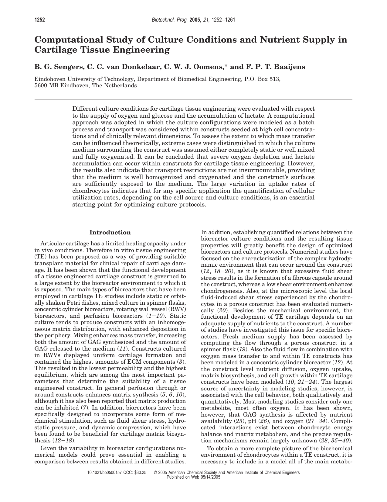 Biotechnol. Prog. 2005, 21, 1252−1261 1252 Computational Study of Culture Conditions and Nutrient Supply in Cartilage Tissue Engineering B. G. Sengers, C. C. van Donkelaar, C. W. J. Oomens,* and F. P. T. Baaijens Eindohoven University of Technology, Department of Biomedical Engineering, P.O. Box 513, 5600 MB Eindhoven, The Netherlands Different culture conditions for cartilage tissue engineering were evaluated with respect to the supply of oxygen and glucose and the accumulation of lactate. A computational approach was adopted in which the culture configurations were modeled as a batch process and transport was considered within constructs seeded at high cell concentrations and of clinically relevant dimensions. To assess the extent to which mass transfer can be influenced theoretically, extreme cases were distinguished in which the culture medium surrounding the construct was assumed either completely static or well mixed and fully oxygenated. It can be concluded that severe oxygen depletion and lactate accumulation can occur within constructs for cartilage tissue engineering. However, the results also indicate that transport restrictions are not insurmountable, providing that the medium is well homogenized and oxygenated and the construct’s surfaces are sufficiently exposed to the medium. The large variation in uptake rates of chondrocytes indicates that for any specific application the quantification of cellular utilization rates, depending on the cell source and culture conditions, is an essential starting point for optimizing culture protocols. Introduction Articular cartilage has a limited healing capacity under in vivo conditions. Therefore in vitro tissue engineering (TE) has been proposed as a way of providing suitable transplant material for clinical repair of cartilage damage. It has been shown that the functional development of a tissue engineered cartilage construct is governed to a large extent by the bioreactor environment to which it is exposed. The main types of bioreactors that have been employed in cartilage TE studies include static or orbitally shaken Petri dishes, mixed culture in spinner flasks, concentric cylinder bioreactors, rotating wall vessel (RWV) bioreactors, and perfusion bioreactors (1-10). Static culture tends to produce constructs with an inhomogeneous matrix distribution, with enhanced deposition in the periphery. Mixing enhances mass transfer, increasing both the amount of GAG synthesized and the amount of GAG released to the medium (11). Constructs cultured in RWVs displayed uniform cartilage formation and contained the highest amounts of ECM components (3). This resulted in the lowest permeability and the highest equilibrium, which are among the most important parameters that determine the suitability of a tissue engineered construct. In general perfusion through or around constructs enhances matrix synthesis (5, 6, 10), although it has also been reported that matrix production can be inhibited (7). In addition, bioreactors have been specifically designed to incorporate some form of mechanical stimulation, such as fluid shear stress, hydrostatic pressure, and dynamic compression, which have been found to be beneficial for cartilage matrix biosynthesis (12-18). Given the variability in bioreactor configurations numerical models could prove essential in enabling a comparison between results obtained in different studies. 10.1021/bp0500157 CCC: $30.25 In addition, establishing quantified relations between the bioreactor culture conditions and the resulting tissue properties will greatly benefit the design of optimized bioreactors and culture protocols. Numerical studies have focused on the characterization of the complex hydrodynamic environment that can occur around the construct (12, 18-20), as it is known that excessive fluid shear stress results in the formation of a fibrous capsule around the construct, whereas a low shear environment enhances chondrogenesis. Also, at the microscopic level the local fluid-induced shear stress experienced by the chondrocytes in a porous construct has been evaluated numerically (20). Besides the mechanical environment, the functional development of TE cartilage depends on an adequate supply of nutrients to the construct. A number of studies have investigated this issue for specific bioreactors. Fresh medium supply has been assessed by computing the flow through a porous construct in a spinner flask (19). Also the fluid flow in combination with oxygen mass transfer to and within TE constructs has been modeled in a concentric cylinder bioreactor (12). At the construct level nutrient diffusion, oxygen uptake, matrix biosynthesis, and cell growth within TE cartilage constructs have been modeled (10, 21-24). The largest source of uncertainty in modeling studies, however, is associated with the cell behavior, both qualitatively and quantitatively. Most modeling studies consider only one metabolite, most often oxygen. It has been shown, however, that GAG synthesis is affected by nutrient availability (25), pH (26), and oxygen (27-34). Complicated interactions exist between chondrocyte energy balance and matrix metabolism, and the precise regulation mechanisms remain largely unknown (28, 35-40). To obtain a more complete picture of the biochemical environment of chondrocytes within a TE construct, it is necessary to include in a model all of the main metabo- © 2005 American Chemical Society and American Institute of Chemical Engineers Published on Web 05/14/2005 Biotechnol. Prog., 2005, Vol. 21, No. 4 1253 Figure 1. Culture configurations. (A) Petri dish. (B) Compression setup. (C) Suspended in a tube. (D) Confined perfusion. lites, namely, glucose, oxygen, and lactate. In most cases nutrient transport has been modeled as steady state assuming constant boundary conditions, which is justified for a large medium volume. However, current TE studies are essentially batch processes in which a large medium volume may not be 