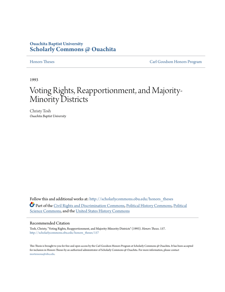 Ouachita Baptist University Scholarly Commons @ Ouachita Honors Theses Carl Goodson Honors Program 1993 Voting Rights, Reapportionment, and MajorityMinority Districts Christy Tosh Ouachita Baptist University Follow this and additional works at: http://scholarlycommons.obu.edu/honors_theses Part of the Civil Rights and Discrimination Commons, Political History Commons, Political Science Commons, and the United States History Commons Recommended Citation Tosh, Christy, "Voting Rights, Reapportionment, and Majority-Minority Districts" (1993). Honors Theses. 157. http://scholarlycommons.obu.edu/honors_theses/157 This Thesis is brought to you for free and open access by the Carl Goodson Honors Program at Scholarly Commons @ Ouachita. It has been accepted for inclusion in Honors Theses by an authorized administrator of Scholarly Commons @ Ouachita. For more information, please contact [email protected]. SENIOR THESIS APPROVAL SHEET This Honor's thesis entitled "Voting Rights, Reapportionment, and Majority-Minority Districts" written by Christy Tosh and submitted in partial fulfillment of the requirements for completion of the Carl Goodson Honors Program meets the criteria for acceptance and has been approved by the undersigned readers !J.,,,,,.£.a ~ Bi~~ Thesis Directr Second Reader Locc<rc Third ~er irecror of the~Go~4om May 7, 1993 Voting Rights, Reapportionment and Majority-Minority Districts Christy Mechelle Tosh Honors Seminiar Honors Council April 9, 1993 Thesis: The challenge is to navigate the untrodden area of reapportionment, in particular majority-minority districts. The Supreme Court has ruled in various reapportionment cases, yet these cases continue to plague the dockets of the United States Supreme Court. The focus of research is to evaluate the new phenomenon of majority-minority districts as it has progressed through constitutional amendments, civil and voting rights acts, and Supreme Court cases, all of which culminate in the 1992 elections. The 1990 Census and reapportionment were the birth of majority-minority districts. In creating these districts, one must look at the most effective percentage breakdowns in each district. Will the barest majority be sufficient or do states need to create safer majorities? Through research of past legislation and Supreme Court cases, analysis of current problems, and study of initial results of majority-minority districts, I will offer to political science information organized in such a way that is currently unavailable. Title: "Voting Rights, Reapportionment and MajorityMinority Districts" Method of Research: A historical evaluation of constitutional amendments and their significance to reapportionment will be made in order to make clear the constitutional basis for minority rights. A historical evaluation of precedent United States Supreme Court cases is necessary in order to establish the trend toward majority-minority districts. The Civil Rights Act of 1866-67, the Civil Rights Act of 1964, and the Voting Rights Act of 1965 will be historically investigated because each aids in forming the foundation of majority-minority districts. Each act will be evaluated in relation to its role in the trend toward reapportionment The preliminary results of the majority-minority districts created for the 1992 elections will be analyzed in order to evaluate the early success of these districts in providing minority representation. TABLE OF CONTENTS I. INTRODUCTION . . . . . . . . . . . . . . . . . . . 1-3 II. LEGISLATION A. Amendments . . . . 3-7 B. Civil Rights and Voting Acts . . . . . 7-10 C. Grandfather Clause, Literacy Test, and White Primaries . . . . . . 11-14 III. SUPREME COURT CASES A. One Man - One Vote . . . • . . 14-16 B. Equality of Each Vote c. . Federal Regulation of Voting . D. Annexation . . . . 16-17 . .17-20 . . . . 20-23 E. Basis for Districting . . . . . . . . . . . . . 23-24 IV. THE DRAWING OF DISTRICTS A. Technical Aspects . . . . B. Legal Requirements . . . c. Vote Dilution . . . . . . . . . . . . . . . . . . . . . . . . . . . . . . 25-26 . . . . . . . 27 . . . . 27-28 D. Gerrymandering . . . . . . . . . . . . . . . • . 29-30 V. MAJORITY MINORITY DISTRICTS A. Harms to Majority . . B. Harms to Minorities . . • . 31-33 . 33-36 C. Majority-Minority Districts and Democracy . . . 36-38 VI. REDISTRICTING A. State Action . . . • . 38-39 B. Federal Action • • • • • • • 3 9-4 0 VII. ALTERNATIVES TO CURRENT SYSTEM A. Proportional Representation System . . . . . 41-44 B. Cumulative Voting System . . . . . . . . . . . . 45-47 VIII. RESULTS ELECTIONS OF MAJORITY MINORITY DISTRICTS IS THE 1992 . . . . . . . . . . . . . . . . . . . 47-56 IX. CONCLUSION . . . . . • . . . . . . . . . . . . . . 56-57 I. INTRODUCTION The dilemma of apportionment has plagued this country since its beginnings. The United States has become a haven for racial diversity, and this makes for problematic districting procedures. Principal among these are majorityminority districts and their legality. The state designed majority-minority districts with the purpose in mind of creating favorable odds for the election of a minority candidate in a given district. Through a strategic drawing of voting district lines to encompass a majority of minority voters, states achieve this purpose. A perplexing problem of the 1990s has been one of reapportionment and redistricting. The allocation of congressional districts among the states is called apportionment. After the feat of reapportionment is accomplished, the actual redrawing of district lines, which is called redistricting, takes place. (Congressional Digest Oct. 228) Two key questions arise in redistricting and the 1 creation of majority-minority districts. One question concerns constitutionality and the other deals with practicality. The constitutional question addresses the legality of the majority-minority district and the power of the federal government to mandate states to implement an apportionm