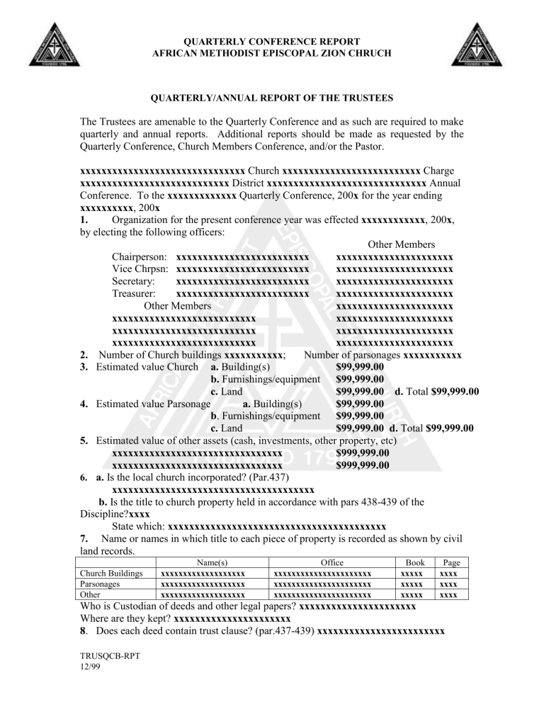 QUARTERLY CONFERENCE REPORT AFRICAN METHODIST EPISCOPAL ZION CHRUCH QUARTERLY/ANNUAL REPORT OF THE TRUSTEES The Trustees are amenable to the Quarterly Conference and as such are required to make quarterly and annual reports. Additional reports should be made as requested by the Quarterly Conference, Church Members Conference, and/or the Pastor. xxxxxxxxxxxxxxxxxxxxxxxxxxxxxxx Church xxxxxxxxxxxxxxxxxxxxxxxxxx Charge xxxxxxxxxxxxxxxxxxxxxxxxxxxx District xxxxxxxxxxxxxxxxxxxxxxxxxxxxxx Annual Conference. To the xxxxxxxxxxxxx Quarterly Conference, 200x for the year ending xxxxxxxxxx, 200x 1. Organization for the present conference year was effected xxxxxxxxxxxx, 200x, by electing the following officers: Other Members Chairperson: xxxxxxxxxxxxxxxxxxxxxxxxx xxxxxxxxxxxxxxxxxxxxxx Vice Chrpsn: xxxxxxxxxxxxxxxxxxxxxxxxx xxxxxxxxxxxxxxxxxxxxxx Secretary: xxxxxxxxxxxxxxxxxxxxxxxxx xxxxxxxxxxxxxxxxxxxxxx Treasurer: xxxxxxxxxxxxxxxxxxxxxxxxx xxxxxxxxxxxxxxxxxxxxxx Other Members xxxxxxxxxxxxxxxxxxxxxx xxxxxxxxxxxxxxxxxxxxxxxxxxx xxxxxxxxxxxxxxxxxxxxxx xxxxxxxxxxxxxxxxxxxxxxxxxxx xxxxxxxxxxxxxxxxxxxxxx xxxxxxxxxxxxxxxxxxxxxxxxxxx xxxxxxxxxxxxxxxxxxxxxx 2. Number of Church buildings xxxxxxxxxxx; Number of parsonages xxxxxxxxxxx 3. Estimated value Church a. Building(s) $99,999.00 b. Furnishings/equipment $99,999.00 c. Land $99,999.00 d. Total $99,999.00 4. Estimated value Parsonage a. Building(s) $99,999.00 b. Furnishings/equipment $99,999.00 c. Land $99,999.00 d. Total $99,999.00 5. Estimated value of other assets (cash, investments, other property, etc) xxxxxxxxxxxxxxxxxxxxxxxxxxxxxxxx $999,999.00 xxxxxxxxxxxxxxxxxxxxxxxxxxxxxxxx $999,999.00 6. a. Is the local church incorporated? (Par.437) xxxxxxxxxxxxxxxxxxxxxxxxxxxxxxxxxxxxxx b. Is the title to church property held in accordance with pars 438-439 of the Discipline?xxxx State which: xxxxxxxxxxxxxxxxxxxxxxxxxxxxxxxxxxxxxxxxx 7. Name or names in which title to each piece of property is recorded as shown by civil land records. Church Buildings Parsonages Other Name(s) xxxxxxxxxxxxxxxxxxx xxxxxxxxxxxxxxxxxxx xxxxxxxxxxxxxxxxxxx Office xxxxxxxxxxxxxxxxxxxxxx xxxxxxxxxxxxxxxxxxxxxx xxxxxxxxxxxxxxxxxxxxxx Book xxxxx xxxxx xxxxx Page xxxx xxxx xxxx Who is Custodian of deeds and other legal papers? xxxxxxxxxxxxxxxxxxxxxx Where are they kept? xxxxxxxxxxxxxxxxxxxxxx 8. Does each deed contain trust clause? (par.437-439) xxxxxxxxxxxxxxxxxxxxxxxx TRUSQCB-RPT 12/99 9. QUATERLY FINANCIAL STATEMENT RECEIPTS: Brought forward from last Quarter Received from: xxxxxxxxxxxxxxxxxxxxxxxxxxxxxxxxxxxxxxxxxxxxxx xxxxxxxxxxxxxxxxxxxxxxxxxxxxxxxxxxxxxxxxxxxxxx xxxxxxxxxxxxxxxxxxxxxxxxxxxxxxxxxxxxxxxxxxxxxx Total Received Total Receipts plus Balance Forward PAID OUT: For Utilities For Telephone For Maintenance & Upkeep For Mortgage For Insurance Total Paid Out Balance on Hand 10. Present indebtedness: $99,999.00 $99,999.00 $99,999.00 $99,999.00 $99,999.00 $99,999.00 $99,999.00 $99,999.00 $99,999.00 $99,999.00 $99,999.00 $99,999.00 $99,999.00 Church Parsonage Other $99,999.00 $99,999.00 $99,999.00 11. a. Insurance Replacement Value Church Building Parsonage Church Furniture/Equipment Parsonage Furniture/Equipment Public Liability Workers Compensation Restricted by Coinsurance (Yes or No) Expires When xxxxxxxxx xxxxxxxxx xxxxxxxxx xxxxxxxxx xxxxxxxxx xxxxxxxxx 12/2/99 12/2/99 12/2/99 xxxxxx xxxxxxxxx xxxxxxxxx 12/2/99 xxxxxx xxxxxx xxxxxxxxx xxxxxxxxx xxxxxxxxx xxxxxxxxx 12/2/99 12/2/99 Amount of Coverage Type of Coverage $99,999.00 $99,999.00 $99,999.00 $99,999.00 $99,999.00 $99,999.00 xxxxxX xxxxxx xxxxxx $99,999.00 $99,999.00 $99,999.00 $99,999.00 Company b. Have the buildings been inspected for fire hazards within the past year? xxxxx c. When was the last appraisal made? xxxxxxxxxx d. By Whom? xxxxxxxxxx e. Is the amount of Insurance equal to replacement value? xxxxxxxxxx 12. Detailed list of income products and apartments funds: Item xxxxxxxxx xxxxxxxxx xxxxxxxxx xxxxxxxxx Date Received 12/2/99 12/2/99 12/2/99 12/2/99 Amount $99,999.00 $99,999.00 $99,999.00 $99,999.00 Where Invested xxxxxxxxx xxxxxxxxx xxxxxxxxx xxxxxxxxx Income $99,999.00 $99,999.00 $99,999.00 $99,999.00 How Applied xxxxxxxxx xxxxxxxxx xxxxxxxxx xxxxxxxxx 13. What improvements and / or repairs were made during the Quarter? xxxxxxxxxxxxxxxxxxxxxxxxxxxxxxxxxxxxxxxxxxxxxxxxxxxxxxxxxxxxxxxxxxxxxxxx xxxxxxxxxx Signed: Date Chairperson or Secretary, Trustee TRUSQCB-RPT 12/99 xxxxxxx, 2000