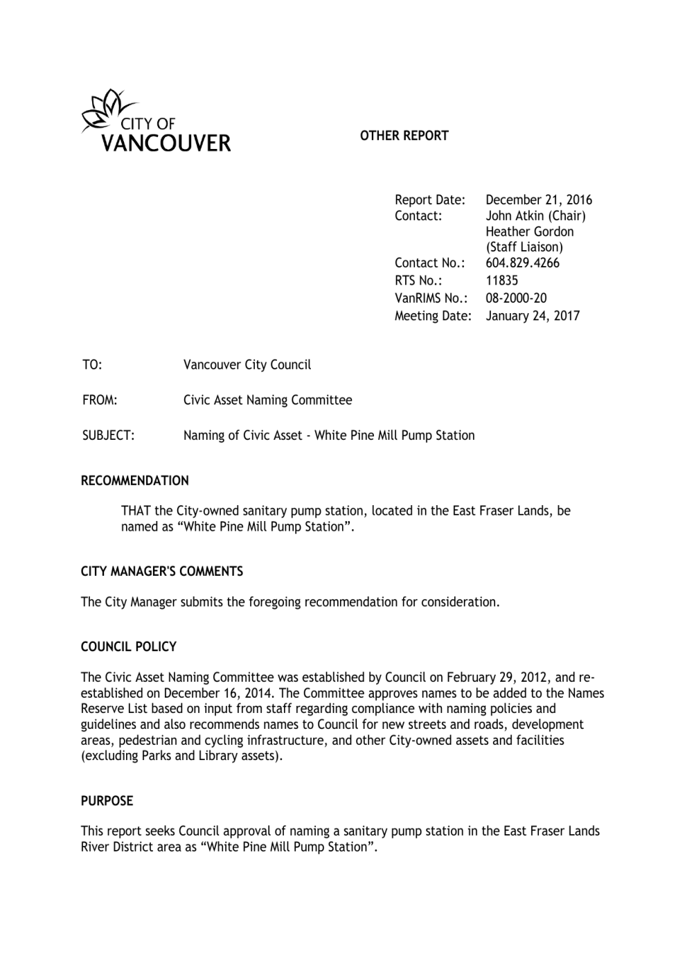 OTHER REPORT Report Date: Contact: Contact No.: RTS No.: VanRIMS No.: Meeting Date: TO: Vancouver City Council FROM: Civic Asset Naming Committee SUBJECT: Naming of Civic Asset - White Pine Mill Pump Station December 21, 2016 John Atkin (Chair) Heather Gordon (Staff Liaison) 604.829.4266 11835 08-2000-20 January 24, 2017 RECOMMENDATION THAT the City-owned sanitary pump station, located in the East Fraser Lands, be named as “White Pine Mill Pump Station”. CITY MANAGER'S COMMENTS The City Manager submits the foregoing recommendation for consideration. COUNCIL POLICY The Civic Asset Naming Committee was established by Council on February 29, 2012, and reestablished on December 16, 2014. The Committee approves names to be added to the Names Reserve List based on input from staff regarding compliance with naming policies and guidelines and also recommends names to Council for new streets and roads, development areas, pedestrian and cycling infrastructure, and other City-owned assets and facilities (excluding Parks and Library assets). PURPOSE This report seeks Council approval of naming a sanitary pump station in the East Fraser Lands River District area as “White Pine Mill Pump Station”. Naming of Civic Asset - White Pine Mill Pump Station - 11835 2 BACKGROUND AND DISCUSSION On February 15, 2016, the Civic Asset Naming Committee passed a motion to recommend the name “White Pine Mill Pump Station” for the sanitary sewer pump station located in the East Fraser Lands River District area (as shown in Appendix A and B). The White Pine name acknowledges the Canadian White Pine Mill. Located on the Fraser River in Vancouver, the mill began operation in 1923 and was the first sawmill owned and operated by H.R. MacMillan. By the 1930s, MacMillan acquired the neighbouring Dominion Mill, built by Julius Bloedel in 1910, creating one of the largest mill operations on the Pacific Coast. It closed in the early 2000s. Figure 1: Proposed Signage FINANCIAL IMPLICATIONS There are no financial implications. The supply and installation of the signage is included as part of the pump station design and specification. The pump station is being constructed by Park Lane as the developer of the East Fraser Lands under their site servicing obligations. CONCLUSION The Civic Asset Naming Committee recommends Council approve the name “White Pine Mill Pump Station” for the City-owned sanitary pump station located in the East Fraser Lands River District area. ***** APPENDIX A APPENDIX B