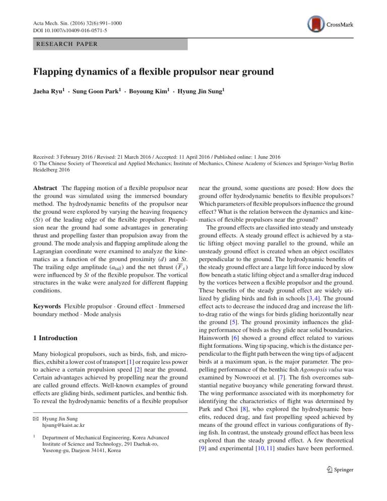 Acta Mech. Sin. (2016) 32(6):991–1000 DOI 10.1007/s10409-016-0571-5 RESEARCH PAPER Flapping dynamics of a flexible propulsor near ground Jaeha Ryu1 · Sung Goon Park1 · Boyoung Kim1 · Hyung Jin Sung1 Received: 3 February 2016 / Revised: 21 March 2016 / Accepted: 11 April 2016 / Published online: 1 June 2016 © The Chinese Society of Theoretical and Applied Mechanics; Institute of Mechanics, Chinese Academy of Sciences and Springer-Verlag Berlin Heidelberg 2016 Abstract The flapping motion of a flexible propulsor near the ground was simulated using the immersed boundary method. The hydrodynamic benefits of the propulsor near the ground were explored by varying the heaving frequency (St) of the leading edge of the flexible propulsor. Propulsion near the ground had some advantages in generating thrust and propelling faster than propulsion away from the ground. The mode analysis and flapping amplitude along the Lagrangian coordinate were examined to analyze the kinematics as a function of the ground proximity (d) and St. The trailing edge amplitude (atail ) and the net thrust (F x ) were influenced by St of the flexible propulsor. The vortical structures in the wake were analyzed for different flapping conditions. Keywords Flexible propulsor · Ground effect · Immersed boundary method · Mode analysis 1 Introduction Many biological propulsors, such as birds, fish, and microflies, exhibit a lower cost of transport [1] or require less power to achieve a certain propulsion speed [2] near the ground. Certain advantages achieved by propelling near the ground are called ground effects. Well-known examples of ground effects are gliding birds, sediment particles, and benthic fish. To reveal the hydrodynamic benefits of a flexible propulsor B 1 Hyung Jin Sung [email protected] Department of Mechanical Engineering, Korea Advanced Institute of Science and Technology, 291 Daehak-ro, Yuseong-gu, Daejeon 34141, Korea near the ground, some questions are posed: How does the ground offer hydrodynamic benefits to flexible propulsors? Which parameters of flexible propulsors influence the ground effect? What is the relation between the dynamics and kinematics of flexible propulsors near the ground? The ground effects are classified into steady and unsteady ground effects. A steady ground effect is achieved by a static lifting object moving parallel to the ground, while an unsteady ground effect is created when an object oscillates perpendicular to the ground. The hydrodynamic benefits of the steady ground effect are a large lift force induced by slow flow beneath a static lifting object and a smaller drag induced by the vortices between a flexible propulsor and the ground. These benefits of the steady ground effect are widely utilized by gliding birds and fish in schools [3,4]. The ground effect acts to decrease the induced drag and increase the liftto-drag ratio of the wings for birds gliding horizontally near the ground [5]. The ground proximity influences the gliding performance of birds as they glide near solid boundaries. Hainsworth [6] showed a ground effect related to various flight formations. Wing tip spacing, which is the distance perpendicular to the flight path between the wing tips of adjacent birds at a maximum span, is the major parameter. The propelling performance of the benthic fish Agonopsis vulsa was examined by Nowroozi et al. [7]. The fish overcomes substantial negative buoyancy while generating forward thrust. The wing performance associated with its morphometry for identifying the characteristics of flight was determined by Park and Choi [8], who explored the hydrodynamic benefits, reduced drag, and fast propelling speed achieved by means of the ground effect in various configurations of flying fish. In contrast, the unsteady ground effect has been less explored than the steady ground effect. A few theoretical [9] and experimental [10,11] studies have been performed. 123 992 Iosilevskii [12] addressed unsteady aerodynamic forces acting on a wing oscillating in a uniform flow in the presence of a distant flag ground. An asymptotic theory was applied to obtain hydrodynamic loads acting on a hydrofoil oscillating below the water. Quinn et al. [13] investigated the unsteady ground effect by measuring net thrust and selfpropelled swimming speed. Many hydrodynamic benefits were obtained for a flexible propulsor propelling near the ground. Except for Quinn et al. [13], most earlier studies were conducted on rigid objects. In the present study, the immersed boundary (IB) method was adopted to simulate a flexible propulsor near the ground. Using the IB method, the structure was separated into the massive part and the massless part. The fluid governing equations and the solid governing equations were independently solved using the interaction momentum forcing term [14– 16]. The momentum forcing was added to induce the fluid velocity equivalent to the velocity of the IB and to enforce the no-slip boundary condition along the IB [17,18]. The IB method can resolve the dynamics of a flexible body without grid regeneration. Many studies have been conducted using the IB method for applications. The dynamics of an oscillating cascade in turbomachinery was explored using the IB method [19]. Kim et al. [20] exhibited the interaction modes between two tandem flexible flags and examined the optimal modes for drag reduction. Biomimetic studies using the IB method are numerous. Uddin et al. [21,22] investigated the efficiency of fish schooling for drag reduction. Fish schooling behaviors are not merely a social behavior but a smart way to improve movement efficiency. Zhu et al. [23] simulated a self-propelled plunging foil using the IB method. The foil moved forward with a heaving motion of the leading edge in a quiescent flow. Zhu et al. [24] fleshed out a rationale for the hydrodynamic benefits experienced by the downstream flag in a system comprising two self-propelling flags. The IB method was exten