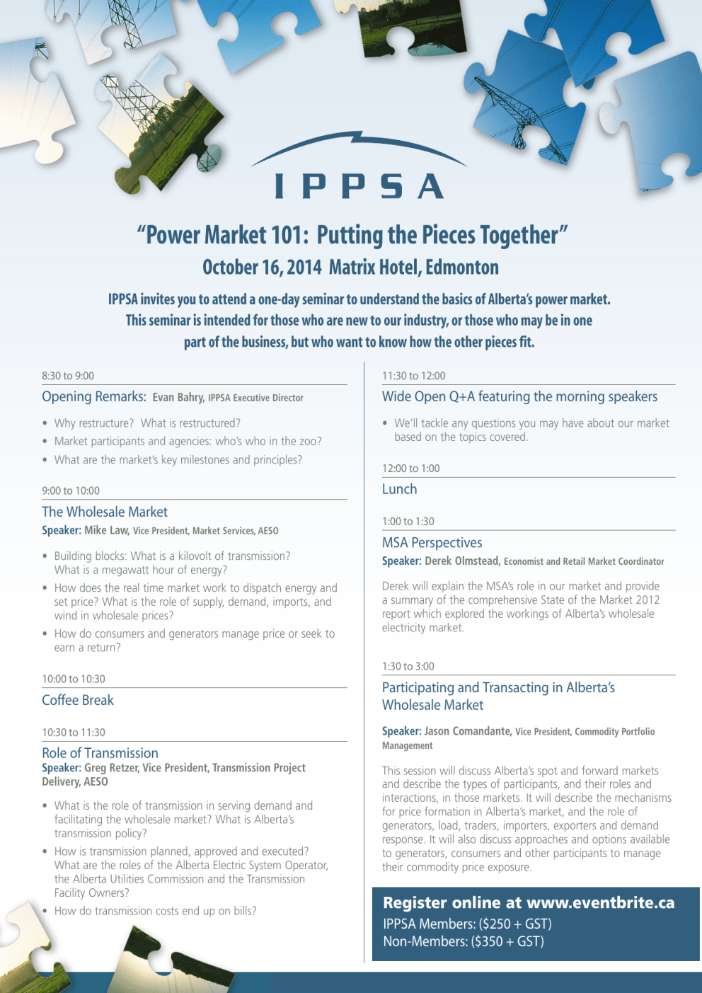 “Power Market 101: Putting the Pieces Together” October 16, 2014 Matrix Hotel, Edmonton IPPSA invites you to attend a one-day seminar to understand the basics of Alberta’s power market. This seminar is intended for those who are new to our industry, or those who may be in one part of the business, but who want to know how the other pieces fit. 8:30 to 9:00 Opening Remarks: 11:30 to 12:00 Evan Bahry, IPPSA Executive Director • Why restructure? What is restructured? • Market participants and agencies: who’s who in the zoo? • What are the market’s key milestones and principles? 9:00 to 10:00 The Wholesale Market Speaker: Mike Law, Vice President, Market Services, AESO • Building blocks: What is a kilovolt of transmission? What is a megawatt hour of energy? • How does the real time market work to dispatch energy and set price? What is the role of supply, demand, imports, and wind in wholesale prices? • How do consumers and generators manage price or seek to earn a return? 10:00 to 10:30 Wide Open Q+A featuring the morning speakers • We’ll tackle any questions you may have about our market based on the topics covered. 12:00 to 1:00 Lunch 1:00 to 1:30 MSA Perspectives Speaker: Derek Olmstead, Economist and Retail Market Coordinator Derek will explain the MSA’s role in our market and provide a summary of the comprehensive State of the Market 2012 report which explored the workings of Alberta’s wholesale electricity market. 1:30 to 3:00 Coffee Break Participating and Transacting in Alberta’s Wholesale Market 10:30 to 11:30 Speaker: Jason Comandante, Vice President, Commodity Portfolio Role of Transmission Speaker: Greg Retzer, Vice President, Transmission Project Delivery, AESO • What is the role of transmission in serving demand and facilitating the wholesale market? What is Alberta’s transmission policy? • How is transmission planned, approved and executed? What are the roles of the Alberta Electric System Operator, the Alberta Utilities Commission and the Transmission Facility Owners? • How do transmission costs end up on bills? Management This session will discuss Alberta’s spot and forward markets and describe the types of participants, and their roles and interactions, in those markets. It will describe the mechanisms for price formation in Alberta’s market, and the role of generators, load, traders, importers, exporters and demand response. It will also discuss approaches and options available to generators, consumers and other participants to manage their commodity price exposure. Register online at www.eventbrite.ca IPPSA Members: ($250 + GST) Non-Members: ($350 + GST)