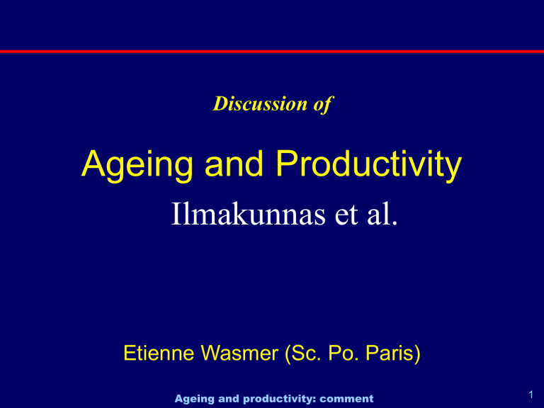 Discussion of Ageing and Productivity Ilmakunnas et al. Etienne Wasmer (Sc. Po. Paris) Ageing and productivity: comment 1 Introduction 1 Really interesting piece – – – – – a general framework relations between age and absenteism age and working capacity age and productivity at the plant level Some policy implications Ageing and productivity: comment 2 Introduction 2 Summary of findings - productivity is multi-dimensional - effect of age on absenteism is complex and not monotonic (frequency vs. duration) - various cognitive and non-cognitive ability vary differently with age: most decline with age but some (e.g. verbal ability) increase - overall, labor market behaviour more important than age on productivity Ageing and productivity: comment 3 Introduction 3 Why important to know? Several implications a) for reforms of pension systems, notably the optimal age of retirement b) but also for the design of training policies and even of education policy (cohort effects; general vs. specific education and obsolescence rates of skills) c) and for employability of “seniors” Ageing and productivity: comment 4 In short: implications for most aspects of labor economics This discussion Couple of general remarks Enlight conclusions and policy Two conjectures Ageing and productivity: comment 5 First, a few missing dimensions: Career mobility. Most of the relation between age and productivity is determined by changing occupation or even sectors. Variant of the Roy model. Verbal skills matter more at a higher level of hierarchy. Learning skills matter more at a younger age. So occupations are a first order determinant of the age-productivity link. Ageing and productivity: comment 6 Does it matter? When estimating a relation between age and “errors” on the assembly line, potentially an upward bias: those who commit more mistakes may be more likely to have no promotion hence to remain an assembly line worker Literature on peer effects Ageing and productivity: comment 7 Second point: gender – Too politically correct? Are skills and productivity depreciating faster or not depending on gender - In most countries, female workers retirement age is lower (legal and effective). Could have been adressed Ageing and productivity: comment 8 Related point: endogeneity issue, related to the career choices and participation decisions Most skills are maintained when they are useful and needed. Time horizon matters a lot (this is why older persons should play Scrabble as long as they can, why their skills deteriorate fast when their spouse dies, why older heads of states often die one or two years after they resign, etc…) Ageing and productivity: comment 9 Ageing and productivity: comment 10 Ageing and productivity: comment 11 Ageing and productivity: comment 12 Endogeneity of skill maintenance decisions Ageing and productivity: comment 13 Labor market theory of this curve Productivity Wage RA for FRDB Author for FRDB Coordinator for FRDB Discussant for FRDB Ageing and productivity: comment 14 A side remark: no mention of life expectancy – a) cognitive ability and its maintenance impact on life expectancy b) statistics easy to find, and thus possible to draw inference on the end of career of senior workers by sector, education, country, gender… Ageing and productivity: comment 15 More important But what would really improve the work is the missing link between technology and aging Are IT youth-friendly relative to older workers? Can we think of IT’s that would instead raise the relative productivity of senior workers? Ageing and productivity: comment 16 Policy implications What policy conclusions do we reach? Do we need to subsidize firms who invest in skills of senior workers, raising their employability IT’s friendly to senior workers? What about education? Ageing and productivity: comment 17 Education “cristallized abilities” are presumably to a large extent cohort effects. The generation before us makes no grammatical mistake and remember many poetries but cannot plug a PC and are disarmed in the “trial and error” process of the internet. A conclusion would be that the construction of skills is as much a collective effort as an individual one. 18 Ageing and productivity: comment Open issue: stress at the workplace and p.r. Stress vs. employment protection 3 TU 2.5 IT PT GR SK PO GE AT CZ SP FR 2 UK BE HU SW IE 1.5 DK NE FI 1 1.5 2 2.5 Employment protection (OECD 2004) Ageing and productivity: comment 3 3.5 19