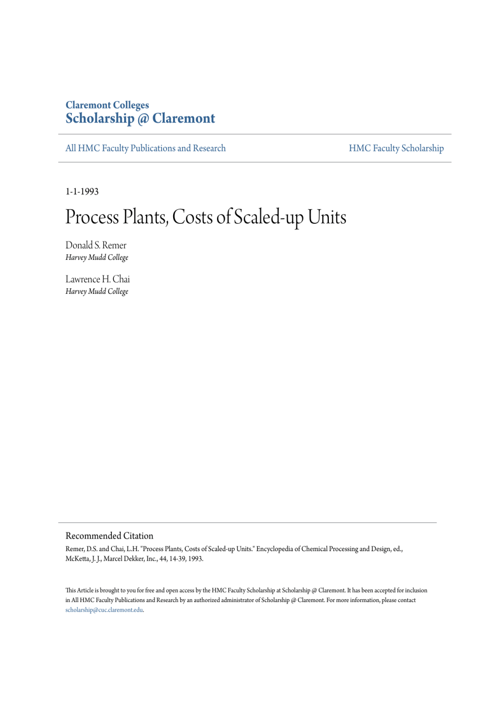 Claremont Colleges Scholarship @ Claremont All HMC Faculty Publications and Research HMC Faculty Scholarship 1-1-1993 Process Plants, Costs of Scaled-up Units Donald S. Remer Harvey Mudd College Lawrence H. Chai Harvey Mudd College Recommended Citation Remer, D.S. and Chai, L.H. "Process Plants, Costs of Scaled-up Units." Encyclopedia of Chemical Processing and Design, ed., McKetta, J. J., Marcel Dekker, Inc., 44, 14-39, 1993. This Article is brought to you for free and open access by the HMC Faculty Scholarship at Scholarship @ Claremont. It has been accepted for inclusion in All HMC Faculty Publications and Research by an authorized administrator of Scholarship @ Claremont. For more information, please contact [email protected].