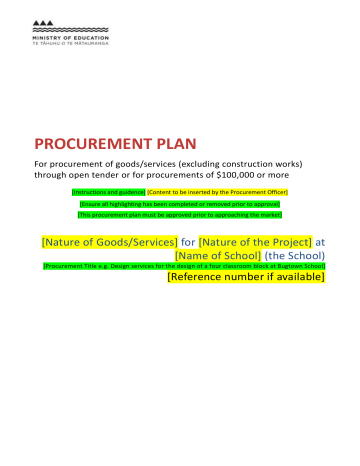 PROCUREMENT PLAN For procurement of goods/services (excluding construction works) through open tender or for procurements of $100,000 or more [Instructions and guidence] [Content to be inserted by the Procurement Officer] [Ensure all highlighting has been completed or removed prior to approval] [This procurement plan must be approved prior to approaching the market] [Nature of Goods/Services] for [Nature of the Project] at [Name of School] (the School) [Procurement Title e.g. Design services for the design of a four classroom block at Bugtown School] [Reference number if available] Contents 1. Purpose and objectives....................................................................................................... 3 2. Background ......................................................................................................................... 3 3. Our requirements ................................................................................................................ 3 4. Procurement value and budget ........................................................................................... 6 5. The Contract ....................................................................................................................... 7 6. Market research and engagement ...................................................................................... 7 7. Stakeholder Engagement ................................................................................................... 7 8. Procurement strategy.......................................................................................................... 8 9. Roles, responsibilities and control points............................................................................ 8 10. Timeline ............................................................................................................................ 10 11. Evaluation plan ................................................................................................................. 11 12. Price evaluation ................................................................................................................ 15 13. Due diligence .................................................................................................................... 15 14. Conflict of Interest process ............................................................................................... 15 15. Award and debrief ............................................................................................................. 16 16. Risk register ...................................................................................................................... 16 17. Procurement plan approval ............................................................................................... 17 .............................................................................................................................................................................. .................................................................................... 1. Purpose and objectives 1.1 The purpose of this document is to detail the plan for the procurement of [Procurement title] for [the Board of Trustees (BoT) of [name of School] [OR] [the Ministry business unit] (The Buyer). The procurement will be conducted through a [specify the approach to market method] [e.g. single/two stage open tender, closed Request for Proposal (RFP) to [number] potential suppliers]. 1.2 The objective of this procurement is to source the supply of [describe the outcome/goods/services sought] [e.g. design services for the design of a four classroom block at Bugtown School]. 1.3 [This procurement relates to property construction/maintenance of schools and therefore the privacy impact is minimal.][EIS procurement only: If for goods/services other than those relating to property construction/maintenance of schools, contact a Procurement Leader for further advice] 2. Background 2.1 [Describe the project (of which this procurement is a part) in enough detail to give context to the procurement and to in turn enable a clear understanding of the overall requirements. This may include: history to the project to date: what has lead to the project being undertaken the overall outcome sought and key considerations a description of the project an outline of the overall procurement strategy for the project including how this procurement fits into the overall procurement strategy for the project and how other elements of the project have been or will be procured. 3. Our requirements [Our requirements sections should be drafted so that it can be copied and pasted directly into the ROI/RFP/RFQ document] Pre-conditions[Optional section] [Pre-conditions are mandatory Requirements. They must be polar (yes/no), relevant, demonstrable, not open to interpretation and not reversible once the tender closes. Any Respondent/Proposal that does not meet all pre-conditions must be excluded from further evaluation. Pre-conditions must be limited to: legal or financial capacity commercial or operational capacity or capacity to deliver appropriate technical skills or expertise or relevant experience Examples of pre-conditions include: minimum qualification and/or membership of professional body Page 3 of 17 minimum level of relevant recent experience minimum availability Requirements (e.g. must be able to commence on the intended start date) minimum capacity Requirements. Pre-conditions must NOT include requiring Respondents to have specific experience with the Ministry, a particular school, or schools in general.] 3.1 To be considered for this opportunity Respondents/Proposals must satisfy all of the following pre-conditions: [pre-condition]. 3.2 Respondents that are not able to meet all pre-conditions will be excluded from evaluation (subject to Procurement Sponsor approval). Required solution 3.3 [Describe the Requirements to be sup