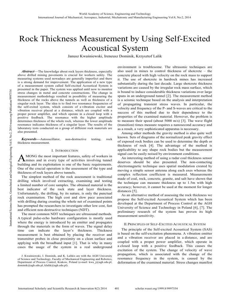 World Academy of Science, Engineering and Technology International Journal of Mechanical, Aerospace, Industrial, Mechatronic and Manufacturing Engineering Vol:8, No:2, 2014 Rock Thickness Measurement by Using Self-Excited Acoustical System Janusz Kwaśniewski, Ireneusz Dominik, Krzysztof Lalik International Science Index, Geotechnical and Geological Engineering Vol:8, No:2, 2014 waset.org/Publication/9997554 Abstract—The knowledge about rock layers thickness, especially above drilled mining pavements is crucial for workers safety. The measuring systems used nowadays are generally imperfect and there is a strong demand for improvement. The application of a new type of a measurement system called Self-excited Acoustical System is presented in the paper. The system was applied until now to monitor stress changes in metal and concrete constructions. The change in measurement methodology resulted in possibility of measuring the thickness of the rocks above the tunnels as well as thickness of a singular rock layer. The idea is to find two resonance frequencies of the self-exited system, which consists of a vibration exciter and vibration receiver placed at a distance, which are coupled with a proper power amplifier, and which operate in a closed loop with a positive feedback. The resonance with the higher amplitude determines thickness of the whole rock, whereas the lower amplitude resonance indicates thickness of a singular layer. The results of the laboratory tests conducted on a group of different rock materials are also presented. Keywords—Autooscillator, thickness measurement. non-destructive testing, rock I. INTRODUCTION A MONG the most important features, safety of workers in mines and in every type of activities involving tunnel building and its exploitation is one of the basic requirements. One of the crucial operation is the assessment of the type and thickness of rock layers above tunnels. The simplest method of the rock assessment is traditional drilling which involved extracting, examining and testing a limited number of core samples. The obtained material is the best indicator of the rock state and layer thickness. Unfortunately, the drilling, by its nature, is only the punctual rock examination. The high cost and slow pace associated with drilling during creating the whole net of examined points has prompted the researchers to investigate other low cost, fast and efficient non-destructive techniques (NDT). The most common NDT techniques are ultrasound methods. A typical pulse-echo hardware configuration is mostly used where the energy is introduced by an emitter and propagates through the materials in the form of waves. The signal delay time can indicate the layer’s thickness. Thickness measurement is best obtained by placing the receiver and transmitter probes in close proximity on a clean surface and applying with the broadband input [1]. That is why in many cases the usage of the system in a real underground J. Kwaśniewski, I. Dominik, and K. Lalikis are with the AGH University of Science and Technology, Faculty of Mechanical Engineering and Robotics, Department of Process Control, Krakow, Poland (e-mail: [email protected], [email protected], [email protected]). International Scholarly and Scientific Research & Innovation 8(2) 2014 environment is troublesome. The ultrasonic techniques are also used in mines to control thickness of shotcrete – the concrete placed with high velocity on the rock mass to support it. The use of shotcrete in hardrock mines has increased substantially during the last decade. Large shotcrete thickness variations are caused by the irregular rock mass surface, which is bound to induce considerable thickness variations over large spans in an underground tunnel [2]. The measurement method is a seismic technique based on the analysis and interpretation of propagating transient stress waves. In particular, the velocity and frequency of the P- and S-waves are critical to the success of this method due to their dependence to the properties of the examined material. However, the problem is to measure their speed (about 5000 m/s) [3]. The wave flight (transition) times measure requires a nanosecond accuracy and as a result, a very sophisticated apparatus is necessary. Among other methods the gravity method is also quite well known. Sets of diagrams of the normalized peak gravity effect of exposed rock bodies can be used to determine the depth or thickness of rock [4]. The advantage of the method is applicability to any shape rock bodies but the measurement signal can be easily noised by environment conditions. An interesting method of using a radar coal thickness sensor deserves should be also presented. The non-contacting electromagnetic technique uses spatial modulation created by moving a simple sensor antenna along each axes whereas the complex reflection coefficient is measured. Measurements made of coal, rock, concrete, granite, and salt have shown that the technique can measure thickness up to 1.5m with high accuracy; however, it cannot be used at the moment for longer distances [5]. As an alternative method of assessing the rock thickness we propose the Self-excited Acoustical System which has been developed at the Department of Process Control at the AGH University of Science and Technology in Poland [6], [7]. The preliminary research of the system has proven its high measurement sensitivity. II. PRINCIPLES OF SELF-EXCITED ACOUSTICAL SYSTEM The principle of the Self-excited Acoustical System (SAS) is based on the self-excitation phenomena. A vibration emitter and a vibration receiver are placed in a distance, and are coupled with a proper power amplifier, which operate in a closed loop with a positive feedback. This causes the excitation of the system. The change of velocity of wave propagation, which is associated with the change of the resonance frequency in the system, is caused by the deformation of the examined material. Stress changes m
