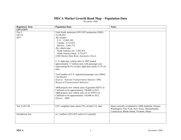 MECA Market Growth Road Map – Population Data November 2006 Regulatory Item LDVs/LDTs Tier 2 LEV II ZEV Population Data Notes Total North American LDV/LDT production (2002): 16,196,853 -By country: U.S.: 12,001,302 Canada: 2,513,836 Mexico: 1,681,715 -By vehicle type: North America car: 7,443,976 North America truck: 8,752,877 (2002 Market Data Book, Automotive News) U. S. light-duty vehicle sales in 2005 totaled approximately 17 million units with passenger cars representing 48.5% of sales, light-duty trucks 51.5% of sales Total number of U.S. registered passenger cars (2004): 136,430,651 (Source: National Transportation Statistics 2006, Bureau of Transportation Statistics) ARB projects new vehicle sales of gasoline PZEVs in California to be approximately 750,000 in 2012. ARB projects new vehicle sales of AT PZEVs in California to be approximately 150,000 in 2012. (Source: ARB) Tier 3/LEV III LEV compliant states about 25% of total U.S. sales Greenhouse Gas ca. 2 million LDV/LDT sold in CA annually MECA 1 States currently committed to ARB standards: Oregon, Washington, New York, New Jersey, Massachusetts, Connecticut, Rhode Island, Vermont, Maine November 2006 Regulatory Item Highway Motorcycles Population Data Total sales of highway motorcycles in 2000 were estimated to be 438,000. (Source: U.S. EPA NPRM, 8/02) U.S. sales of all new motorcycle reached 1,050,000 units in 2004 (Motorcycle Industry Council) In 1998, there were about 5.4 million highway motorcycles in use in the U.S. (565,000 of which are dual-sport). Total sales of highway motorcycles in 1998 were estimated to be 411,000, or about 72 percent of motorcycle sales. About 13,000 of these were dual-sport motorcycles. (Source: Motorcycle Industry Council) Light-duty Aftermarket Converters New aftermarket converters manufactured for sale in North America (2004): approximately 3.4 million (Source: MECA) Upgrade Light-duty Catalytic Converters 6-8 million 1984-1994 MY LDVs in CA (Source: conversations with Paul Hughes of ARB) MECA 2 Notes Honda, Harley Davidson, Yamaha, Kawasaki, Suzuki, and BMW account for nearly 95 percent of all motorcycles sold. Dozens of other minor players make up the remaining few percent. Based on available information, over half of all motorcycles sold in 1998 were made by Honda and Harley Davidson, with the two companies maintaining almost equal market shares of about 25 percent each 2003 market share info: Honda-27.4%; Harley-23.7%; Yamaha-17.4%; Suzuki-10.8%; Kawasaki-8.7% November 2006 Regulatory Item On-Road HDEs Phase II Population Data Notes Based on data from engine manufacturers, it was estimated that engine sales in 1995 were: -Light heavy-duty engines: 280,000 -Medium heavy-duty engines: 140,000 -Heavy heavy-duty engines: 220,000 Numbers are projected to grow at an annual rate of two percent without compounding through 2035. Therefore, estimated 2003 sales would be: -LHD: 328,066 -MHD: 164,031 -HHD: 257,765 (Source: U.S. EPA Regulatory Support Document) Market Share for Class 8 diesel engines (Source: Merrill Lynch): In April 2005 a report released by R. L. Polk & Co. analyzed new vehicle registration data from 2000 through 2004. Light heavy-duty diesel vehicle (diesel pick-ups) registrations increased from 278,136 in 2000 to 433, 787 in 2004 (56% increase) Market Share for Class 8 truck sales (Source: Merrill Lynch): In December 2005 Merrill Lynch reported Class 8 diesel truck sales for 12 months ending Nov. 30, 2005 were 299,448 units compared to 227,877 units for the same 12 month period ending Nov. 30, 2004. Class 5-7 truck sales for 12 months ending Nov. 30, 2005 were 231,946 units compared to 226,706 units for 12 months ending Nov. 30, 2004. Caterpillar Cummins DDC Mack Mercedes Navistar Volvo 2005 DC 36% PACCAR 23% Navistar 19% Volvo 19% Others 3% 3 2003 33.8% 20.5% 16.6% 10.4% 10.3% 4.3% 4.1% 2002 34.0% 23.5% 21.8% 12.3% 1.6% 4.0% 2.8% 2004 36% 26% 19% 19% 1% Market Share for Class 5-7 truck sales (Source: Merrill Lynch): Navistar DC Ford GMC PACCAR Others MECA 2004 30.2% 25.4% 18.3% 9.6% 8.3% 3.4% 4.8% 2005 27% 20% 20% 15% 4% 13% 2004 26% 20% 22% 12% 4% 16% November 2006 Regulatory Item Off-Road Engines Nonroad CI Engines Population Data Notes EPA anticipates that approximately 800,000 new nonroad diesel engines annually will be subject to the nonroad rulemaking (figure based on annual sales of nonroad diesel engines). (Source: U.S. EPA) EPA estimates that there are approximately 2 million pieces of construction equipment operating in the U.S. Projected breakdown of the number of engines to be affected annually by EPA’s nonroad rule: Rated Percentage Number of Power Breakdown Engines of 2000 Population <11 hp 6% 48,000 11-25 hp 13% 104,000 25-50 hp 17% 136,000 50-70 hp 12% 96,000 70-100 hp 20% 160,000 100-175 16% 128,000 hp 175-750 16% 128,000 hp >750 hp 0.3% 2,400 (Source: Percentage breakdown of 2000 population by U.S. EPA; Projection of number of engines by MECA) Nonroad SI Engines >25 hp -Total large SI engine sales are about 150,000 per year in the U.S. (Source: U.S. EPA) U.S. and Canada 2006 Sales Forecast for new farm wheel tractors and self propelled combines: Equipment U.S. Canada 2-wheel drive 205,834 16,575 tractors 4-wheel drive 3,401 612 tractors Combines 6,232 1,490 (Source: Association of Equipment Manufacturers) Sales are distributed rather evenly among several companies, so typical sales volumes for each company range generally from 10,000 to 25,000 engines per year. -Population of large SI engines estimated using EPA NONROAD2005 model: 442,000 -ARB estimates current lift truck population in CA at approx. 40,000 units (about 30,000 with SI engines, the rest are electric) MECA 4 November 2006 Regulatory Item Recreational SI Engines Population Data Off-Highway Motorcycles -Total sales of off-highway motorcycles in 2001 was estimated to be 195,000. (Source: U.S. EPA Regulatory Support Document, 9/02) -Population of 2-stroke off-highway motorcycles estimated using EPA 