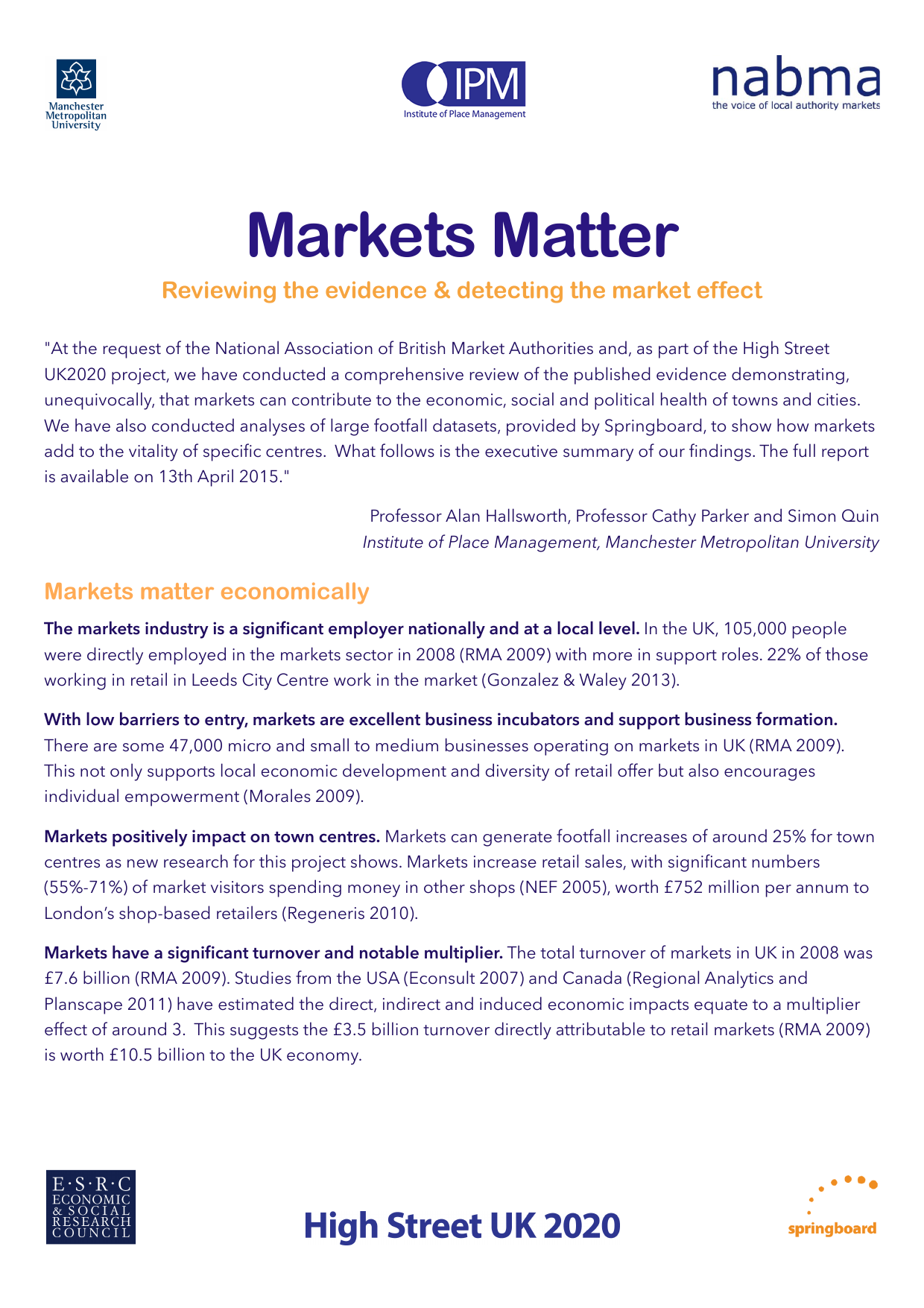 Markets Matter Reviewing the evidence & detecting the market effect "At the request of the National Association of British Market Authorities and, as part of the High Street UK2020 project, we have conducted a comprehensive review of the published evidence demonstrating, unequivocally, that markets can contribute to the economic, social and political health of towns and cities. We have also conducted analyses of large footfall datasets, provided by Springboard, to show how markets add to the vitality of specific centres. What follows is the executive summary of our findings. The full report is available on 13th April 2015." Professor Alan Hallsworth, Professor Cathy Parker and Simon Quin Institute of Place Management, Manchester Metropolitan University Markets matter economically The markets industry is a significant employer nationally and at a local level. In the UK, 105,000 people were directly employed in the markets sector in 2008 (RMA 2009) with more in support roles. 22% of those working in retail in Leeds City Centre work in the market (Gonzalez & Waley 2013). With low barriers to entry, markets are excellent business incubators and support business formation. There are some 47,000 micro and small to medium businesses operating on markets in UK (RMA 2009). This not only supports local economic development and diversity of retail offer but also encourages individual empowerment (Morales 2009). Markets positively impact on town centres. Markets can generate footfall increases of around 25% for town centres as new research for this project shows. Markets increase retail sales, with significant numbers (55%-71%) of market visitors spending money in other shops (NEF 2005), worth £752 million per annum to London’s shop-based retailers (Regeneris 2010). Markets have a significant turnover and notable multiplier. The total turnover of markets in UK in 2008 was £7.6 billion (RMA 2009). Studies from the USA (Econsult 2007) and Canada (Regional Analytics and Planscape 2011) have estimated the direct, indirect and induced economic impacts equate to a multiplier effect of around 3. This suggests the £3.5 billion turnover directly attributable to retail markets (RMA 2009) is worth £10.5 billion to the UK economy. Markets contribute financially to local activities. Municipal control of markets became commonplace in the late 19th century (Davis 1966) and 60% of markets are still run by the public sector (RMA 2009). Income from markets supports wider local authority services (Gonzalez & Waley 2013). Markets support inter and intra-generational economic mobility. Many market traders are family businesses and employ extended family members on either a part or full-time basis (Eshel & Schatz 2004, Morales 2011) and the emergence of youth markets and the ‘teenage market’ is generating income for young people (Teenagemarket nd, NMTF nd). Markets provide employment and self-employment opportunities that are open to all. Markets provide entry-level employment that can assist relatively unskilled or under-capitalized individuals and have proved attractive to immigrant communities (Balkin 1989, Tangires 2003, Morales 2009, Regeneris 2010). Markets create multi-use and multi-scale economic environments, promoting commerce and competition. Through markets, small and micro businesses have direct access not just to individual consumers but to larger businesses to whom they can become suppliers. This provides diversity of offer and encourages colocation (Morales & Kettles 2009, Nicholson 2009, Morales 2011) and competition. Markets contribute to making other businesses viable. There can be significant earnings for farmers who attended markets (FoE 2000, Brown & Miller 2008) with increased profit margins (DEFRA 2012), whilst these and other markets offer income opportunities for local businesses that contribute to the their sustainability (Morales 2011). Markets increase town centre resilience. Resilient towns respond and adapt to change (ATCM & CLES, 2015). Representing more flexible and adaptable retail space, markets can respond quickly, satisfying the current trend for an increased convenience offer, for example. Markets provide access to affordable goods. Shoppers identified ‘price’ as the main reason for shopping in some of London’s traditional markets (NEF 2005) and low-income shoppers ‘rely on their affordability’ (Gonzalez & Waley 2013). Market prices are consistently lower than supermarkets (Regeneris 2010). Markets attract tourists. They are “unique, quirky, unusual and always a bargain” according to VisitBritain (nd), with a distinct atmosphere (NEF 2005). Markets offer an enhanced tourist experience as they allow visitors to take part in the everyday life of the place they are visiting (Pappalepore, Maitland & Smith 2014). Markets matter socially Markets are places of social interaction. Used by all sections of society, markets are where people of different incomes, ages, genders and cultures can meet together and interact (Tangires 2003, Watson & Studdert 2006). They are the happy ‘third place’ of spontaneous interaction (Oldenburg 1988). Markets facilitate community cohesion and social inclusion. Because of the ease of becoming a trader, markets have traditionally been attractive to new arrivals. They encourage newcomers to become part of the community (Morales 2000, Tangires 2003) and are spaces of diversity (Watson & Studdert 2006). Markets are crucial to the distinct identity of a town or area. From Market Rasen and Downham Market to the ‘modern market town’ that Altrincham prides itself on being, markets are emblematic of many places. They embody a community and set it apart from those without such an asset. They are a key part of the experiential identity of the place (Kavaratzis & Ashworth 2006) and enhance the city image (Morales 2009). Markets animate vacant or underused space. Whether in street, market place or vacant lot, markets create vitality and anima