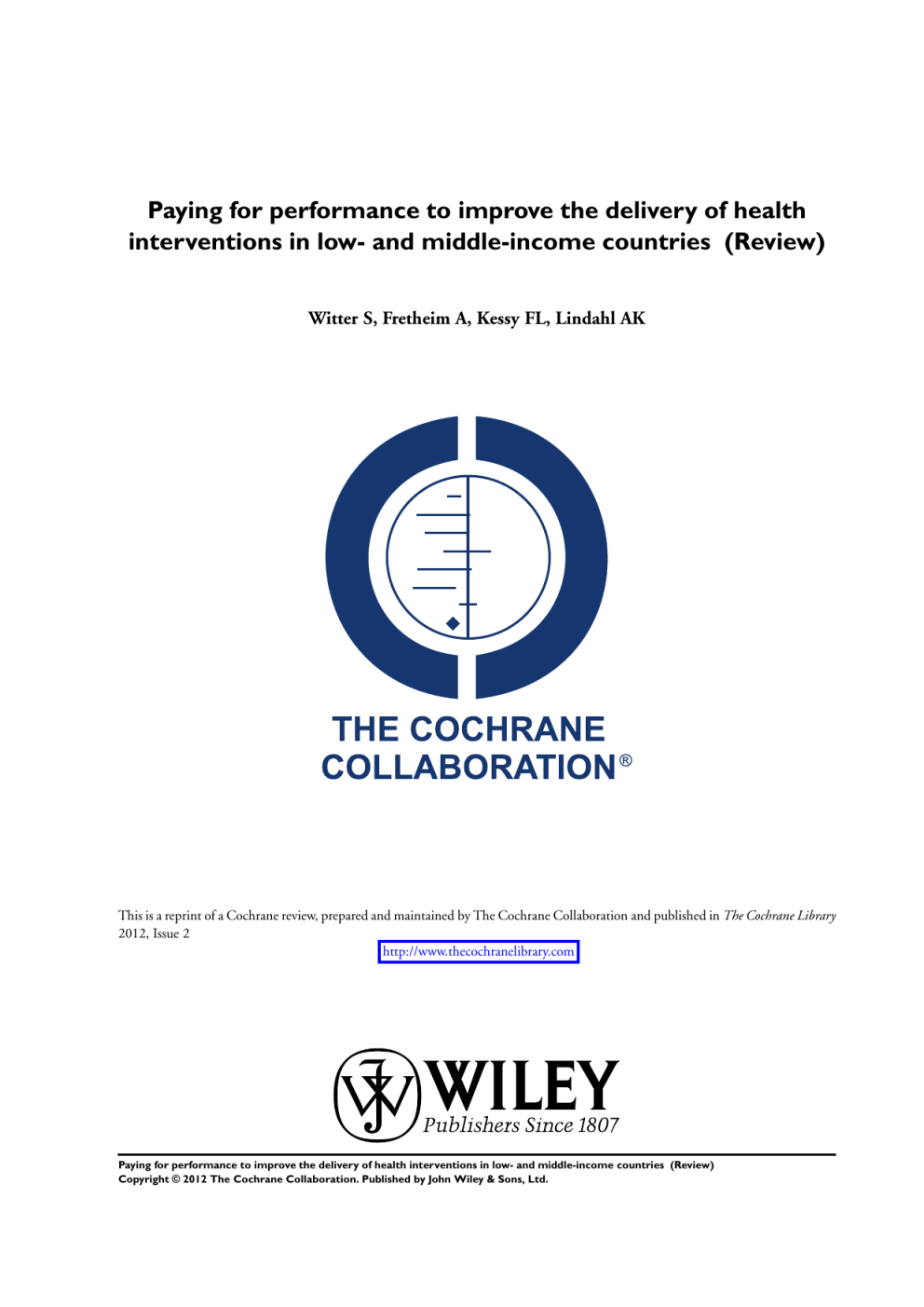 Paying for performance to improve the delivery of health interventions in low- and middle-income countries (Review) Witter S, Fretheim A, Kessy FL, Lindahl AK This is a reprint of a Cochrane review, prepared and maintained by The Cochrane Collaboration and published in The Cochrane Library 2012, Issue 2 http://www.thecochranelibrary.com Paying for performance to improve the delivery of health interventions in low- and middle-income countries (Review) Copyright © 2012 The Cochrane Collaboration. Published by John Wiley & Sons, Ltd. TABLE OF CONTENTS HEADER . . . . . . . . . . . . . . . . . . . . ABSTRACT . . . . . . . . . . . . . . . . . . . PLAIN LANGUAGE SUMMARY . . . . . . . . . . . SUMMARY OF FINDINGS FOR THE MAIN COMPARISON BACKGROUND . . . . . . . . . . . . . . . . . OBJECTIVES . . . . . . . . . . . . . . . . . . METHODS . . . . . . . . . . . . . . . . . . . RESULTS . . . . . . . . . . . . . . . . . . . . DISCUSSION . . . . . . . . . . . . . . . . . . AUTHORS’ CONCLUSIONS . . . . . . . . . . . . ACKNOWLEDGEMENTS . . . . . . . . . . . . . REFERENCES . . . . . . . . . . . . . . . . . . CHARACTERISTICS OF STUDIES . . . . . . . . . . DATA AND ANALYSES . . . . . . . . . . . . . . . ADDITIONAL TABLES . . . . . . . . . . . . . . . APPENDICES . . . . . . . . . . . . . . . . . . HISTORY . . . . . . . . . . . . . . . . . . . . CONTRIBUTIONS OF AUTHORS . . . . . . . . . . DECLARATIONS OF INTEREST . . . . . . . . . . . SOURCES OF SUPPORT . . . . . . . . . . . . . . DIFFERENCES BETWEEN PROTOCOL AND REVIEW . . . . . . . . . . . . . . . . . . . . . . . . . . . . . . . . . . . . . . . . . . . . . . . . . . . . . . . . . . . . . . . . . . . . . . . . . . . . . . . . . . . . . . . . . . . . . . . . . . . . . . . . . . . . . . . . . . . . . . . . . . . . . . . . . . . . . . . . . . . . . . . . . . . . . . . . . . . . . . . . . . . . . . . . . . . . . . . . . . . . . . . . . . . . . . . . . . . . . . . . . . . . . . . . . . . . . . . . . . . . . . . . . . . . . . . . . . . . . . . . . . . . . . . . . . . . . . . . . . . . . . . . . . . . . . . . . . . . . . . . . . . . . . . . . . . . . . . . . . . . . . . . . . . . . . . . . . . . . Paying for performance to improve the delivery of health interventions in low- and middle-income countries (Review) Copyright © 2012 The Cochrane Collaboration. Published by John Wiley & Sons, Ltd. . . . . . . . . . . . . . . . . . . . . . . . . . . . . . . . . . . . . . . . . . . . . . . . . . . . . . . . . . . . . . . . . . . . . . . . . . . . . . . . . . . . . 1 1 2 3 5 7 7 11 15 17 18 18 20 34 34 72 80 80 81 81 81 i [Intervention Review] Paying for performance to improve the delivery of health interventions in low- and middle-income countries Sophie Witter1 , Atle Fretheim2,5 , Flora L Kessy3 , Anne Karin Lindahl4 1 Immpact, University of Aberdeen, Aberdeen, UK. 2 Global Health Unit, Norwegian Knowledge Centre for the Health Services, Oslo, Norway. 3 Ifakara Health Institute (IHI), Dar es Salaam, Tanzania. 4 Norwegian Knowledge Centre for the Health Services, Oslo, Norway. 5 Institute of Health and Society, University of Oslo, Oslo, Norway Contact address: Sophie Witter, Immpact, University of Aberdeen, Health Sciences Building, Foresterhill, Aberdeen, AB25 2DZ, UK. [email protected]. Editorial group: Cochrane Effective Practice and Organisation of Care Group. Publication status and date: New, published in Issue 2, 2012. Review content assessed as up-to-date: 15 November 2011. Citation: Witter S, Fretheim A, Kessy FL, Lindahl AK. Paying for performance to improve the delivery of health interventions in low- and middle-income countries . Cochrane Database of Systematic Reviews 2012, Issue 2. Art. No.: CD007899. DOI: 10.1002/14651858.CD007899.pub2. Copyright © 2012 The Cochrane Collaboration. Published by John Wiley & Sons, Ltd. ABSTRACT Background There is a growing interest in paying for performance as a means to align the incentives of health workers and health providers with public health goals. However, there is currently a lack of rigorous evidence on the effectiveness of these strategies in improving health care and health, particularly in low- and middle-income countries. Moreover, paying for performance is a complex intervention with uncertain benefits and potential harms. A review of evidence on effectiveness is therefore timely, especially as this is an area of growing interest for funders and governments. Objectives To assess the current evidence for the effects of paying for performance on the provision of health care and health outcomes in lowand middle-income countries. Search methods We searched more than 15 databases in 2009, including the Cochrane Effective Practice and Organisation of Care Group Specialised Register (searched 3 March 2009), CENTRAL (2009, Issue 1) (searched 3 March 2009), MEDLINE, Ovid (1948 to present) (searched 24 June 2011), EMBASE, Ovid (1980 to 2009 Week 09) (searched 2 March 2009), EconLit, Ovid (1969 to February 2009) (searched 5 March 2009), as well as the Social Sciences Citation Index, ISI Web of Science (1975 to present) (searched 8 September 2010). We also searched the websites and online resources of numerous international agencies, organisations and universities to find relevant grey literature and contacted experts in the field. We carried out an updated search on the Results-Based Financing website in April 2011, and re-ran the MEDLINE search in June 2011. Selection criteria Pay for performance refers to the transfer of money or material goods conditional on taking a measurable action or achieving a predetermined performance target. To be included, a study had to report at least one of the following outcomes: changes in targeted measures of provider performance, such as the delivery or utilisation of healthcare services, or patient outcomes, unintended effects and/or changes in resource use. Studies also needed to use one of the following study designs: randomised trial, non-randomised trial, Paying for performance