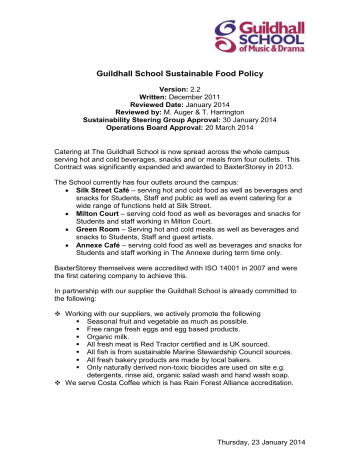 Guildhall School Sustainable Food Policy Version: 2.2 Written: December 2011 Reviewed Date: January 2014 Reviewed by: M. Auger & T. Harrington Sustainability Steering Group Approval: 30 January 2014 Operations Board Approval: 20 March 2014 Catering at The Guildhall School is now spread across the whole campus serving hot and cold beverages, snacks and or meals from four outlets. This Contract was significantly expanded and awarded to BaxterStorey in 2013. The School currently has four outlets around the campus: Silk Street Café – serving hot and cold food as well as beverages and snacks for Students, Staff and public as well as event catering for a wide range of functions held at Silk Street. Milton Court – serving cold food as well as beverages and snacks for Students and staff working in Milton Court. Green Room – Serving hot and cold meals as well as beverages and snacks to Students, Staff and guest artists. Annexe Café – serving cold food as well as beverages and snacks for Students and staff working in The Annexe during term time only. BaxterStorey themselves were accredited with ISO 14001 in 2007 and were the first catering company to achieve this. In partnership with our supplier the Guildhall School is already committed to the following: Working with our suppliers, we actively promote the following Seasonal fruit and vegetable as much as possible. Free range fresh eggs and egg based products. Organic milk. All fresh meat is Red Tractor certified and is UK sourced. All fish is from sustainable Marine Stewardship Council sources. All fresh bakery products are made by local bakers. Only naturally derived non-toxic biocides are used on site e.g. detergents, rinse aid, organic salad wash and hand wash soap. We serve Costa Coffee which is has Rain Forest Alliance accreditation. Thursday, 23 January 2014 Fair Trade products currently available include the following: Bananas Orange/Apple Juice (Vending – Cartons) Juice Burst fruit drinks Confectionery Kit Kat Cookies Flapjack To further improve our current efforts in respect of the sustainability of the catering provision at the Guildhall School we aim to, in partnership with BaxterStorey, achieve the following targets: Completion date Item Detail 1 All waste food from the café will be composted for the School’s flower beds. March 2012 2 Subject to the results of a student and staff survey carried out by BaxterStorey we are planning to serve only organic milk. April 2012 3 BaxterStorey will collect sales data to establish a baseline of sales data for Fairtrade products with a view to improving sales. August 2014 4 BaxterStorey to establish a baseline percentage of locally sourced products with a view to increasing this and reducing food miles. August 2014 5 BaxterStorey will collect sales data to establish a baseline of sales data for fresh fruit with a view to promoting healthy eating. August 2014 Update Status Most food waste from the café is composted for the School’s roof garden. Completed (Apr 2012) implemented Completed (Apr 2012) Thursday, 23 January 2014