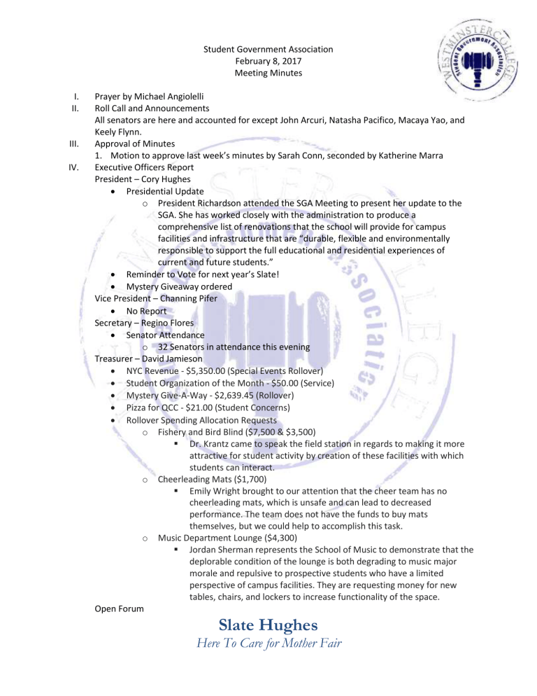 Student Government Association February 8, 2017 Meeting Minutes I. II. III. IV. Prayer by Michael Angiolelli Roll Call and Announcements All senators are here and accounted for except John Arcuri, Natasha Pacifico, Macaya Yao, and Keely Flynn. Approval of Minutes 1. Motion to approve last week’s minutes by Sarah Conn, seconded by Katherine Marra Executive Officers Report President – Cory Hughes Presidential Update o President Richardson attended the SGA Meeting to present her update to the SGA. She has worked closely with the administration to produce a comprehensive list of renovations that the school will provide for campus facilities and infrastructure that are “durable, flexible and environmentally responsible to support the full educational and residential experiences of current and future students.” Reminder to Vote for next year’s Slate! Mystery Giveaway ordered Vice President – Channing Pifer No Report Secretary – Regino Flores Senator Attendance o 32 Senators in attendance this evening Treasurer – David Jamieson NYC Revenue - $5,350.00 (Special Events Rollover) Student Organization of the Month - $50.00 (Service) Mystery Give-A-Way - $2,639.45 (Rollover) Pizza for QCC - $21.00 (Student Concerns) Rollover Spending Allocation Requests o Fishery and Bird Blind ($7,500 & $3,500) Dr. Krantz came to speak the field station in regards to making it more attractive for student activity by creation of these facilities with which students can interact. o Cheerleading Mats ($1,700) Emily Wright brought to our attention that the cheer team has no cheerleading mats, which is unsafe and can lead to decreased performance. The team does not have the funds to buy mats themselves, but we could help to accomplish this task. o Music Department Lounge ($4,300) Jordan Sherman represents the School of Music to demonstrate that the deplorable condition of the lounge is both degrading to music major morale and repulsive to prospective students who have a limited perspective of campus facilities. They are requesting money for new tables, chairs, and lockers to increase functionality of the space. Open Forum Slate Hughes Here To Care for Mother Fair Committee Meetings Finance – Carl Carpenter Carillon Club Allocation Vote Model UN Allocation Vote Academics – Anna Daniels URAC Committee met o Discussed NCUR in Memphis and which students will be attending o One student will be selected to attend the undergraduate research council of the capitol, in Harrisburg. o There will also be a pilot program for a student do participate in a 4-week research project over the summer to do research with a professor of their choice. o Three names will be picked for the McGee women’s institute genetics lab. o They finished planning URAC for March 1. Keynote speaker has been selected. Advertisements for academic clubs are being accepted for the URAC programs as well. Curriculum committee approved art IP for African Art class. VPAA SGA Lunch o Surveys will be sent out to review the candidates after lunch Diversity – Jordan Sherman Women’s Drive Donation Total o Donation of over 1,000 items (totaling over $300) o Additional $20 donation o Thank you to everybody who participated; it was a very meaningful effort Special Events – Heaven Brown NYC Waivers Due o Must be completed if you are attending NYC Trip. Otherwise, your spot in the trip will be forfeited. Please come to the SGA office during Slate office hours or e-mail Heaven Brown for a link at [email protected] Service- Chloe Knappenberger Caity Kourakos received a thank-you letter from operation gratitude o “Every box, every piece of paper…means a lot to us when we are away from home.” o Thank you to everybody who participated in writing letters to the Troops o God Bless America Student Concerns – Chris Israel Student Concerns o Different style oven compared to the panini presses Alternative ovens would price around $10,000 – not in budget for Sodexo Tanner Easley willing to donate toaster oven FAC o Jeff Creveling spoke about future plans for food service, including shifting lunch hours in Duff, or possibly extending to accommodate more students’ schedules. o National Pizza Pie day tomorrow Public Relations – Amelia Hartzell SGA Banquet Slate Hughes Here To Care for Mother Fair V. VI. VII. VIII. o Received 26 senator RSVPs for the banquet o February 15th at 5 P.M. o SGA Senators invited for steak or chicken dinner o Please respond to your invitation! o Business Casual attire Old Business New Business a. Motion by Anthony Easley to discuss rollover budget ideas, seconded by Jen Piascik i. Vote to approve suggested list by Slate? Or each individual item on list? ii. Costs were assessed for all ideas presented and these choices were made to iii. Motion by Marissa Miller to close discussion, seconded by Sarah Conn b. Motion to vote for ability to vote by acclamation (vote for rollover items as Slate has presented them) by Anthony Easley, seconded by Kat Marra. i. Motion passes by a majority of the senate c. Motion to vote on Rollover package by Sarah Conn, seconded by Kelsey Smith i. Motion passes by a majority of the senate d. Motion by Kelsey Smith to vote on Carillon allocation, seconded by Wells Powell i. Motion passes by a majority of the senate e. Motion by Trevor Arrigoni to vote for model UN allocation, seconded by Emily Eyler. i. Motion passes by a majority of the senate Open Floor a. February 23, 24, 25 Theater Westminster is presenting the world premiere of “The NotSo-Final Problem” a murder, mystery, and murder-mystery based play. Get your free ticket b. Sigma Tau Delta and Scrawl are hosting a poetry slam on c. CPC is hosting “Dating with Dave” this Saturday. He is a famous comedian, come support and have a good evening! d. Westminster Swimming PACS at Grove City this weekend e. This Saturday, 8 music majors are in the PA intercollegiate honors festival at Grove City with a free 1:30 P.M. concert f. ZTA is hosting