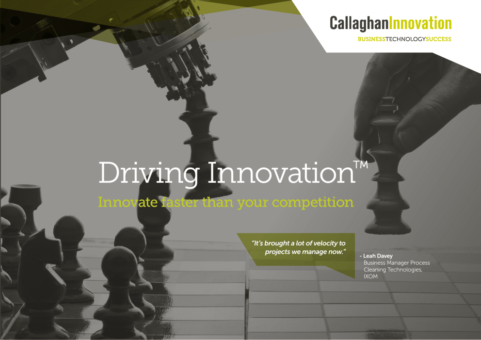 Driving Innovation ™ Innovate faster than your competition “It’s brought a lot of velocity to projects we manage now.” - Leah Davey Business Manager Process Cleaning Technologies, IXOM Driving innovation 1 Driving Innovation™ is a programme designed to increase the pace of innovation by changing traditional product development methods. Driving Innovation 2 What is ™ Driving Innovation ? Driving Innovation is a 12 month in-business skills development programme designed to help NZ businesses to increase both the value and rate of their innovation efforts. Through an iterative coaching approach Agile principles will be taught and embedded to establish world-leading innovation disciplines in complex product development environments. The programme delivers up to 200 hours of in-business support for a total cost of $40,000 plus GST. Callaghan Innovation will fund 50% of this cost. Key Deliverables: Driving Innovation will deliver the following outcomes: Appeal: Maximise the value delivered to consumers. Profitability: Maximise your value captured by your business. ROI: Maximise your Return on Innovation investment. Outpace the Competition: Accelerate product development. Growth Mind-set: Embed agile innovation as a business discipline. Rapid Validation: Reduce portfolio waste and risk. Driving Innovation™ 3 Who should do ™ Driving Innovation ? Established and growing businesses with 20+ FTE’s that need to: Assess the current innovation practices, capability and performance in your business.. Increase the pace of innovation by changing traditional product development methods. Find and maximise value through testing and validation. Provide coaching and insight to maximise business outcomes from the programme. Embed new innovation practices in the business to drive long term changes and capability. Driving Innovation™ 4 Outcomes Common Issues Driving Innovation Getting ideas to market can be slow or unpredictable. Ideas have a clear path to market and progress can be monitored. Product Development Velocity is unclear. Product development velocity can be measured. Factors that affect speed are not clear or visible. Organisational impediments are visible. Changing direction in response to new environmental factors can be challenging or nearly impossible. Responding to change is easier with a clear process. Cost of change can be high. The cost of change can be measured and managed down. Decision lag can lead to compounding problems. Decision lag can be measured and systematically reduced. Lagging indicators for market misalignments. You’re the last to know when there’s a customer experience problem. Organisational needs come first… customer needs are an after-thought. More Speed More Agility Better Market Fit Risk management is focused on minimizing losses rather than maximising gains. This tends to amplify risk by stifling innovation and slowing execution. Excessive work-in-progress leads to low throughput and process waste. Organisation tends to be busy as opposed to productive. Less Uncertainty Less Waste Customer experience and market need is the primary focus. Provides leading indicators of market misalignments. Early detection of customer issues. Creating Value Propositions is the norm. Continuous gap elimination at the core. Uncertainty management is focused on maximizing gains. Uncertainty is retired early through rapid execution loops and fast feedback. Processes and people become value focussed and waste repellent. Projects have defined start and completion criteria (eliminating the meandering finish and the ambiguous start- significant sources of waste). Driving Innovation™ 5 Process Overview Discuss Statement of Works Callaghan Innovation and the business meet to discuss the value in undertaking the Driving Innovation process. Provider to supply a Statement of Works to the client business. The client business is to agree and sign before co-funding agreement can be approved and signed. Engagement Phase Program Phase 1 Discovery Set the platform for the “Driving Innovation” programme including creating urgency for change and identifying key directions and objectives. Review point After the Discovery phase, a project review will take place. 2 Agreement Once agreement has been reached to proceed a CoFunding Agreement is signed by Callaghan Innovation and the client business. Challenge Directly question and challenge the status quo in order to find a new and improved ‘normal’ and introduce new organisational practices. Service provider Once the Agreement is in place the appointed Service Provider works with the Company to engage with the appropriate staff and thought leaders within the Company. 3 Consolidate Institutionalise new practices and build the platform for ongoing change and improvement. 4 Integrate Create opportunities for ongoing engagement, networking and knowledge sharing. Driving Innovation™ 6 Programme Details Approach Meetings with leadership team to understand: • What’s working and what’s not working. 1 • The existing business and “context.” Discovery • The key people, roles and responsibilities. Outcomes Outputs A benchmark of the current innovation practices and performance. 2 to 3 introduction workshops to set the working relationship up. An agreed set of overall engagement objectives. Innovation Fundamentals workshop to introduce a basic set of tools and techniques: Business Model Canvas, Agile methods, Innovation Governance framework, Value Proposition design. • Immediate innovation goals. • Preferred approach. • Innovation Fundamentals Workshop (1 day). Time Frame, Cost and Engagement 2 to 3 weeks Resources Callaghan Innovation advisor and Customer Manager Senior company leaders 35 hours of engagement Project team $7,000 Wider business team Callaghan Innovation advisor and Customer Manager Review point Leadership Team 2 Challenge Introduce a Delivery Coach to the organisation. The company has overcome the inertia