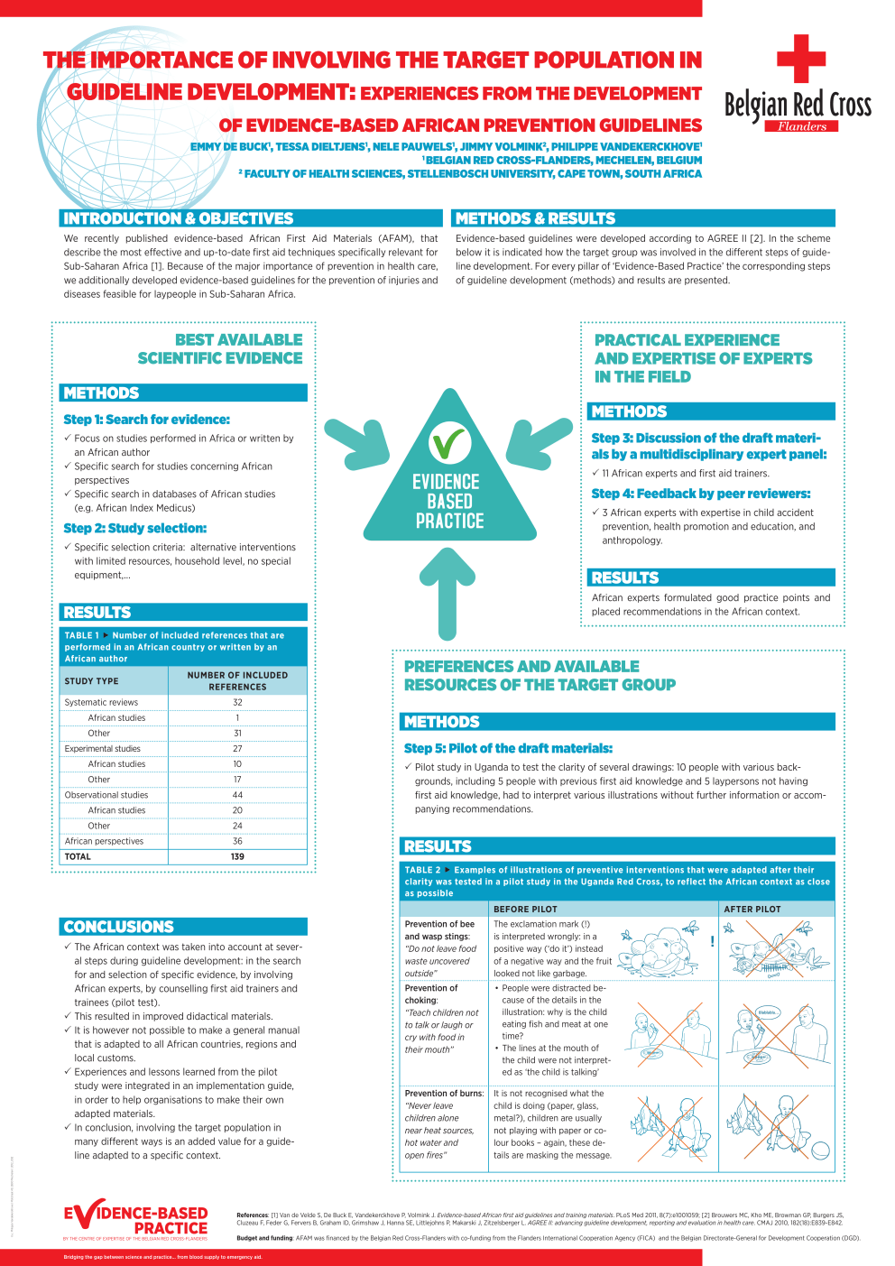 THE IMPORTANCE OF INVOLVING THE TARGET POPULATION IN GUIDELINE DEVELOPMENT: EXPERIENCES FROM THE DEVELOPMENT OF EVIDENCE-BASED AFRICAN PREVENTION GUIDELINES EMMY DE BUCK1, TESSA DIELTJENS1, NELE PAUWELS1, JIMMY VOLMINK2, PHILIPPE VANDEKERCKHOVE1 1 BELGIAN RED CROSS-FLANDERS, MECHELEN, BELGIUM 2 FACULTY OF HEALTH SCIENCES, STELLENBOSCH UNIVERSITY, CAPE TOWN, SOUTH AFRICA INTRODUCTION & OBJECTIVES METHODS & RESULTS We recently published evidence-based African First Aid Materials (AFAM), that describe the most effective and up-to-date first aid techniques specifically relevant for Sub-Saharan Africa [1]. Because of the major importance of prevention in health care, we additionally developed evidence-based guidelines for the prevention of injuries and diseases feasible for laypeople in Sub-Saharan Africa. Evidence-based guidelines were developed according to AGREE II [2]. In the scheme below it is indicated how the target group was involved in the different steps of guideline development. For every pillar of ‘Evidence-Based Practice’ the corresponding steps of guideline development (methods) and results are presented. BEST AVAILABLE SCIENTIFIC EVIDENCE PRACTICAL EXPERIENCE AND EXPERTISE OF EXPERTS IN THE FIELD METHODS METHODS Step 1: Search for evidence: Step 3: Discussion of the draft materials by a multidisciplinary expert panel: 33Focus on studies performed in Africa or written by an African author 33Specific search for studies concerning African perspectives 33Specific search in databases of African studies (e.g. African Index Medicus) 3311 African experts and first aid trainers. Step 4: Feedback by peer reviewers: 333 African experts with expertise in child accident prevention, health promotion and education, and anthropology. Step 2: Study selection: 33Specific selection criteria: alternative interventions with limited resources, household level, no special equipment,... RESULTS African experts formulated good practice points and placed recommendations in the African context. RESULTS TABLE 1 Number of included references that are performed in an African country or written by an African author STUDY TYPE NUMBER OF INCLUDED REFERENCES Systematic reviews PREFERENCES AND AVAILABLE RESOURCES OF THE TARGET GROUP 32 African studies 1 Other 31 METHODS 27 Step 5: Pilot of the draft materials: African studies 10 Other 17 33Pilot study in Uganda to test the clarity of several drawings: 10 people with various backgrounds, including 5 people with previous first aid knowledge and 5 laypersons not having first aid knowledge, had to interpret various illustrations without further information or accompanying recommendations. Experimental studies Observational studies 44 African studies 20 Other 24 African perspectives 36 TOTAL 139 RESULTS TABLE 2 Examples of illustrations of preventive interventions that were adapted after their clarity was tested in a pilot study in the Uganda Red Cross, to reflect the African context as close as possible BEFORE PILOT V.u.: Philippe Vandekerckhove | Motstraat 40, 2800 Mechelen | 2012_092 CONCLUSIONS 33The African context was taken into account at several steps during guideline development: in the search for and selection of specific evidence, by involving African experts, by counselling first aid trainers and trainees (pilot test). 33This resulted in improved didactical materials. 33It is however not possible to make a general manual that is adapted to all African countries, regions and local customs. 33Experiences and lessons learned from the pilot study were integrated in an implementation guide, in order to help organisations to make their own adapted materials. 33In conclusion, involving the target population in many different ways is an added value for a guideline adapted to a specific context. E IDENCE-BASED PRACTICE BY THE CENTRE OF EXPERTISE OF THE BELGIAN RED CROSS-FLANDERS Prevention of bee and wasp stings: “Do not leave food waste uncovered outside” The exclamation mark (!) is interpreted wrongly: in a positive way (‘do it’) instead of a negative way and the fruit looked not like garbage. Prevention of choking: “Teach children not to talk or laugh or cry with food in their mouth” • People were distracted because of the details in the illustration: why is the child eating fish and meat at one time? • The lines at the mouth of the child were not interpreted as ‘the child is talking’ Prevention of burns: “Never leave children alone near heat sources, hot water and open fires” It is not recognised what the child is doing (paper, glass, metal?), children are usually not playing with paper or colour books – again, these details are masking the message. AFTER PILOT References: [1] Van de Velde S, De Buck E, Vandekerckhove P, Volmink J. Evidence-based African first aid guidelines and training materials. PLoS Med 2011, 8(7):e1001059; [2] Brouwers MC, Kho ME, Browman GP, Burgers JS, Cluzeau F, Feder G, Fervers B, Graham ID, Grimshaw J, Hanna SE, Littlejohns P, Makarski J, Zitzelsberger L. AGREE II: advancing guideline development, reporting and evaluation in health care. CMAJ 2010, 182(18):E839-E842. Budget and funding: AFAM was financed by the Belgian Red Cross-Flanders with co-funding from the Flanders International Cooperation Agency (FICA) and the Belgian Directorate-General for Development Cooperation (DGD). Bridging the gap between science and practice... from blood supply to emergency aid.