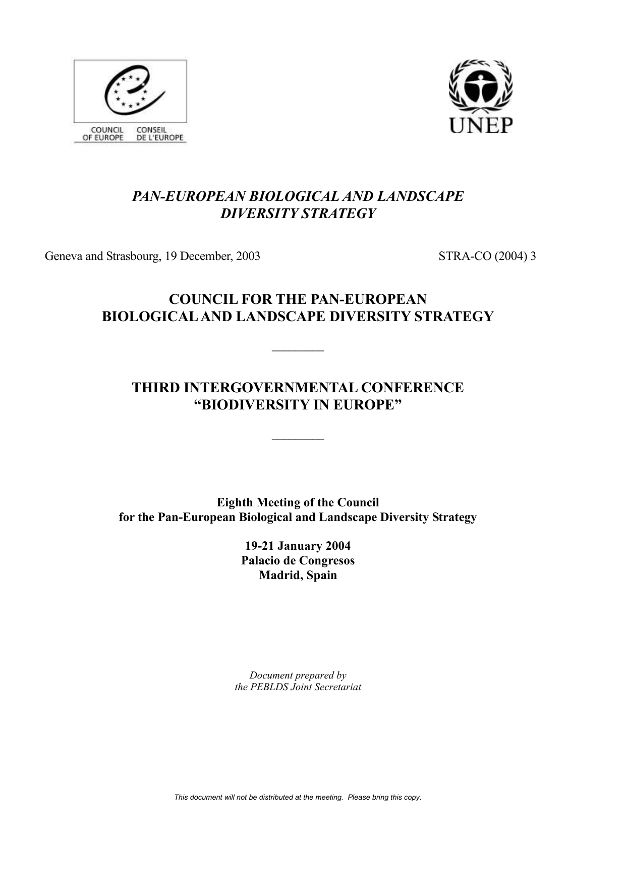 PAN-EUROPEAN BIOLOGICAL AND LANDSCAPE DIVERSITY STRATEGY Geneva and Strasbourg, 19 December, 2003 STRA-CO (2004) 3 COUNCIL FOR THE PAN-EUROPEAN BIOLOGICAL AND LANDSCAPE DIVERSITY STRATEGY _________ THIRD INTERGOVERNMENTAL CONFERENCE “BIODIVERSITY IN EUROPE” _________ Eighth Meeting of the Council for the Pan-European Biological and Landscape Diversity Strategy 19-21 January 2004 Palacio de Congresos Madrid, Spain Document prepared by the PEBLDS Joint Secretariat This document will not be distributed at the meeting. Please bring this copy. STRA CO (2004) 3 Introduction The Governments of the Czech Republic, the Netherlands, and Norway; the Council of Europe, the European Environment Agency, and the United Nations Environment Programme; the European Centre for Nature Conservation, the World Conservation Union-IUCN, and the Central and Eastern European Working Group for the Enhancement of Biodiversity, have all collaborated in the development of seven action plan proposals to present to the PEBLDS Council. The proposals specify the crucial actions and interventions needed for action through the PEBLDS to achieve the targets set out in the Kyiv Biodiversity Resolution, adopted by the PEBLDS Council and the European Ministers at the Kyiv Ministerial Conference this year. In this regard, the PEBLDS Council may recall that it was agreed to reach the target of halting the loss of biological diversity at all levels by the year 2010 and to do this by committing jointly to achieve nine key targets: Forests and biodiversity: 1. By 2008, contribute to the implementation in the pan European region of the Forest Biodiversity Expanded Programme of Work of the Convention on Biological Diversity through, inter alia: a) Implementation of the objectives and activities of the Framework for Co-operation between the Ministerial Conference on the Protection of Forests in Europe and the Environment for Europe/Pan European Biological and Landscape Diversity Strategy; b) National Forest Programmes according to the MCPFE Approach to National Forest Programmes in Europe (adopted at the Vienna Conference in April 2003); c) Application of the ecosystem approach. Agriculture and biodiversity: 2. By 2006, the identification, using agreed common criteria, of all high nature value areas in agricultural ecosystems in the pan European region will be complete. By 2008, a substantial proportion of these areas will be under biodiversity-sensitive management by using appropriate mechanisms such as rural development instruments, agri-environmental programmes and organic agriculture, to inter alia support their economic and ecological viability. 3. By 2008, financial subsidy and incentive schemes for agriculture in the pan European region will take the conservation and sustainable use of biodiversity in consideration. Pan European Ecological Network: 4. By 2006, the Pan-European Ecological Network (core areas, restoration areas, corridors and buffer zones, as appropriate) in all States of the pan European region will be identified and reflected on coherent indicative European maps, as a European contribution towards a global ecological network. 5. By 2008, all core areas of the Pan-European Ecological Network will be adequately conserved and the Pan European Ecological Network will give guidance to all major national, regional and international land use and planning policies as well as to the operations of relevant economic and financial sectors. Invasive Alien Species: 6. By 2008, the pan European Strategy on Invasive Alien Species developed under the Bern Convention, fully compatible with the Guiding Principles of the Convention on Biological Diversity, will be implemented by at least half of the countries of the pan European region through their respective Biodiversity Strategies and Action Plans. 2 STRA CO (2004) 12 Financing Biodiversity: 7. By 2008, there will be substantially increased public and private financial investments in integrated biodiversity activities in Europe, via partnerships with the finance and business sectors, that have resulted in new investment opportunities and facilities as outlined by the European Biodiversity Resourcing Initiative, taking into account the special needs of the countries of Central and Eastern Europe, Caucasus and Central Asia. Biodiversity Monitoring and Indicators: 8. By 2008, a coherent European programme on biodiversity monitoring and reporting, facilitated by the European Biodiversity Monitoring and Indicator Framework, will be operational in the pan European region, in support of nature and biodiversity policies, including by 2006 an agreed core set of biodiversity indicators developed with the active participation of the relevant stakeholders. Public Participation and Awareness: 9. By 2008, at least half of the countries in the pan European region are implementing national Communication, Education and Public Awareness action plans, in line with the CBD’s Global Initiative on Communication, Education and Public Awareness, in order to communicate biodiversity and landscape policies and to increase multi-stakeholder participation, particularly indigenous and local communities, in their implementation. Reaching the key targets and the overall 2010 target requires a broad spectrum of action at the national and regional levels. Actions at the national level should focus on the implementation of crucial elements of the national biodiversity strategies including tackling problems of a trans-boundary nature and participation in (sub) regional and international negotiations aimed at creating the right environment and incentives for biodiversity conservation. There are many international fora (PEBLDS; CBD; EU/EEA groups, WTO committees, etc.) and instruments (Global Environment Facility, the UNEP/ECNC/IUCN/REC Biodiversity Service, etc.) that exist to help PEBLDS countries to reach each of the targets. The action plan proposals highlight and address some core elements that best can