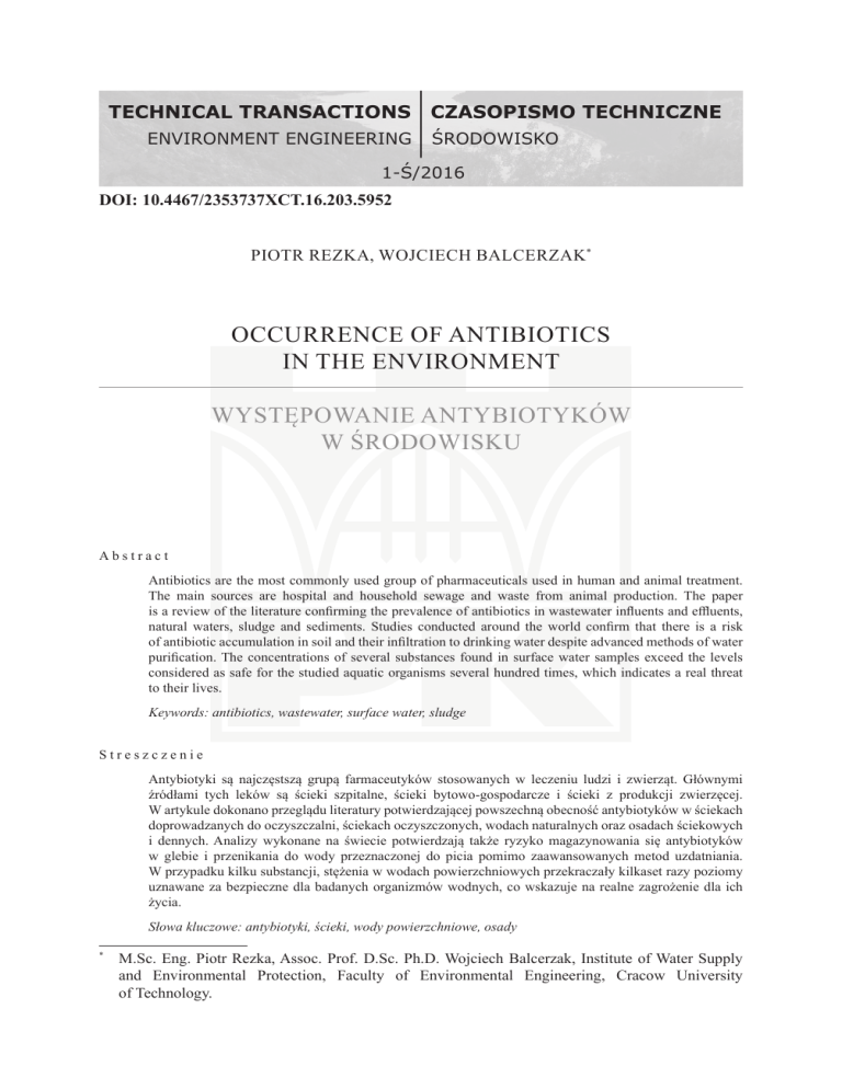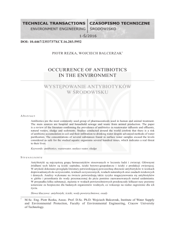 DOI: 10.4467/2353737XCT.16.203.5952 PIOTR REZKA, WOJCIECH BALCERZAK* OCCURRENCE OF ANTIBIOTICS IN THE ENVIRONMENT WYSTĘPOWANIE ANTYBIOTYKÓW W ŚRODOWISKU Abstract Antibiotics are the most commonly used group of pharmaceuticals used in human and animal treatment. The main sources are hospital and household sewage and waste from animal production. The paper is a review of the literature confirming the prevalence of antibiotics in wastewater influents and effluents, natural waters, sludge and sediments. Studies conducted around the world confirm that there is a risk of antibiotic accumulation in soil and their infiltration to drinking water despite advanced methods of water purification. The concentrations of several substances found in surface water samples exceed the levels considered as safe for the studied aquatic organisms several hundred times, which indicates a real threat to their lives. Keywords: antibiotics, wastewater, surface water, sludge Streszczenie Antybiotyki są najczęstszą grupą farmaceutyków stosowanych w leczeniu ludzi i zwierząt. Głównymi źródłami tych leków są ścieki szpitalne, ścieki bytowo-gospodarcze i ścieki z produkcji zwierzęcej. W artykule dokonano przeglądu literatury potwierdzającej powszechną obecność antybiotyków w ściekach doprowadzanych do oczyszczalni, ściekach oczyszczonych, wodach naturalnych oraz osadach ściekowych i dennych. Analizy wykonane na świecie potwierdzają także ryzyko magazynowania się antybiotyków w glebie i przenikania do wody przeznaczonej do picia pomimo zaawansowanych metod uzdatniania. W przypadku kilku substancji, stężenia w wodach powierzchniowych przekraczały kilkaset razy poziomy uznawane za bezpieczne dla badanych organizmów wodnych, co wskazuje na realne zagrożenie dla ich życia. Słowa kluczowe: antybiotyki, ścieki, wody powierzchniowe, osady M.Sc. Eng. Piotr Rezka, Assoc. Prof. D.Sc. Ph.D. Wojciech Balcerzak, Institute of Water Supply and Environmental Protection, Faculty of Environmental Engineering, Cracow University of Technology. * 134 1. Introduction The consumption of pharmaceuticals in human and animal (veterinary) therapies has been steadily increasing for many years, while the issues of their occurrence and impact on the environment (aquatic and terrestrial) have been the subjects of worldwide research for only two decades. Nowadays, more and more research centers conduct research on the prevalence of pharmaceuticals in the natural environment, which seems to confirm the opinions on pharmaceuticals as a growing threat to the environment and animals. The most commonly used and prevalent group of pharmaceuticals, found in environmental samples in the largest quantities, are undoubtedly antibiotics [39]. Despite a more difficult access to this group of drugs (which are issued only on prescription) than in the case of antiinflammatory drugs and painkillers, antibiotics are among the most abused drugs. In the case of many ailments with which patients go to the GP (general practitioner), therapy without antibiotics could be successful. However, some doctors still consider antibiotics as the only effective (and perhaps also the easiest) form of therapy of diseases caused by bacteria. This is despite the calls for reducing the excessive use of antibiotics, which affects the emergence of antibiotic resistance in patients, and which is a growing problem worldwide. Resistance to antibiotics is caused by both the correct application of the drug, as well as taking higher doses than prescribed or abandonment of therapy before its completion [4]. This applies to human as well as animal therapy. The bacteria carrying antibiotic resistance genes (ARGs) infiltrate the aquatic environment with sewage from urban treatment plants and livestock production, where the transmission of ARGs occurs between different bacterial species [14]. The prevalence and fate of these bacteria is currently relatively poorly understood. Due to the fact that ARGs are sometimes not completely eliminated during water purification processes [40] and they may be present in drinking water, we should focus on the source of the problem, which is the excessive antibiotic therapy of humans and animals. This paper is emphasizing the problem of antibiotic prevalence in wastewater and the environment. 2. Characteristics of selected antibiotics Antibiotics are natural, semisynthetic or synthetic substances that act selectively on the cell structure (bactericidal) or the metabolism of microorganisms by inhibiting their growth and cell division (bacteriostatic). Antibiotics are produced by bacteria, actinomycetes, imperfect fungi (fungi imperfecti), rarely by basidiomycetes, lichens, green plants and animal cells [41]. The first discovered antibiotic in history was penicillin, found by Alexander Fleming in 1928. The structure of penicillin G, among other selected antibiotics, is presented in Fig. 1. Since then, thousands of natural antibiotics were discovered, of which only a small portion may be used for the treatment of humans and animals due to their side effects. Side effects are divided into three basic groups: toxic (to kidney, liver or bone marrow), allergic reactions and dysbacteriosis (imbalance of body’s bacterial flora). The consequences of dysbacteriosis are dangerous when microorganisms resistant to antibiotics appear in place of the natural bacterial flora, e.g. staphylococcus, which can even lead to death. 135 a) b) c) d) Fig. 1. Structures of selected antibiotics: a) Cephalexin, b) Ciprofloxacin, c) Penicillin G, d) Tetracycline [10] For this reason, antibiotic therapy should be conducted only under the doctor’s supervision and not exceed the recommended and prescribed doses. Table 1 contains the basic characteristics of commonly used antibiotics, which were detected in environmental samples (Table 2). Ta b l e 1 Characteristics of selected antibiotics [10] Formula Molecular mass [g/mol] CAS Half-life Amoxicillin Co